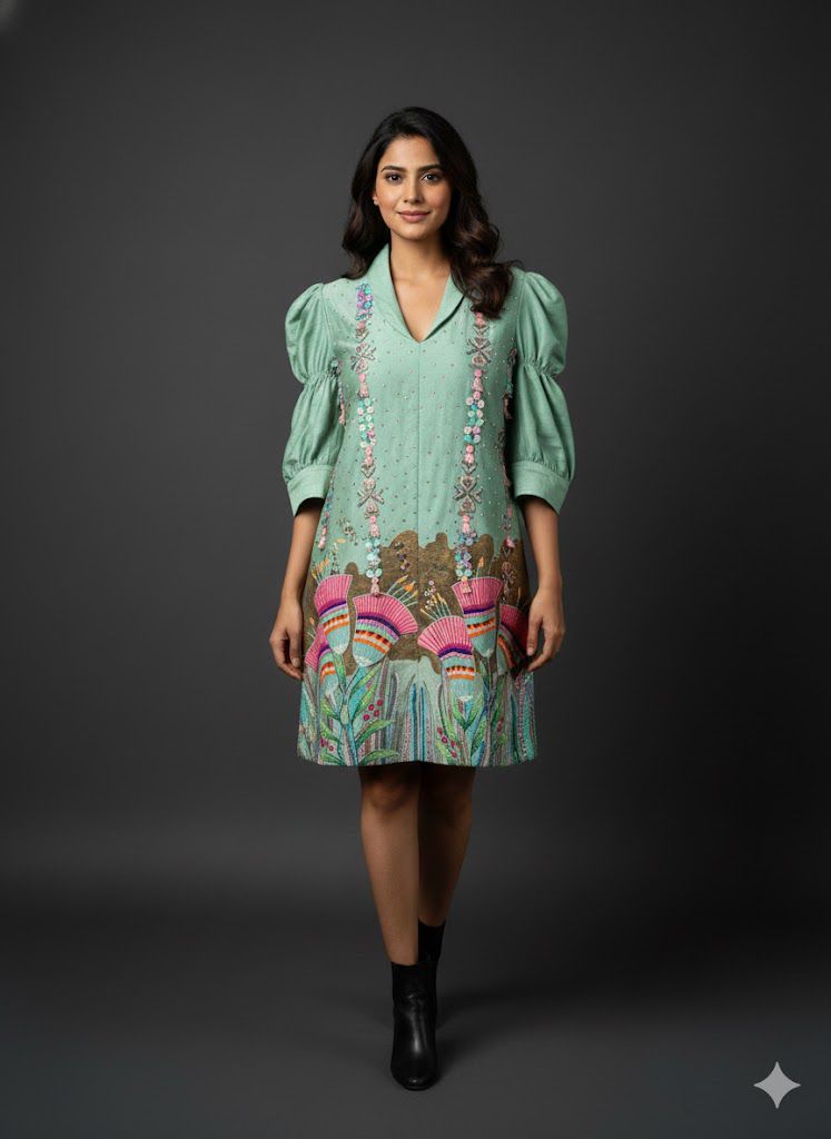 Hand-Embroidered Garden Scene Tunic Dress