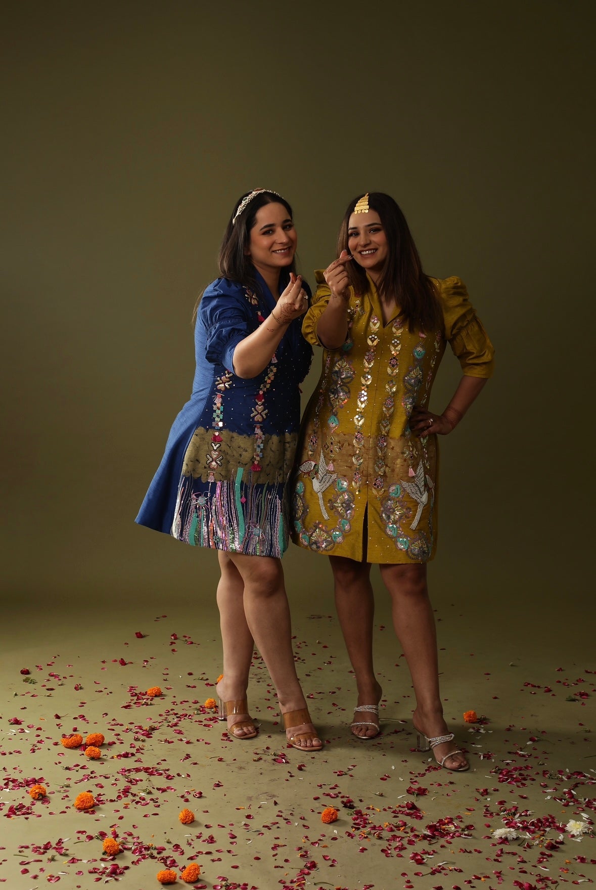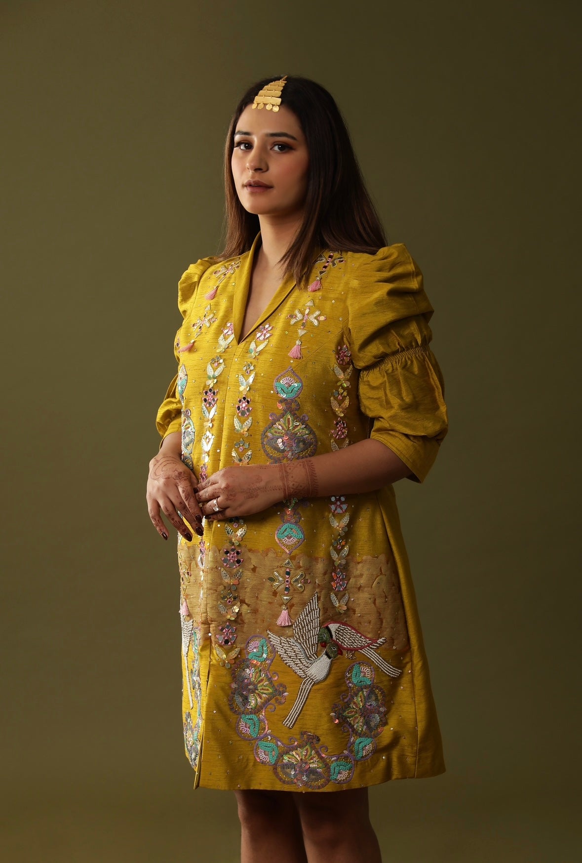 Description: The dress in the image is a mustard yellow dress adorned with intricate embroidery. The design features a combination of floral patterns and birds, which are likely achieved through embroidery techniques. The level of detail and the texture of the design suggest that it is embroidered rather than hand-painted. The embroidery is colorful and adds a decorative element to the overall appearance of the dress.