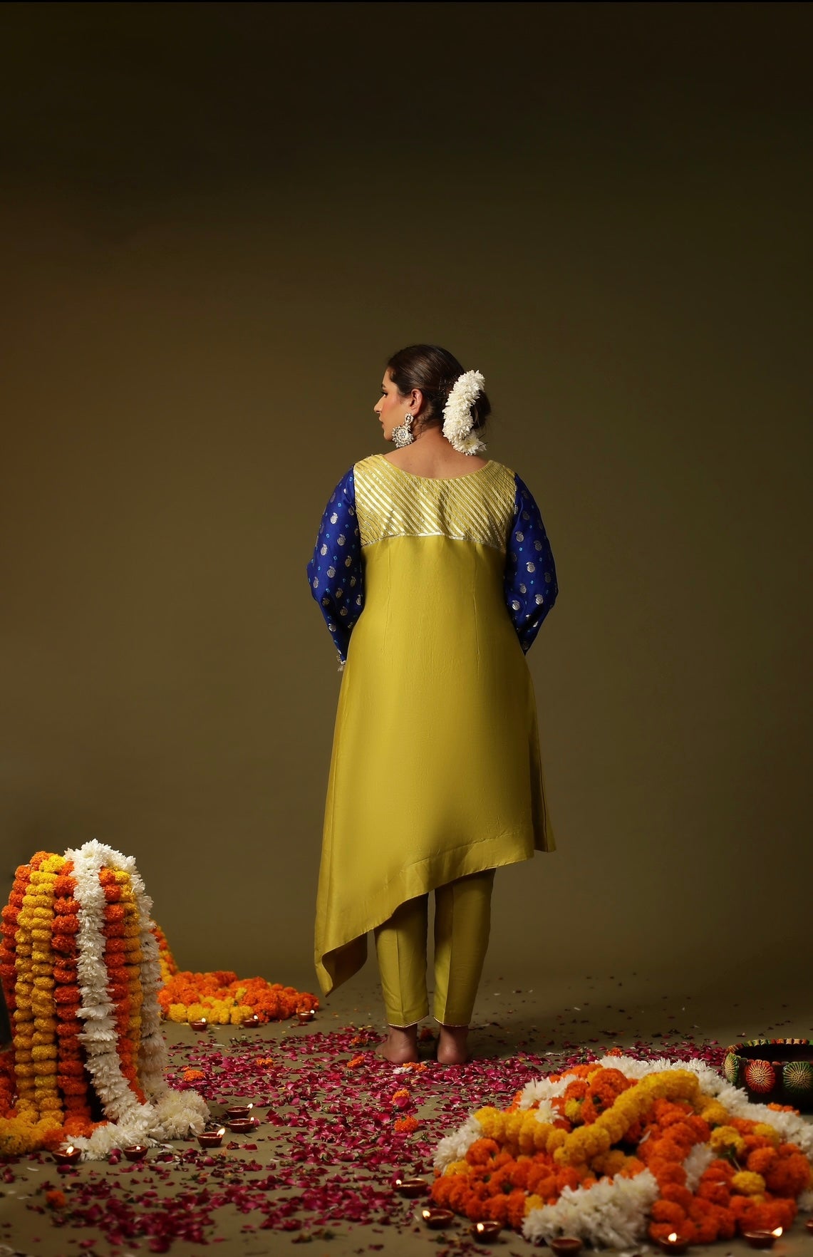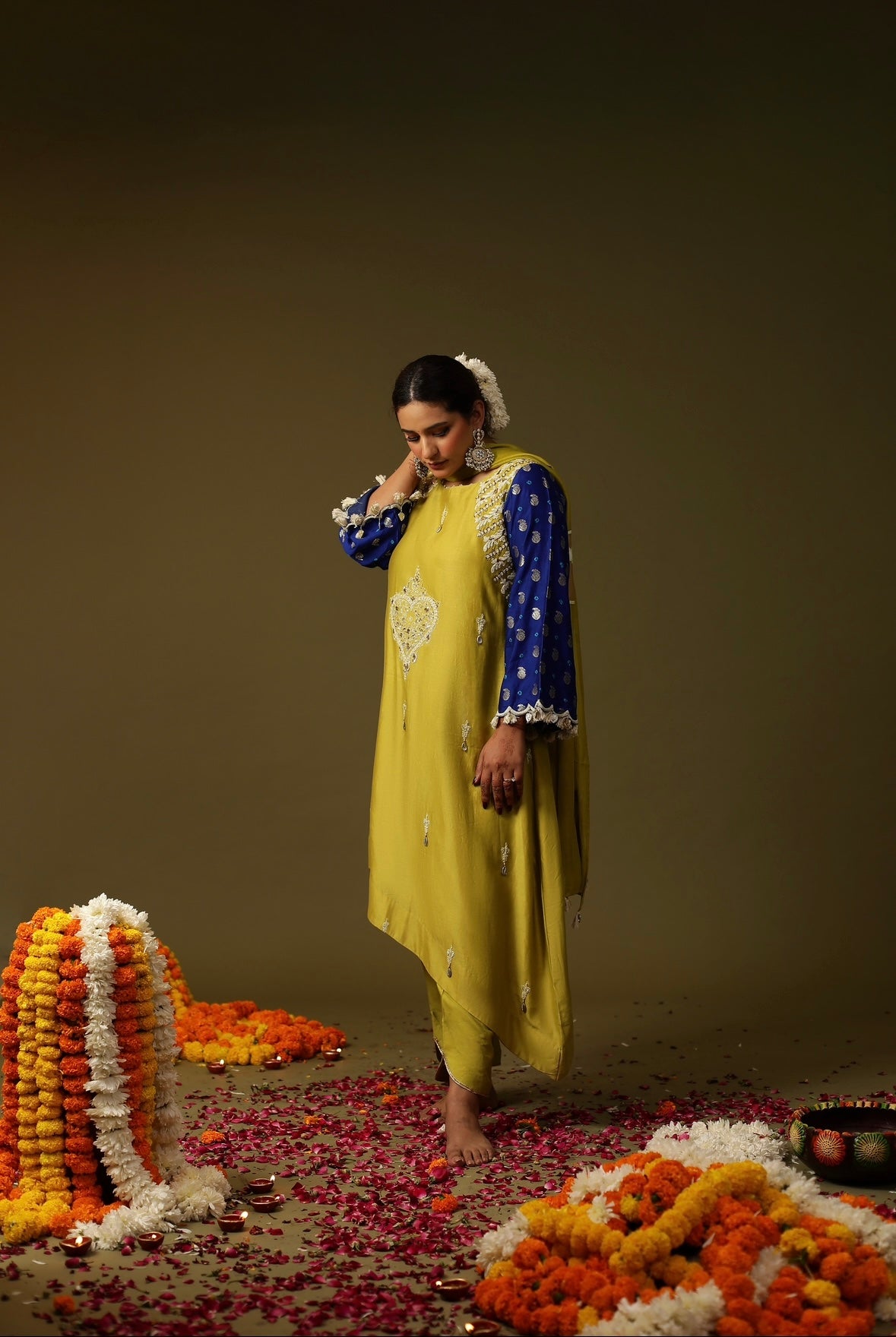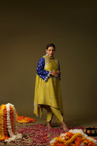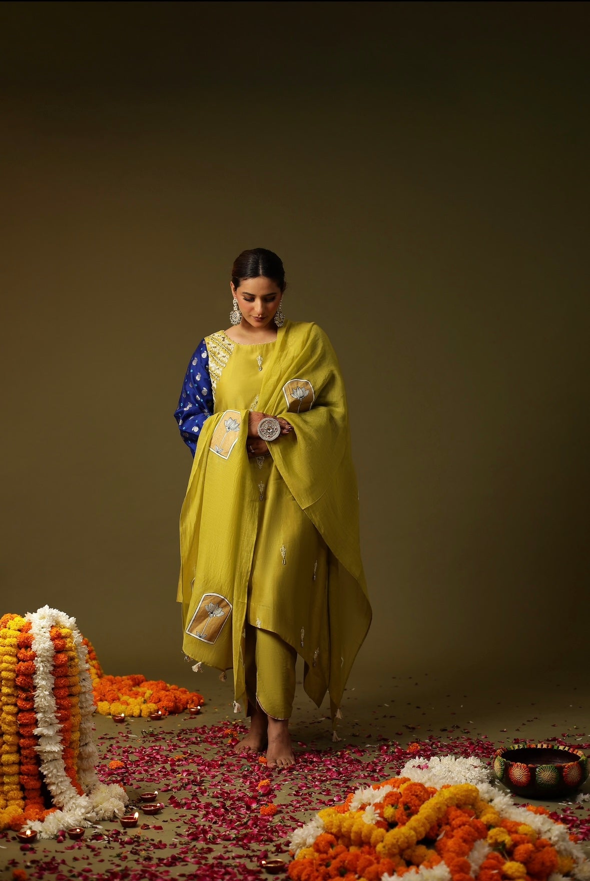 Description: This suit is totally beautiful stunning. The woman in the pic is rocking a yellow salwar kameez with some super intricate handpainted embroidery details. The kameez is yellow with white embroidery, and the sleeves are blue self canderi fabric and matching yellow pants. Adorn yourself in the vibrant charm of this Mustard Yellow Sakhi Suit Set, a masterpiece of traditional. The suit boasts intricate golden painting and delicate sequence embroidery, forming heart motifs that exude love and beauty. The whole outfit's lookingsuper traditional yet chic, perfect for some festive vibes.