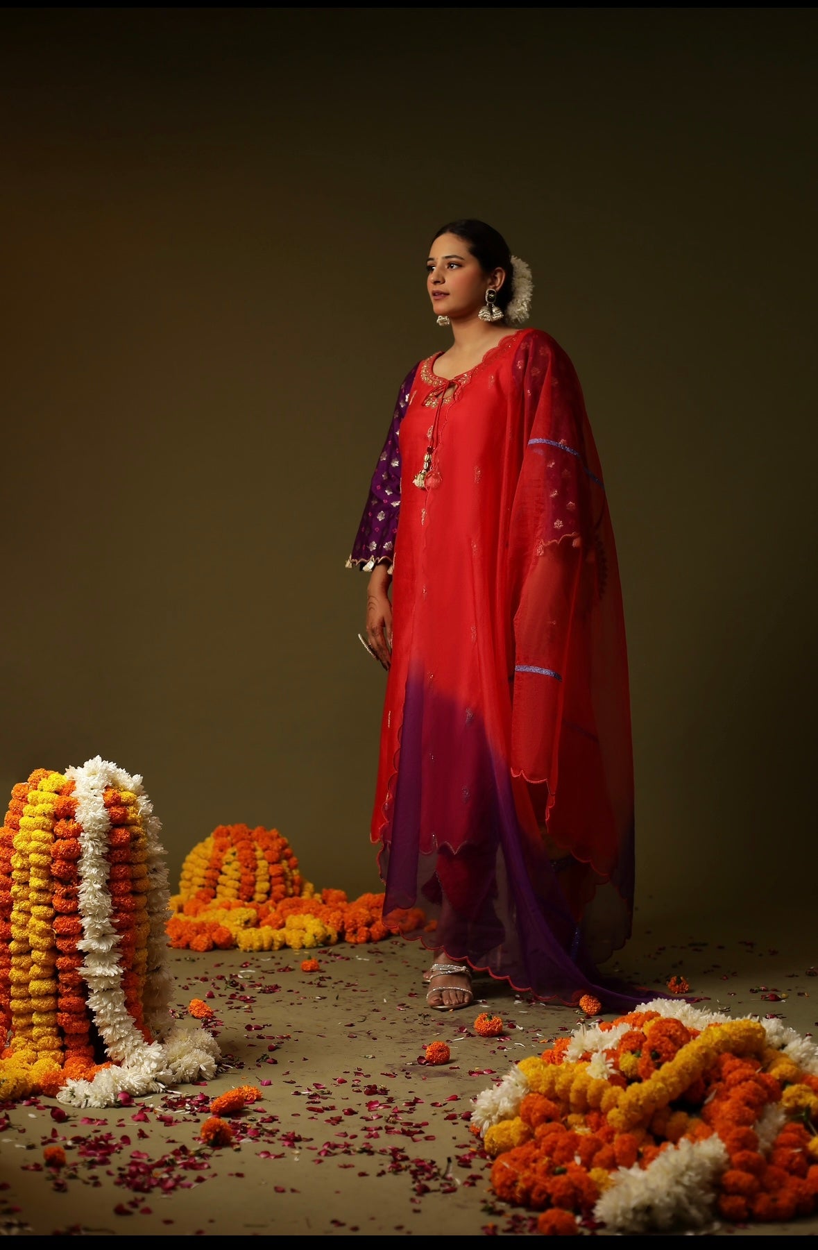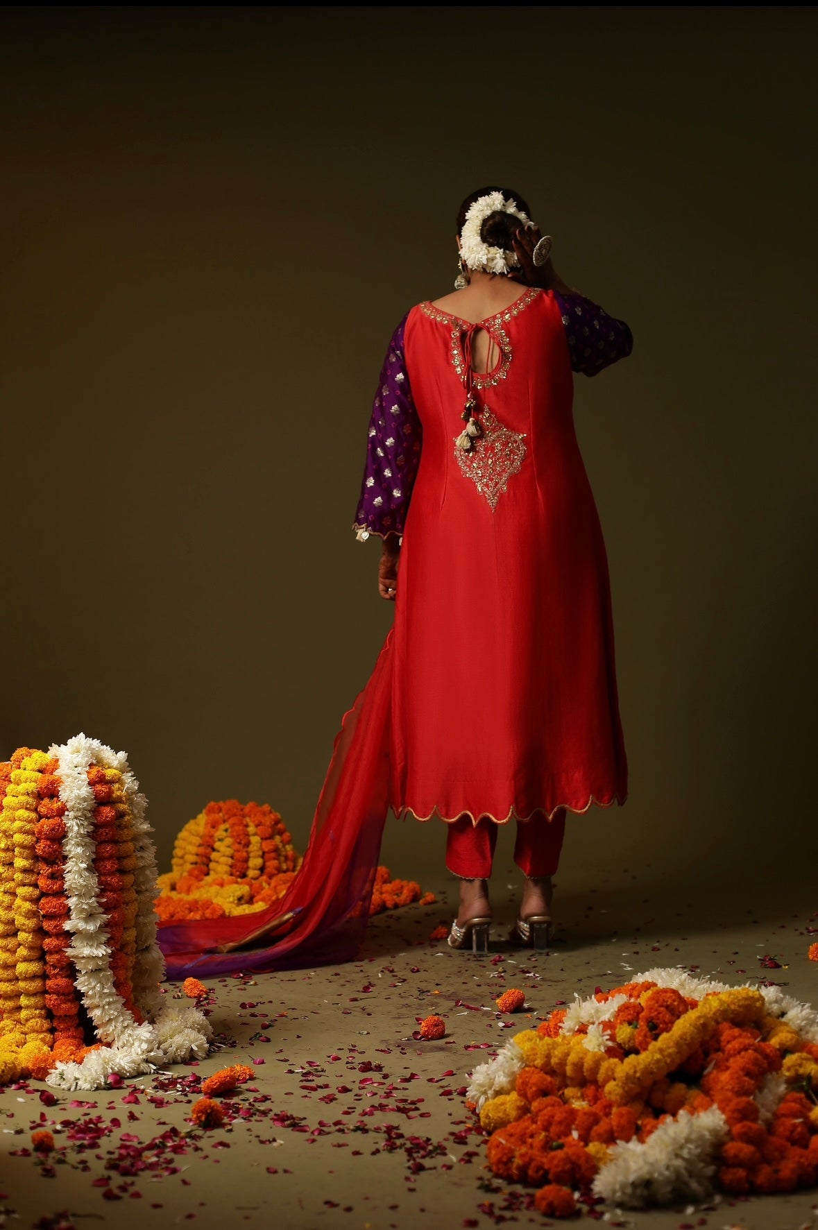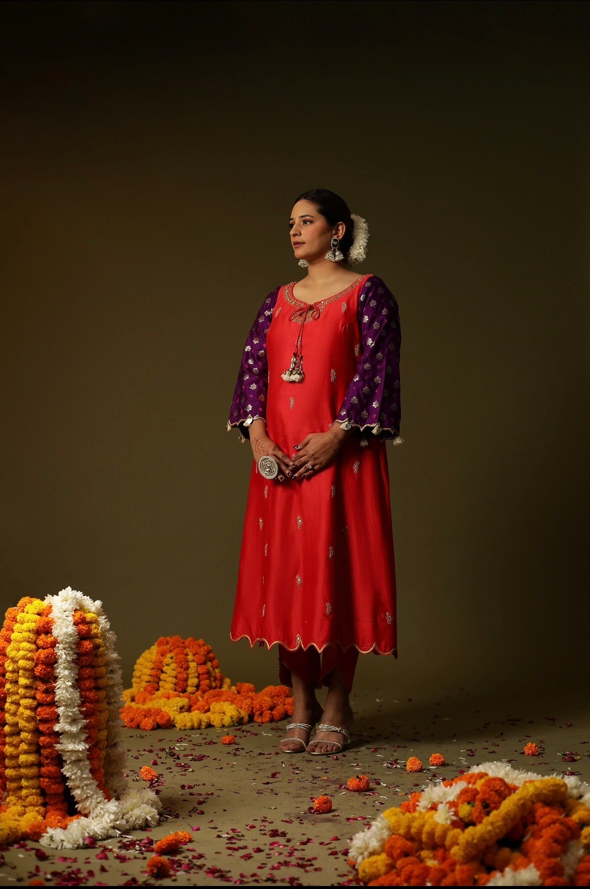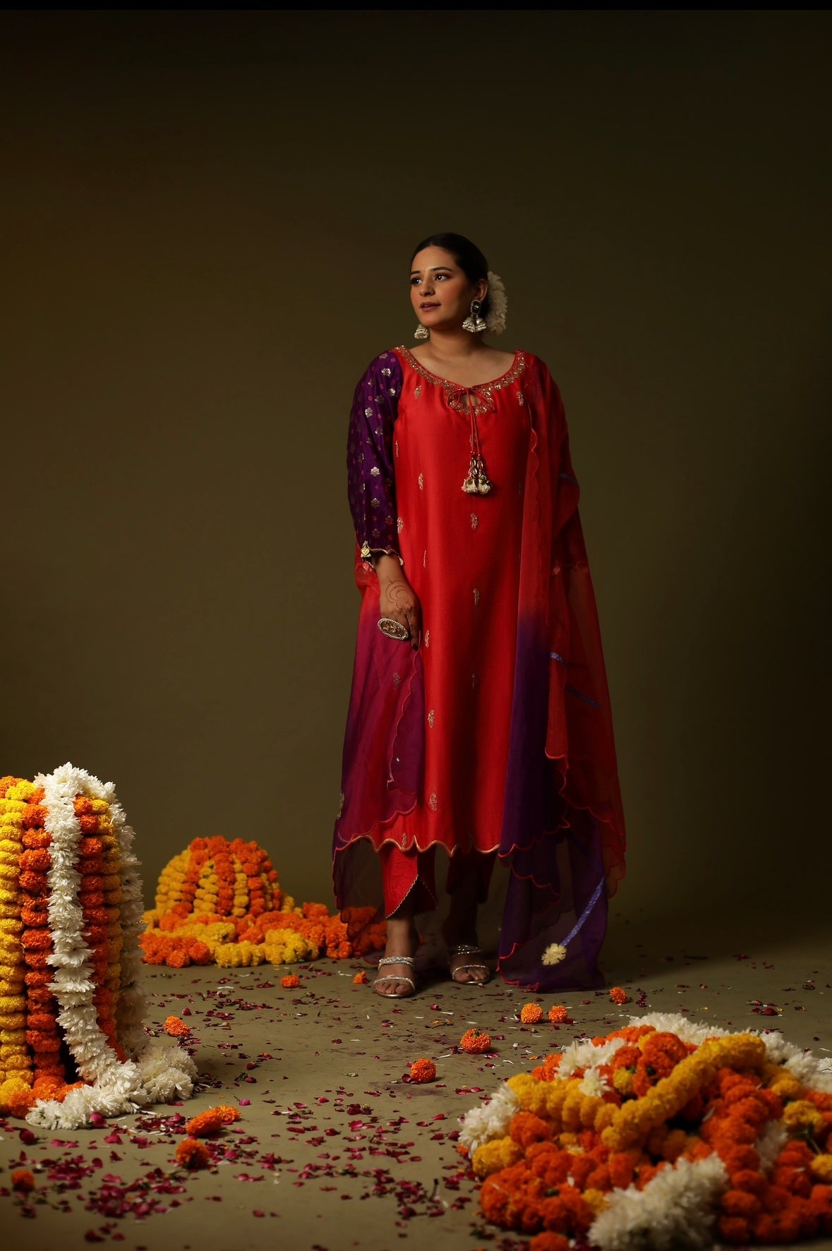 Description: This is a stunning red embroidery suit set. The suit has a red kurti with intricate gold embroidery around the neckline and scattered gold embellishments on the front. The sleeves are purple with small gold patterns. The kurta is primarily red with purple sleeves and a matching dupatta. The kurta features intricate embroidery or possibly hand-painted designs, including a decorative neckline and tassels hanging from the neckline. The overall suggests that the suit is adorned with embroidery rather than being hand-painted, as the patterns and designs is more structured and detailed,it is a embroidery work.