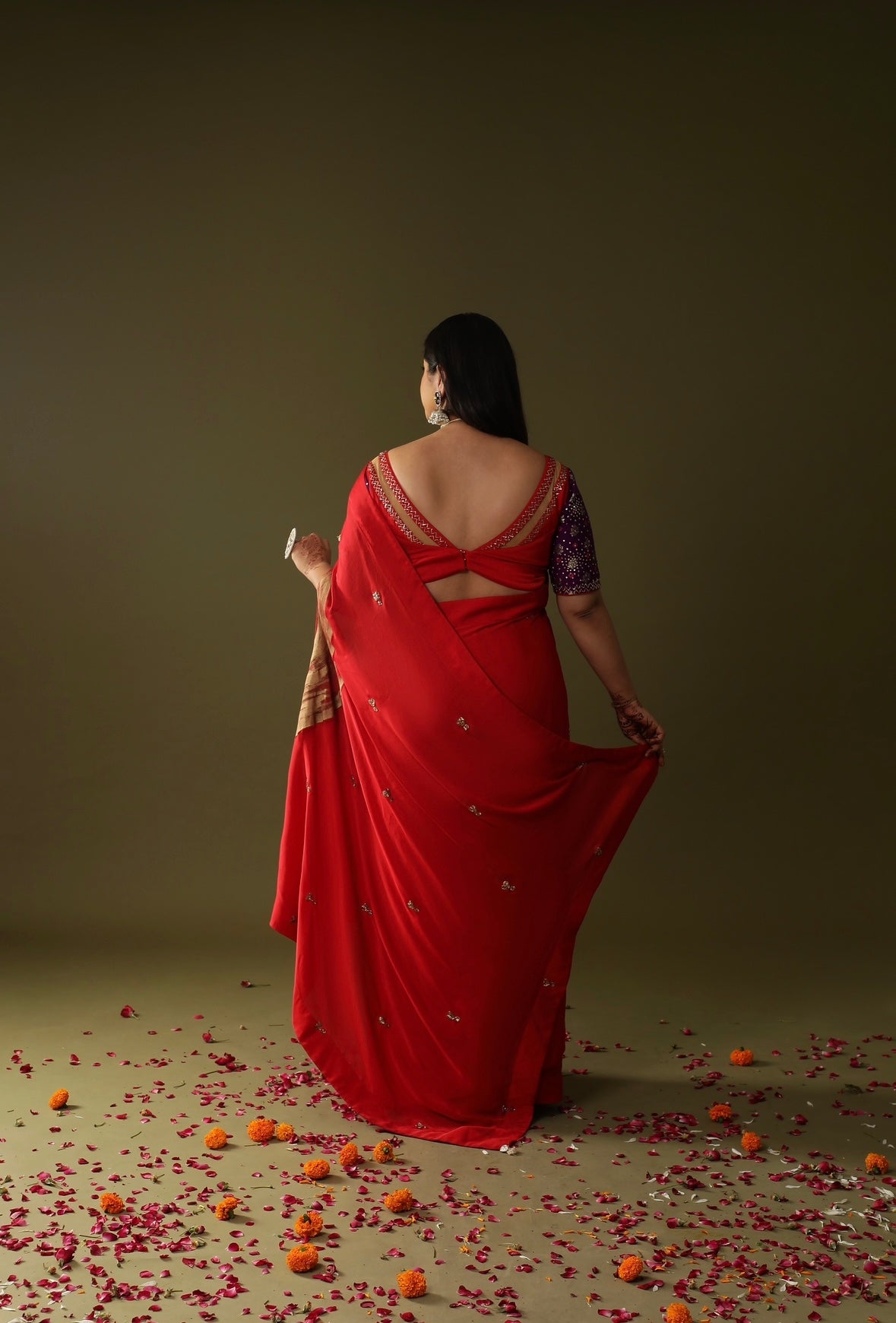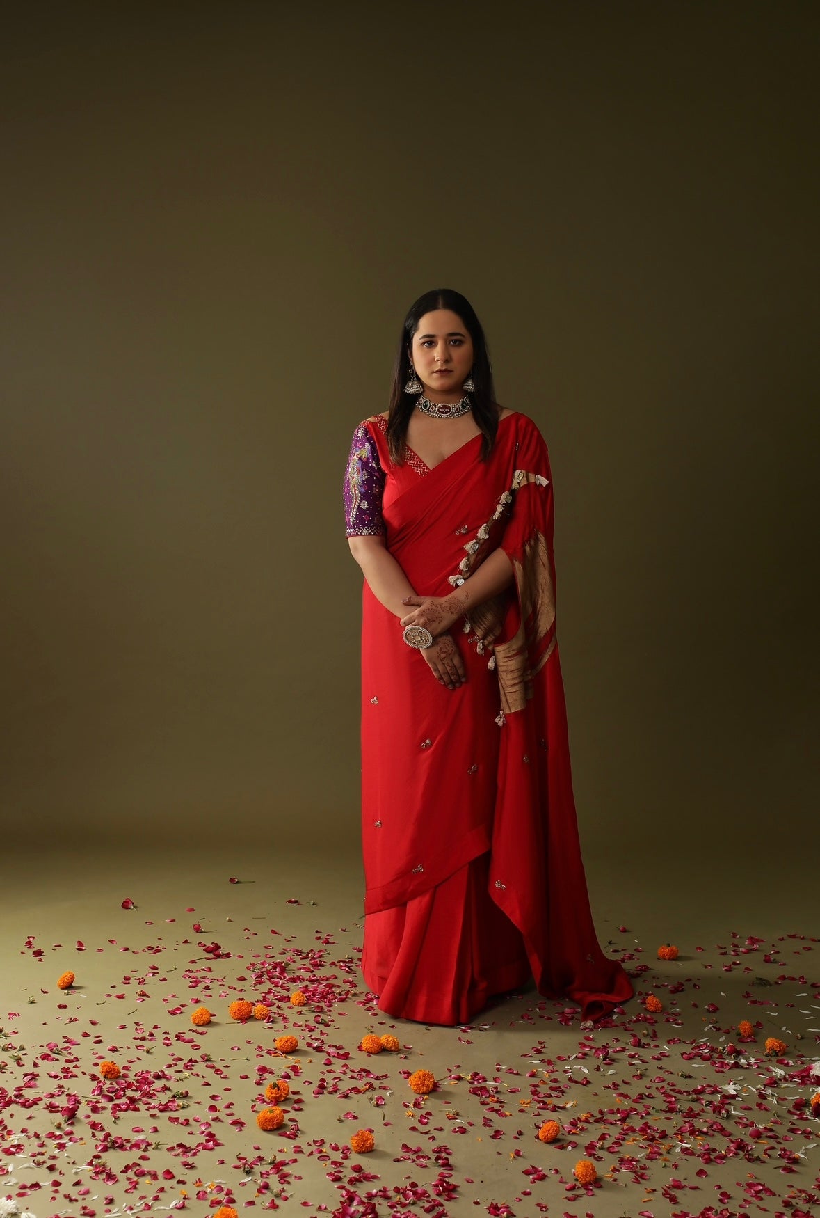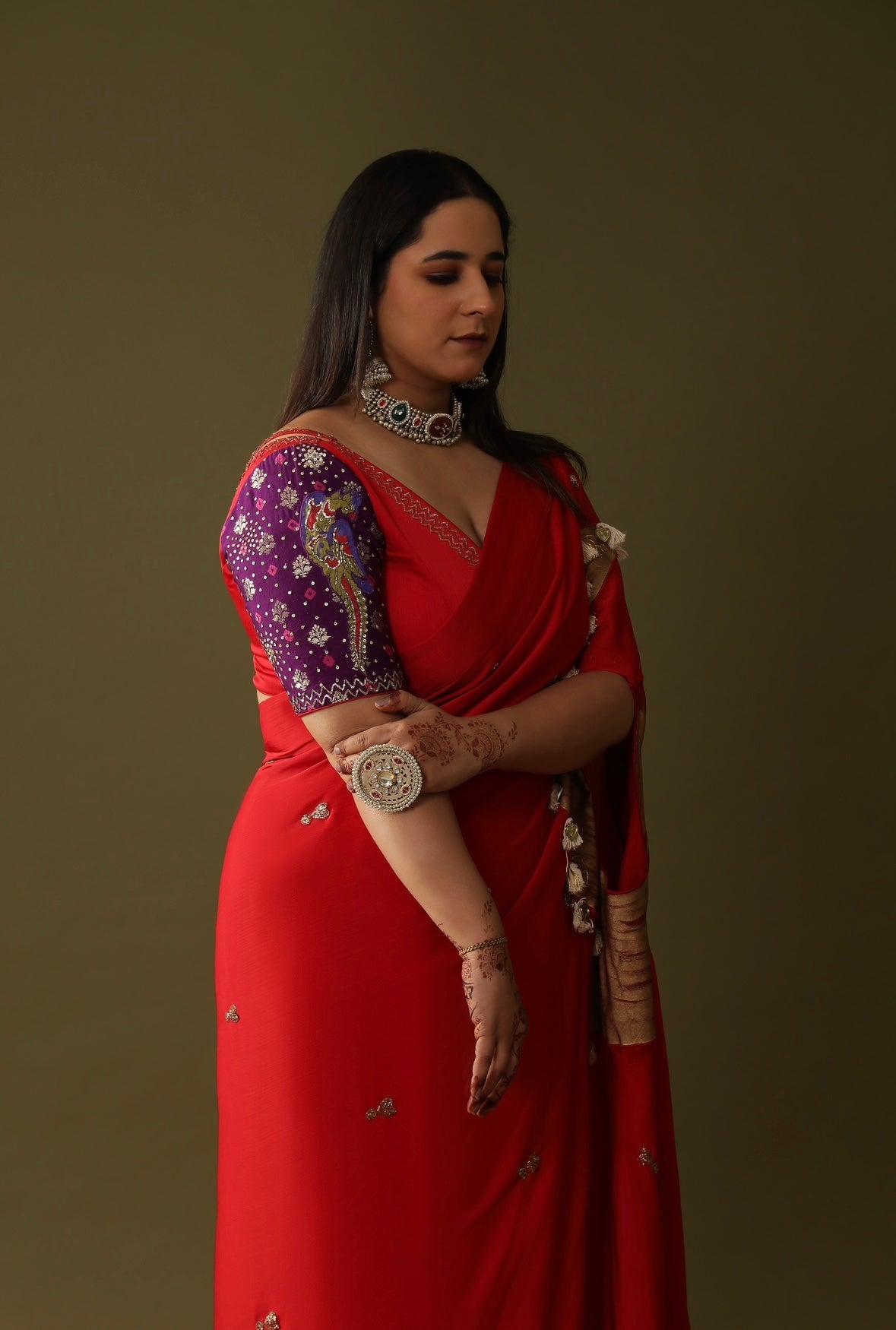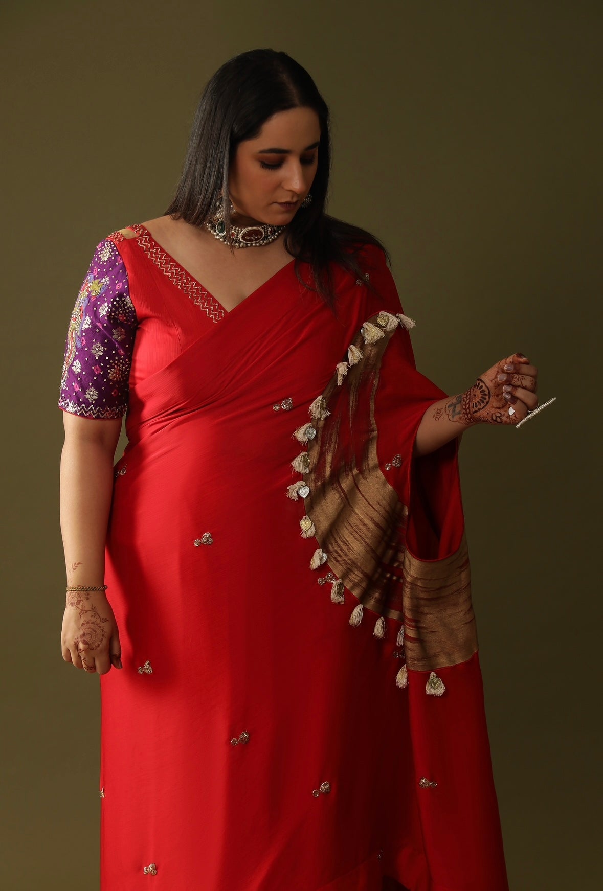 Description: This red hand-painted and embroidered saree with tassel detailing and a purple sleeved blouse. The saree is a pre-stitched drape saree is totally stunning,It's a handpainted embroidery ready-to-wear saree in a bold, gorgeous red colour. The saree's got some super intricate details like silver embroidery and tiny embellishments scattered all over. The blouse is a contrastin' purple with floral patterns, adding a dope touch to the overall look.