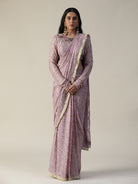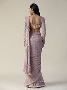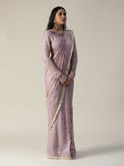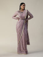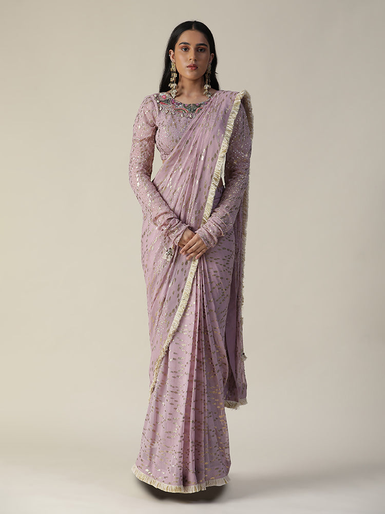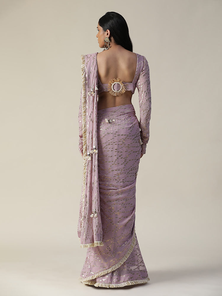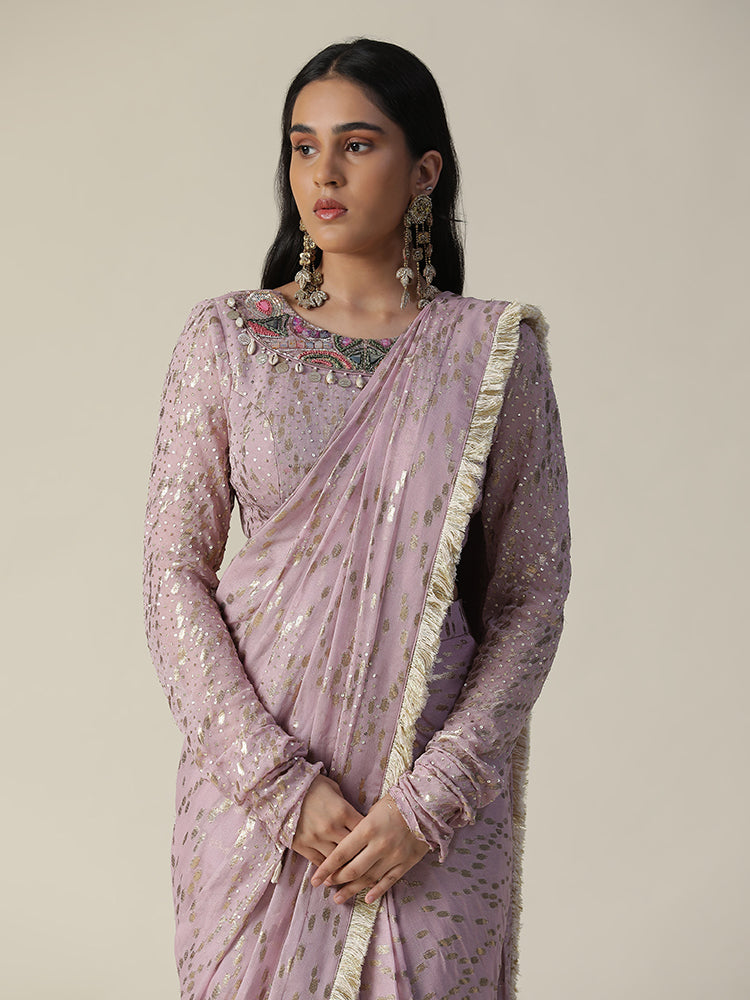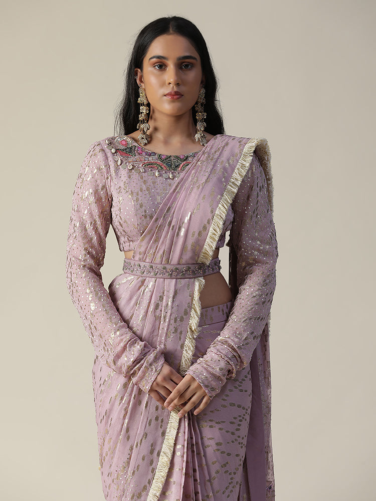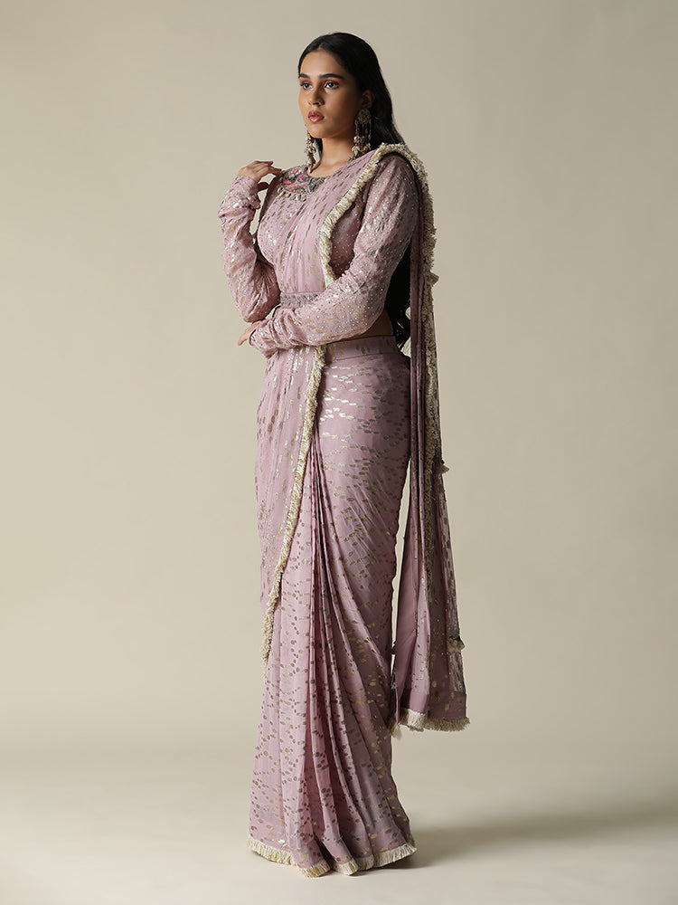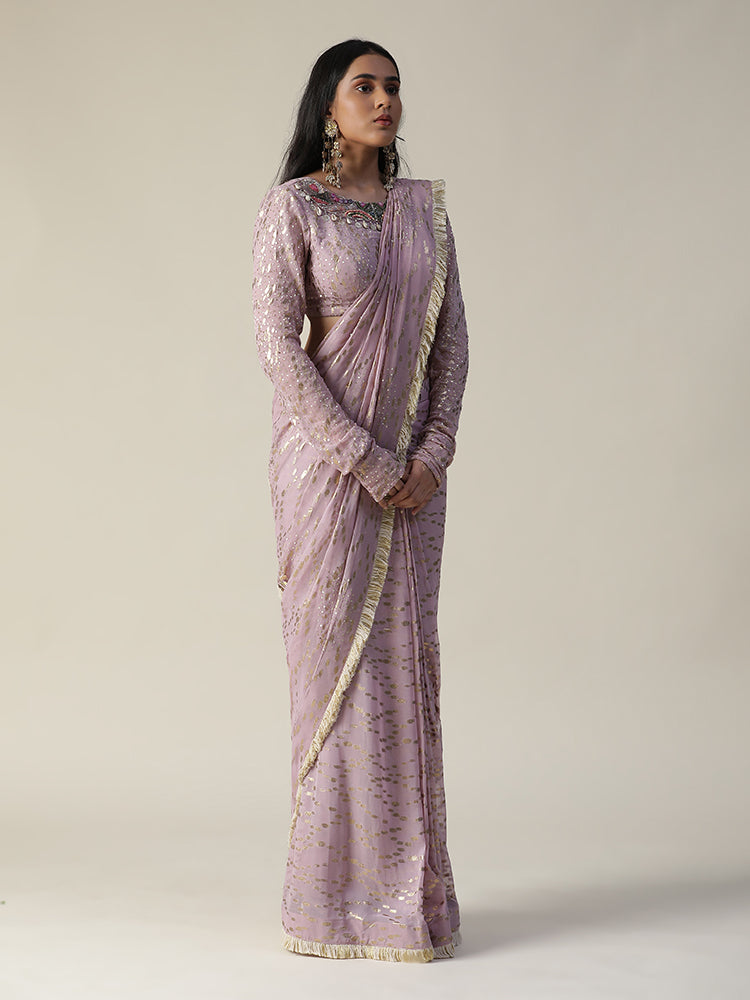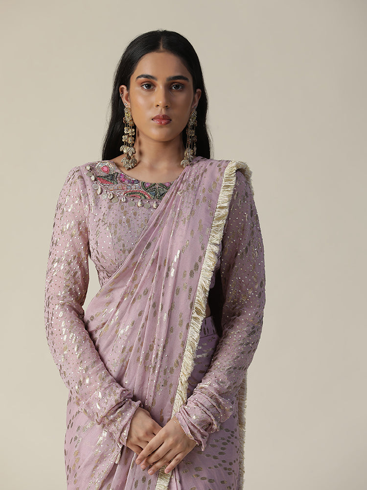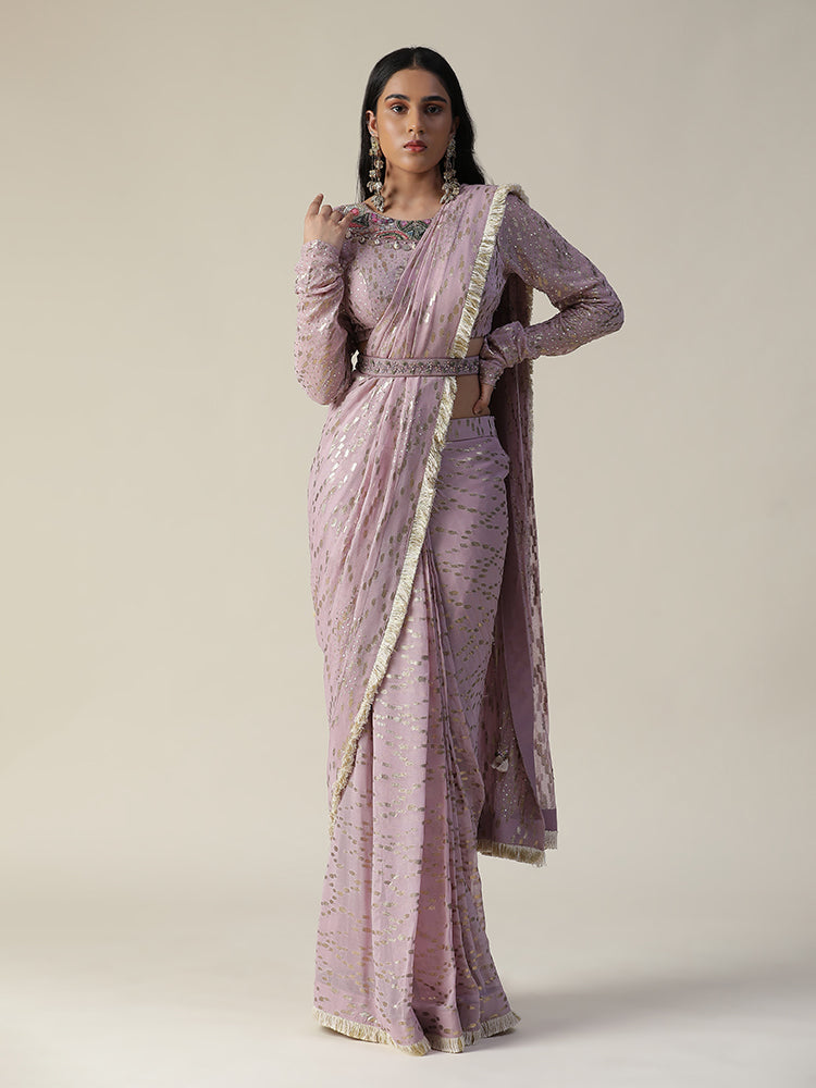 Description: Featuring our lilac pre-draped georgette saree. Comes with sleeve blouse with cut-dana work at neck(boat neck).The ready-to-wear saree in the image is a light lavender or lilac-colored outfit. It has a saree draped in a traditional style with a matching long-sleeved blouse. The saree seems to have some embroidery or detailing on the border and possibly on the blouse neckline. The saree contemporary take on traditional wear, suitable for formal or semi-formal occasions.