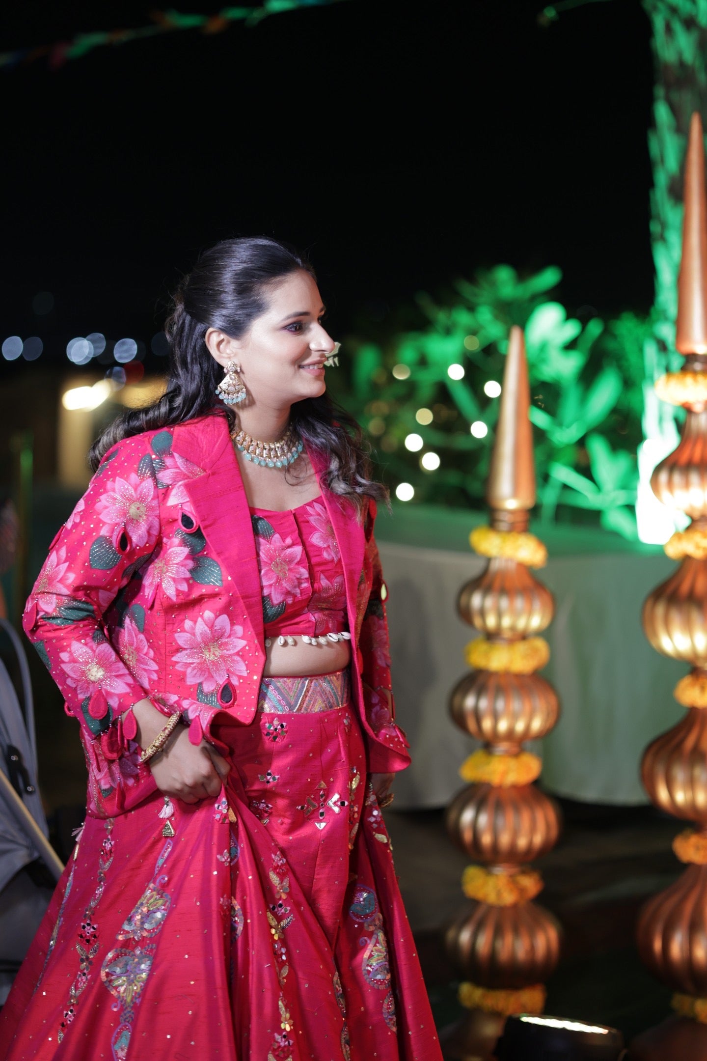 Description: WOW 😍! This lehenga set is totally stunnin'! πŸ’ƒ It's a handpainted embroidery lehenga set in a bold, vibrant pink hue. The outfit includes a matching pink lehenga with intricate floral embroidery and sparkly details. There's a cropped top that complements the lehenga perfectly. And to top it off, a floral-patterned jacket in the same pink shade adds a chic, modern twist to the traditional look,