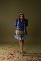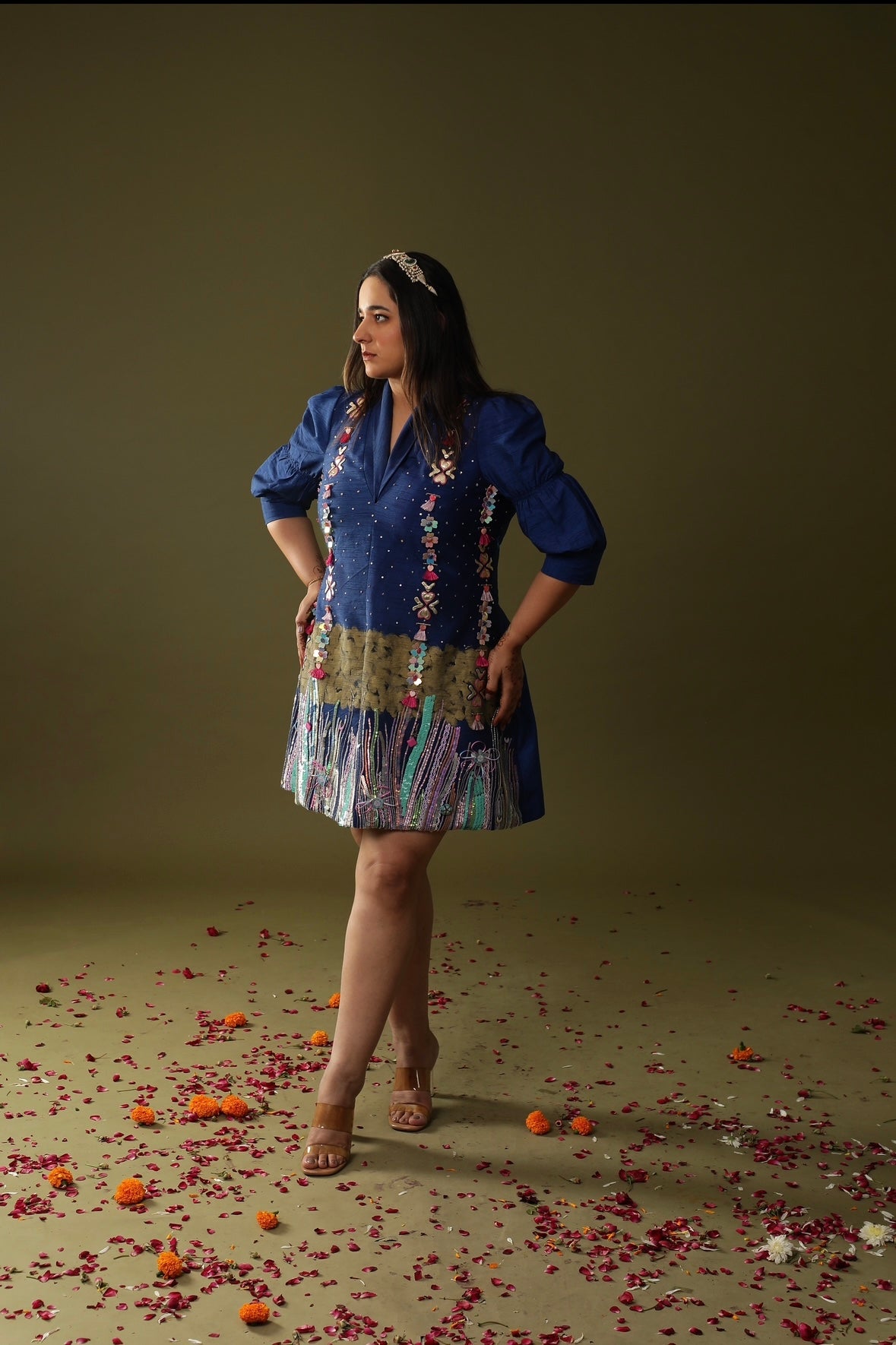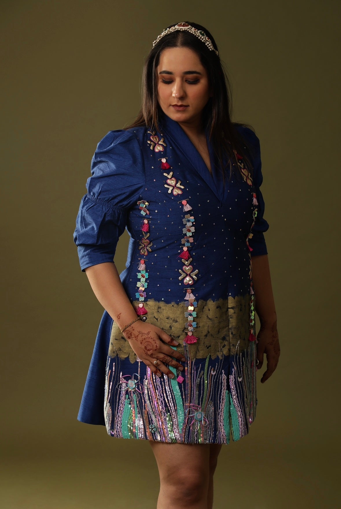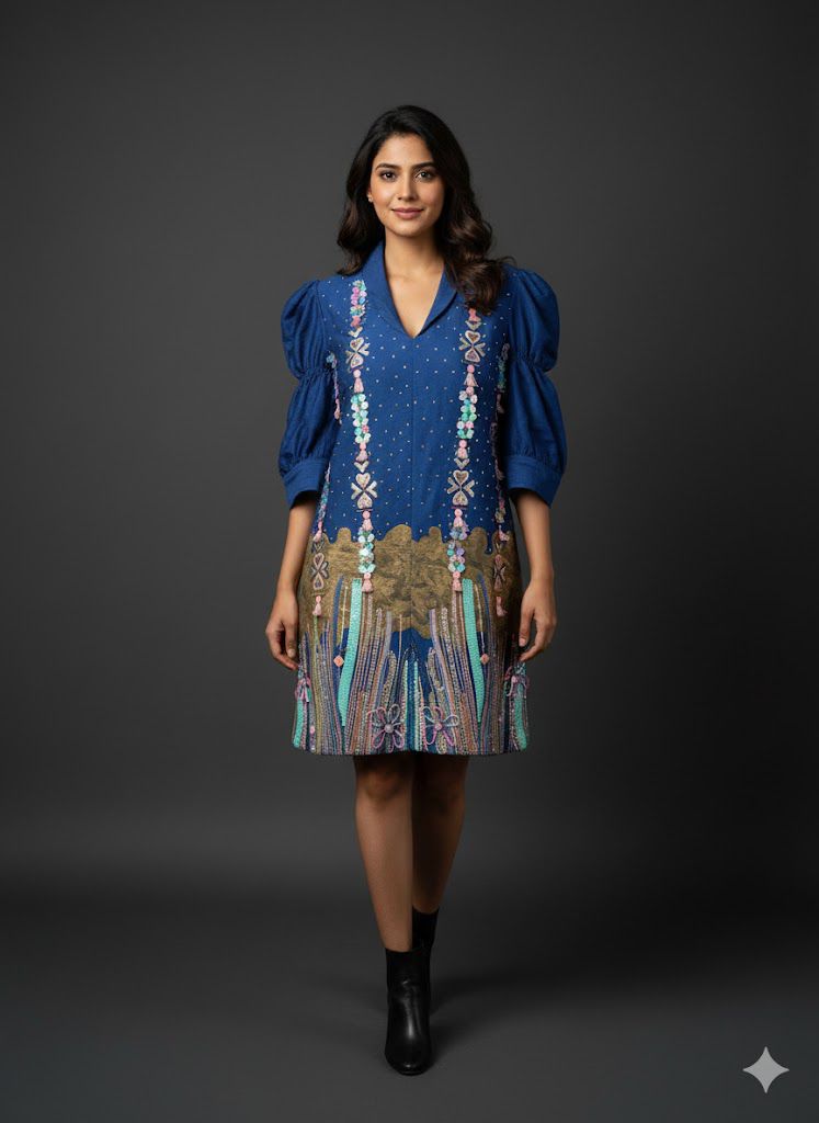 Description: The dress in the image is an electric blue, hand-painted or embroidered dress. The dress features a vibrant blue hue with intricate designs and patterns, likely created through hand-painting or embroidery techniques. The dress has a unique and eye-catching appearance, making it a standout piece.The use of hand-painting or embroidery techniques adds an extra layer of detail and cultural significance to the dress, making it a valuable and meaningful garment.