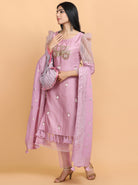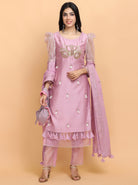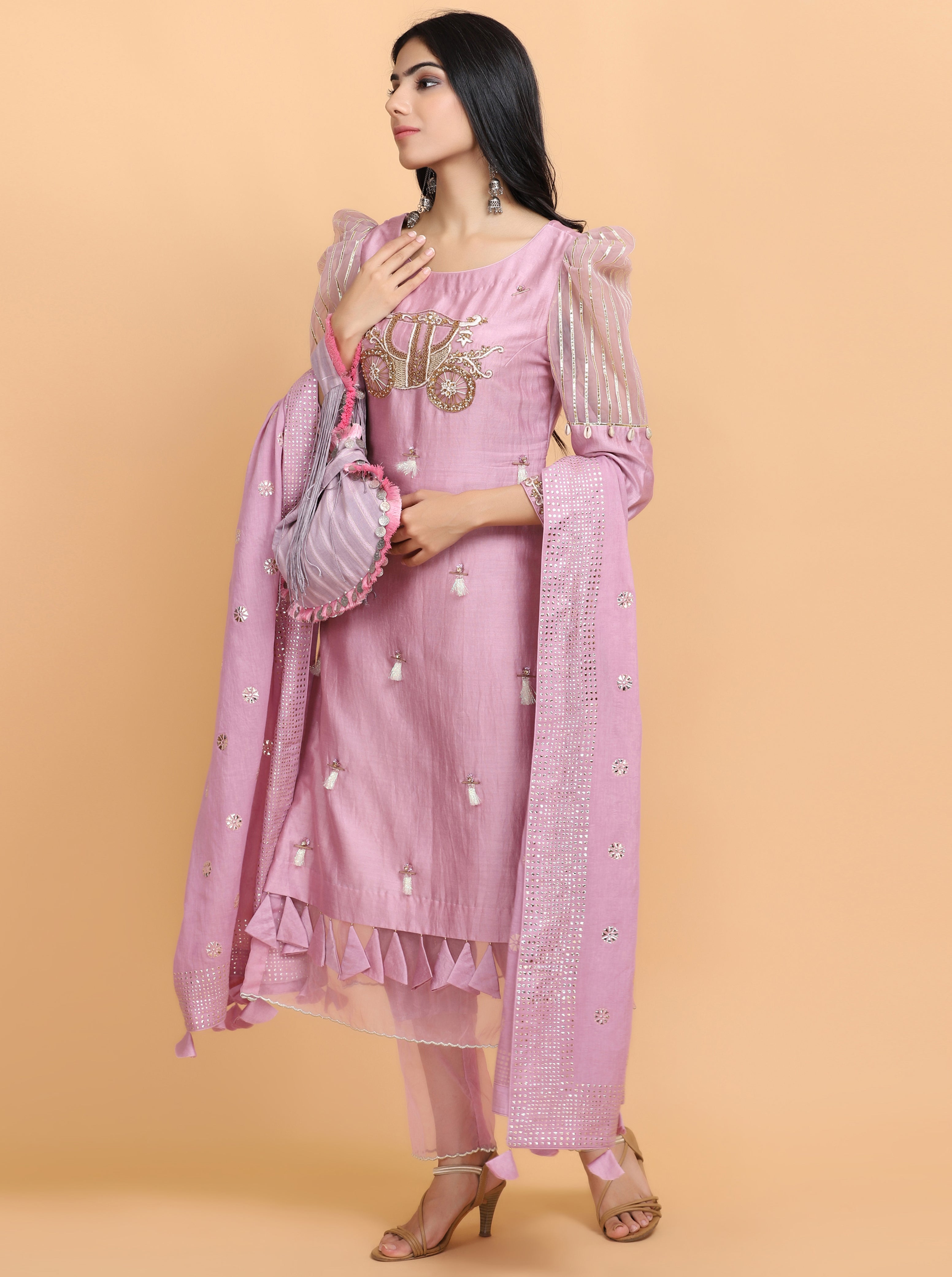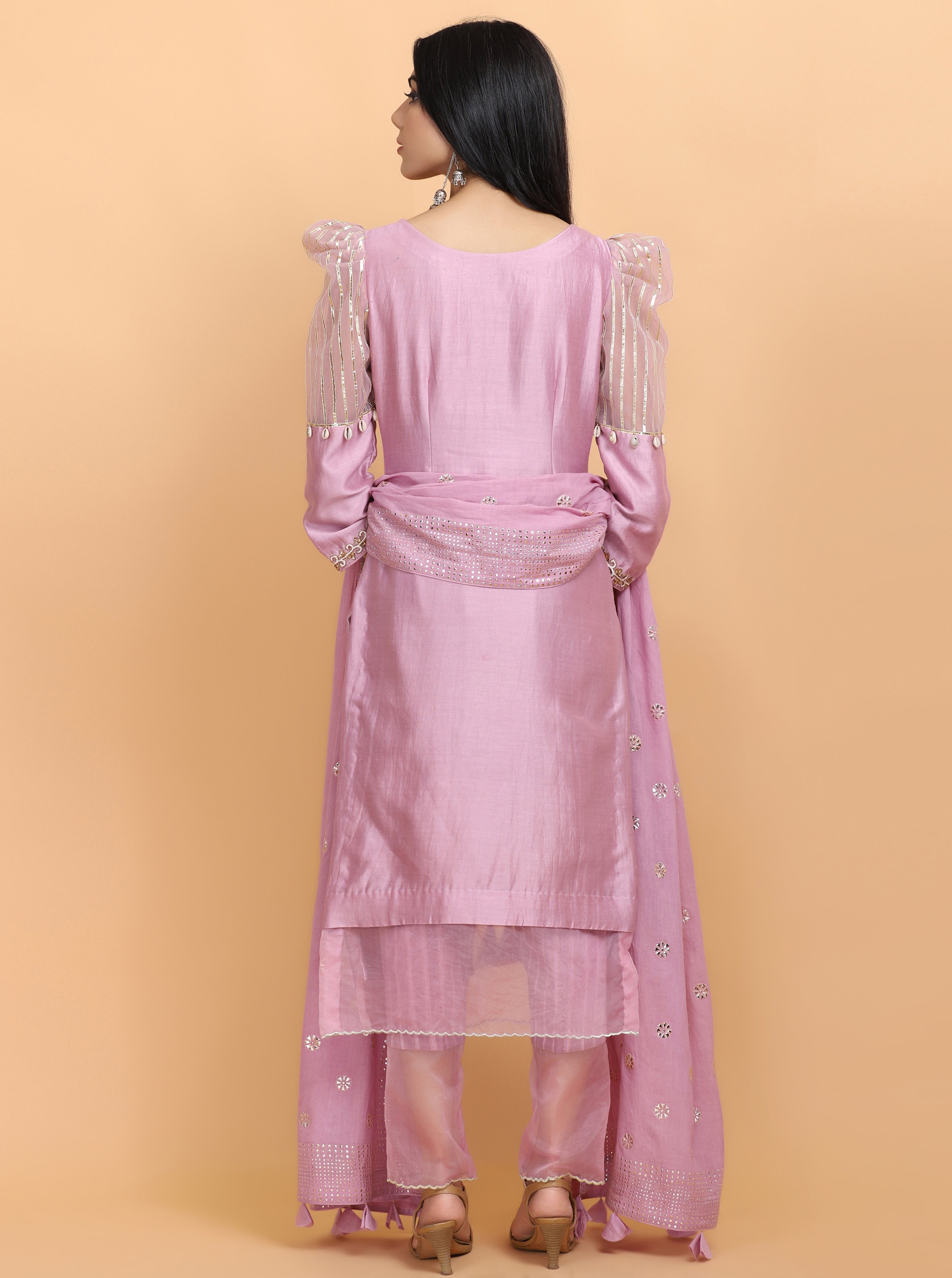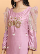Description: The image shows a woman wearing an lilac embroidered palki suit set. The suit is lilac with intricate silver embroidery on the front and sleeves, featuring tassels and other decorative elements. The long-sleeved kurta has a round neckline, and the matching palazzo pants are also orange. The overall design is elegant and sophisticated, suitable for formal occasions like weddings or festivals.