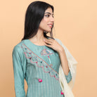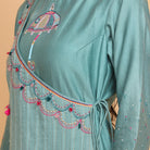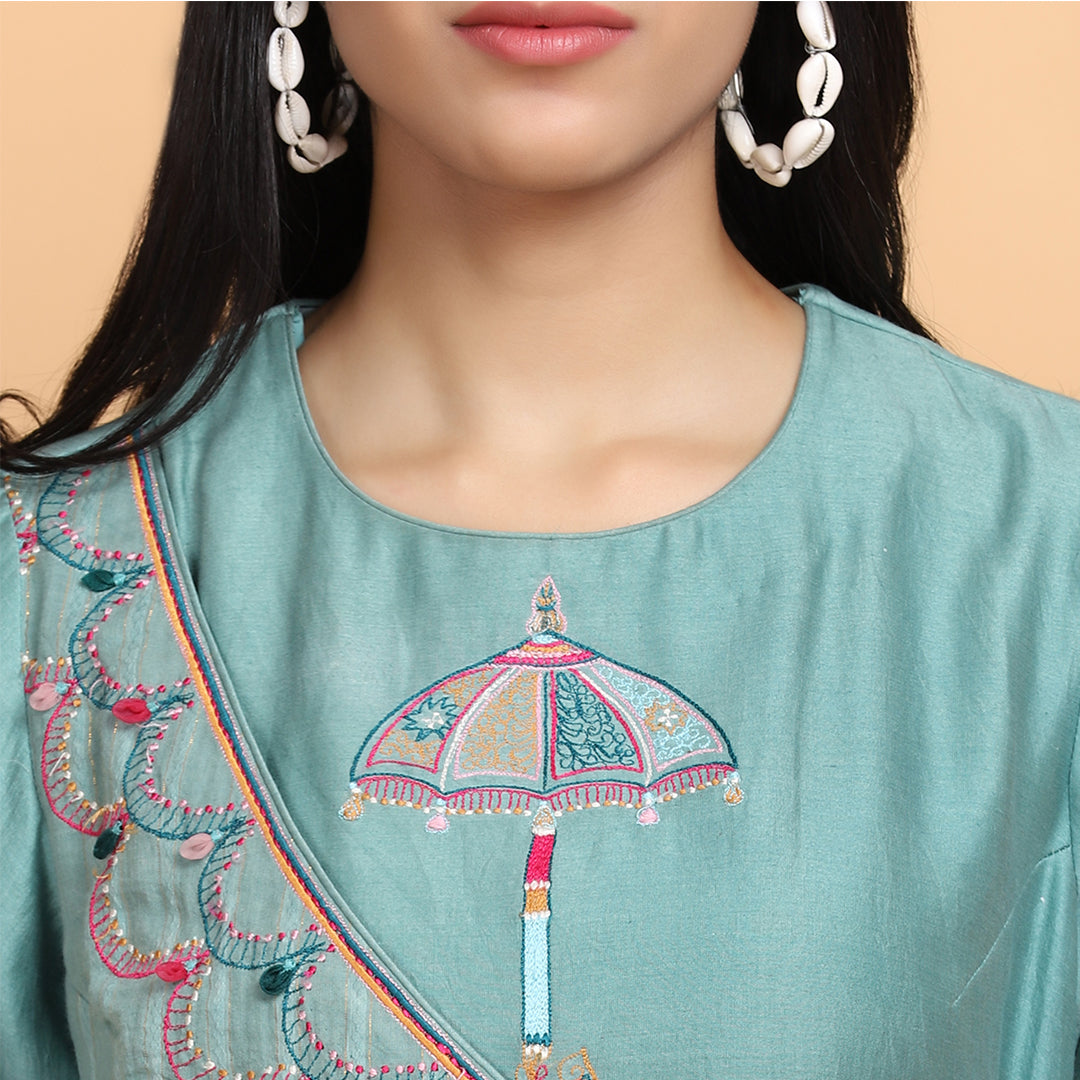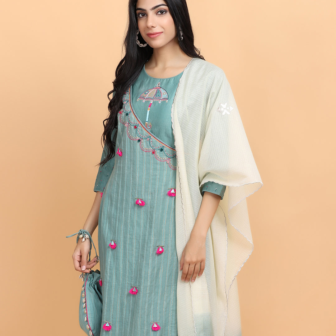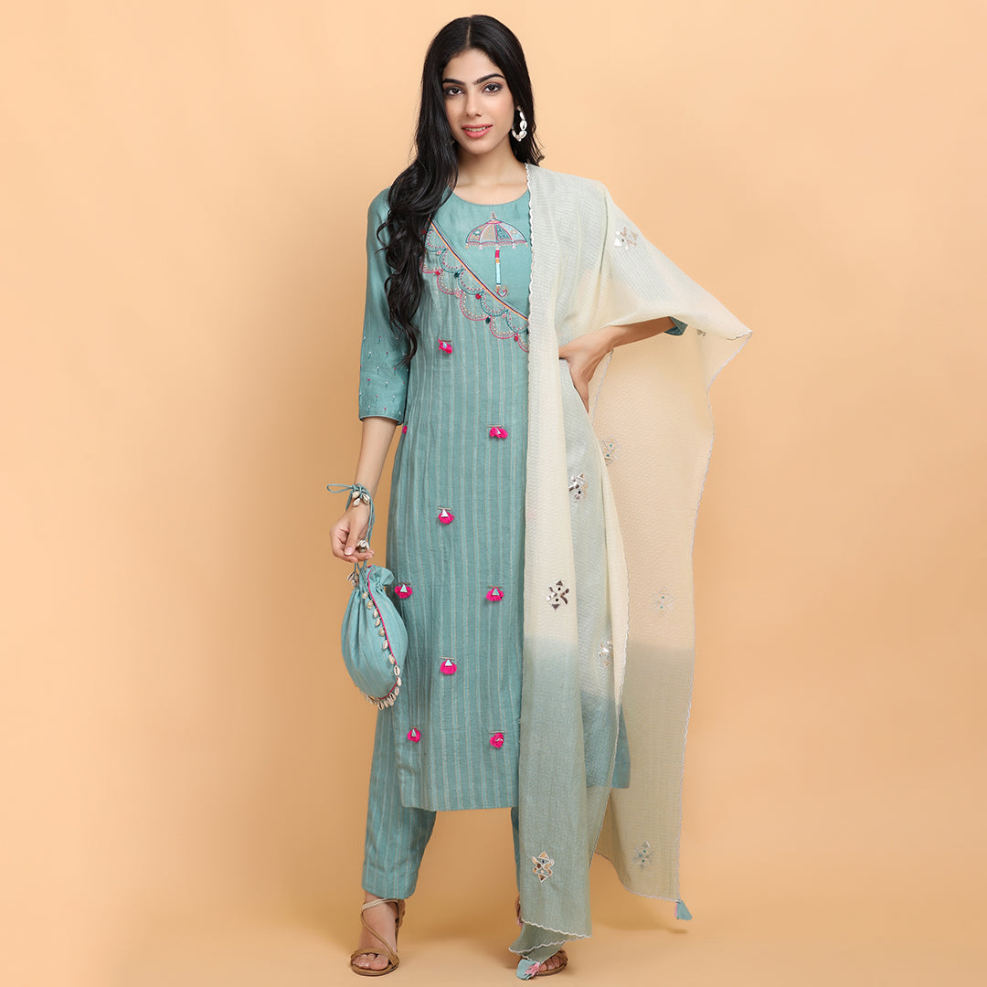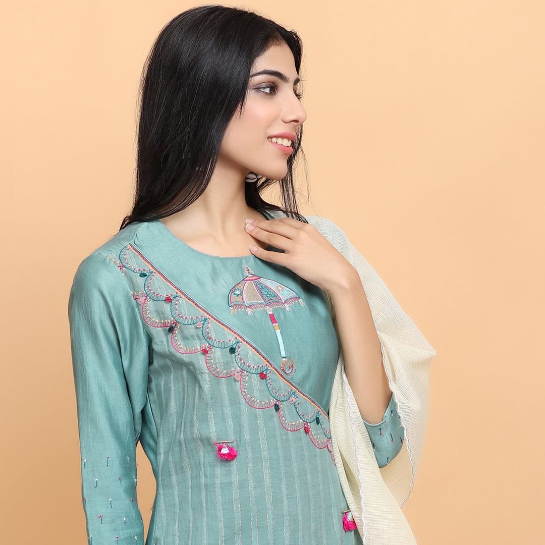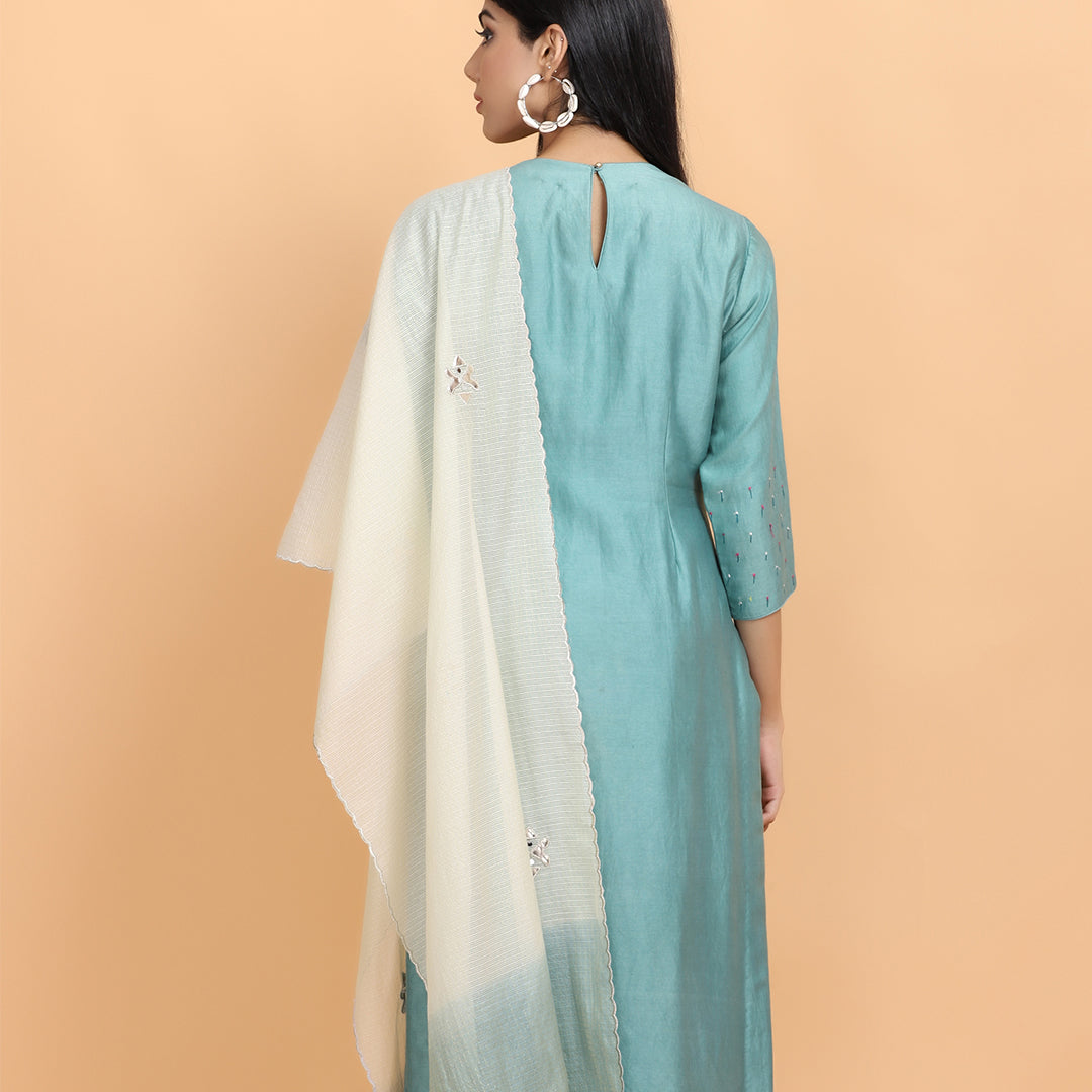 Blue kurta in chanderi silk with cotton pants and a kota dupatta.