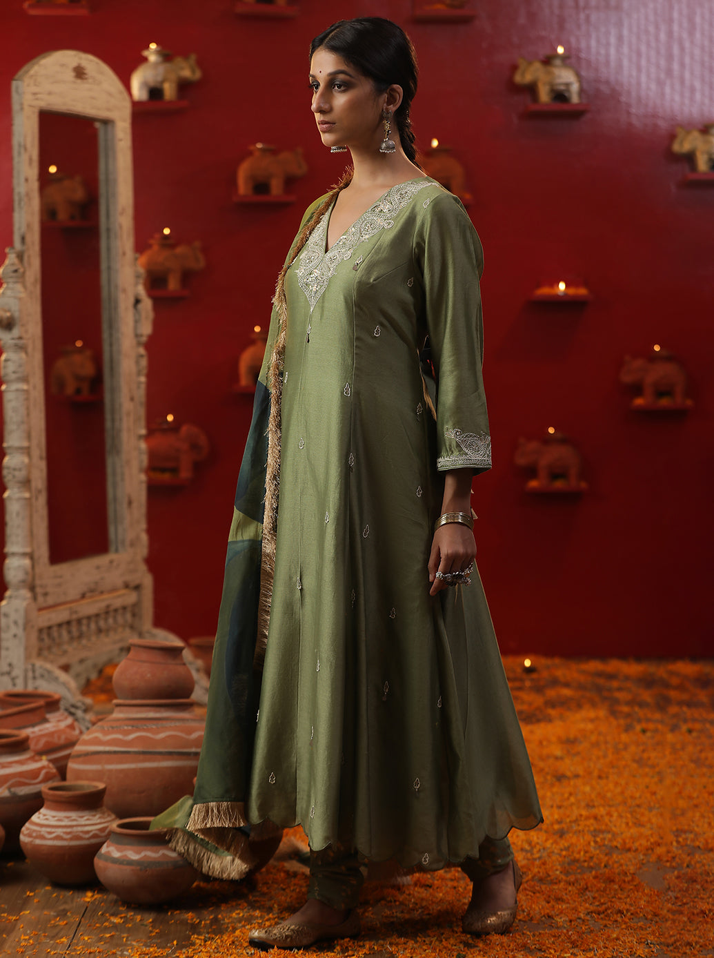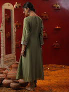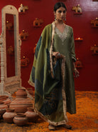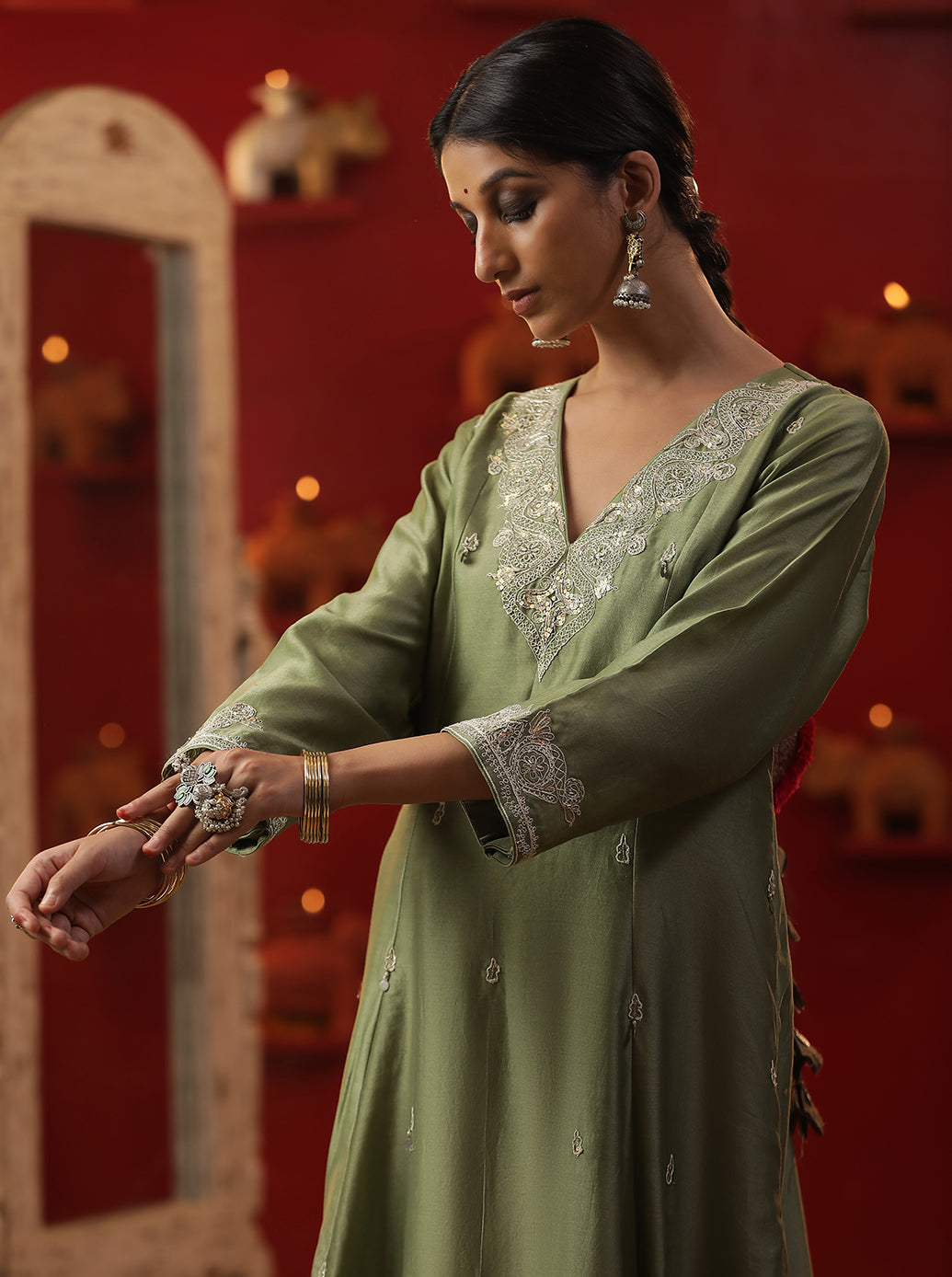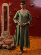 Description: Green Shringaar ras small v neck suit set.The image depicts a woman wearing a traditional Indian outfit, likely a salwar kameez, with intricate hand-painted embroidery. The suit is predominantly pista green in color and features a long tunic paired with matching trousers or duptta.Overall, the image showcases a beautiful example of traditional Indian fashion, highlighting the artistry and craftsmanship involved in creating such exquisite garments.
