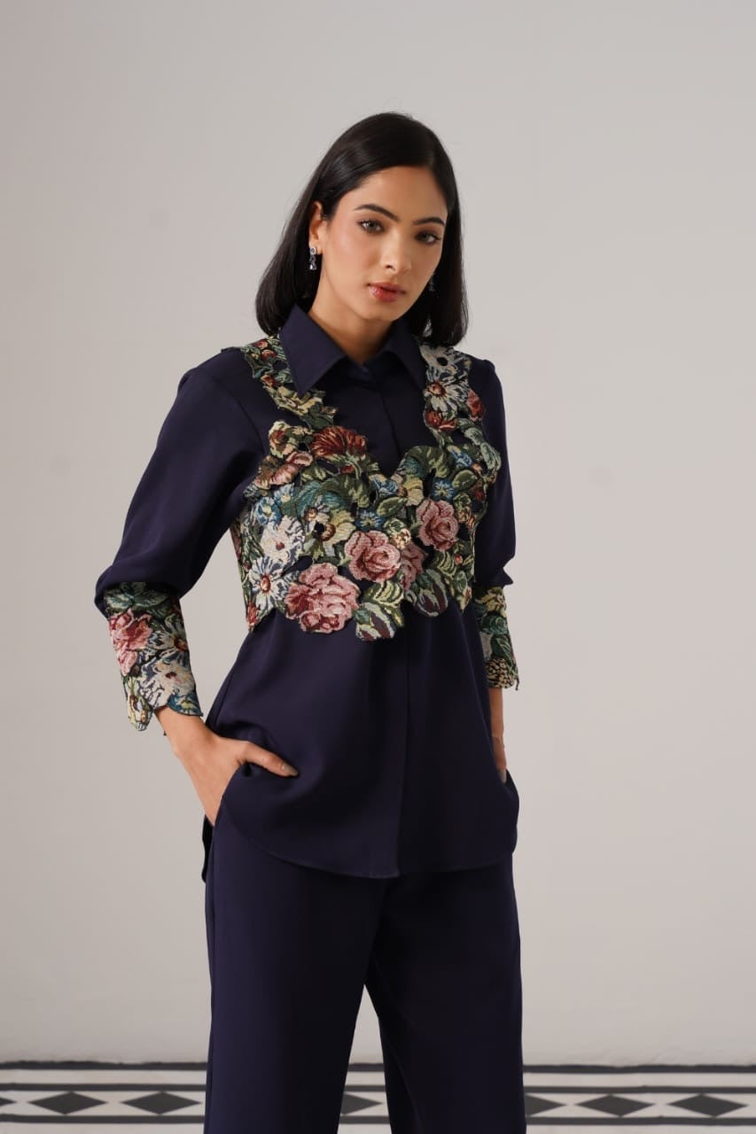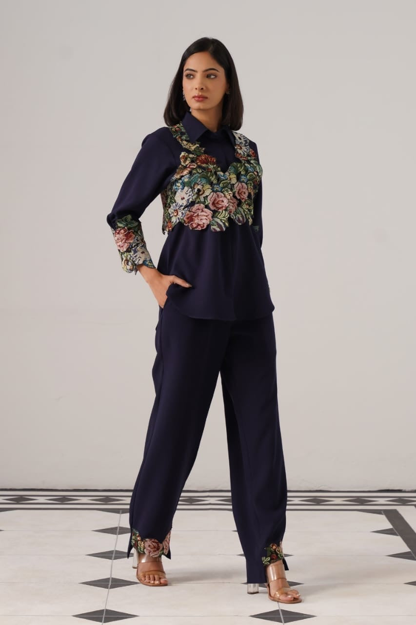 Navy coord set with flower embroidery patches on the cuffs comes with a floral sleeveless jacket paired with high low pants from the bottom with floral patchwork on the front of the pants.
