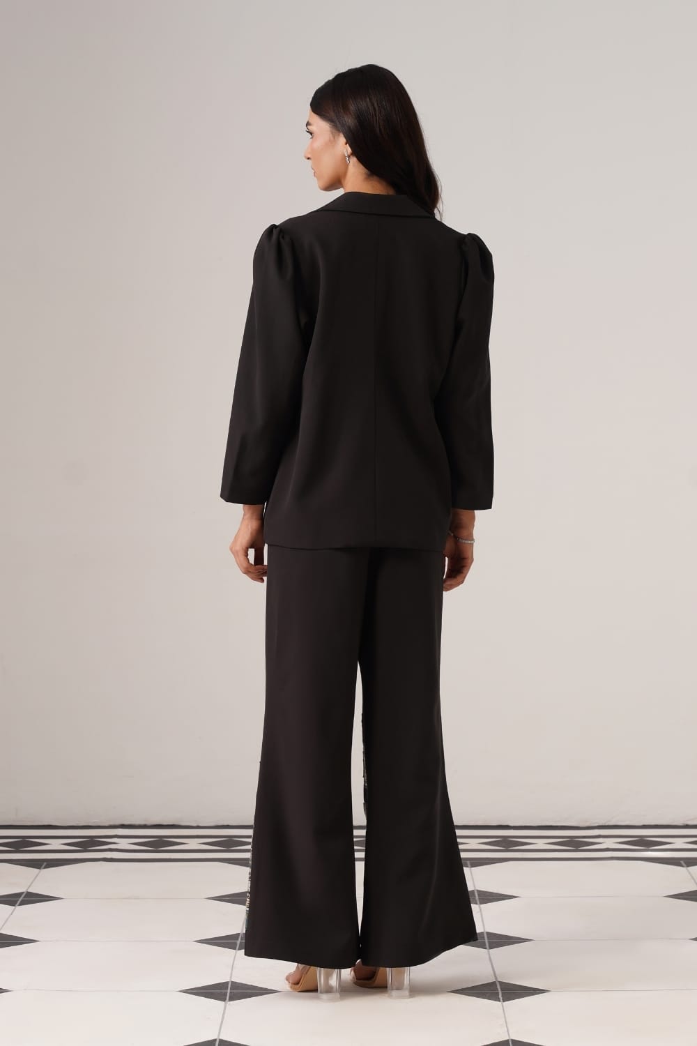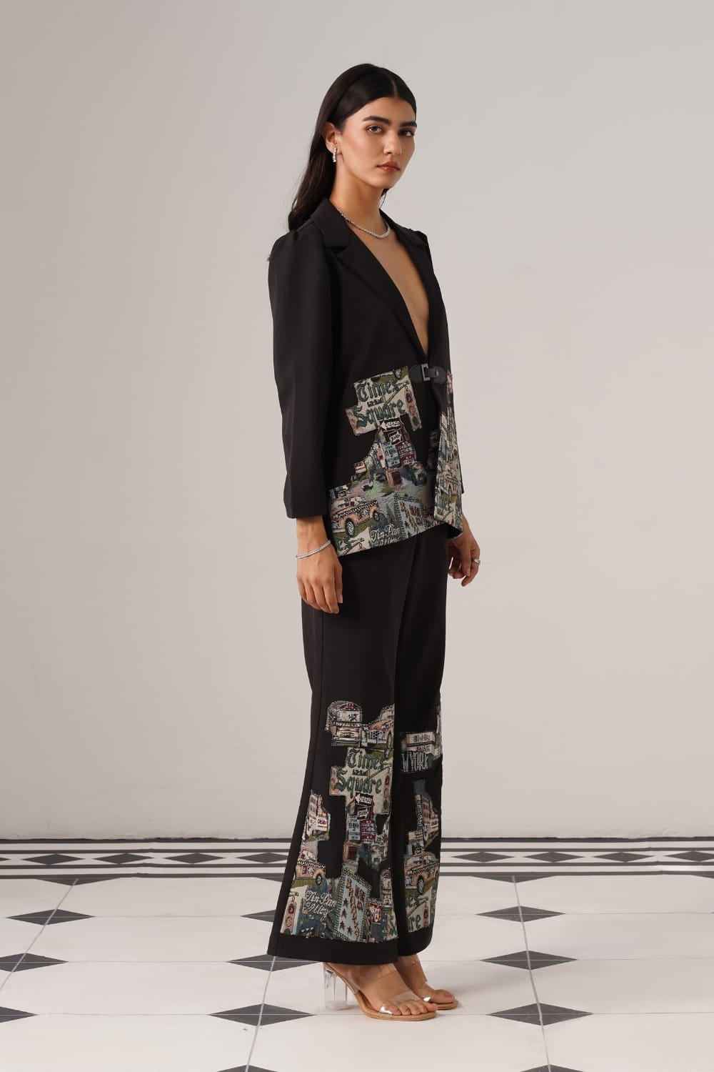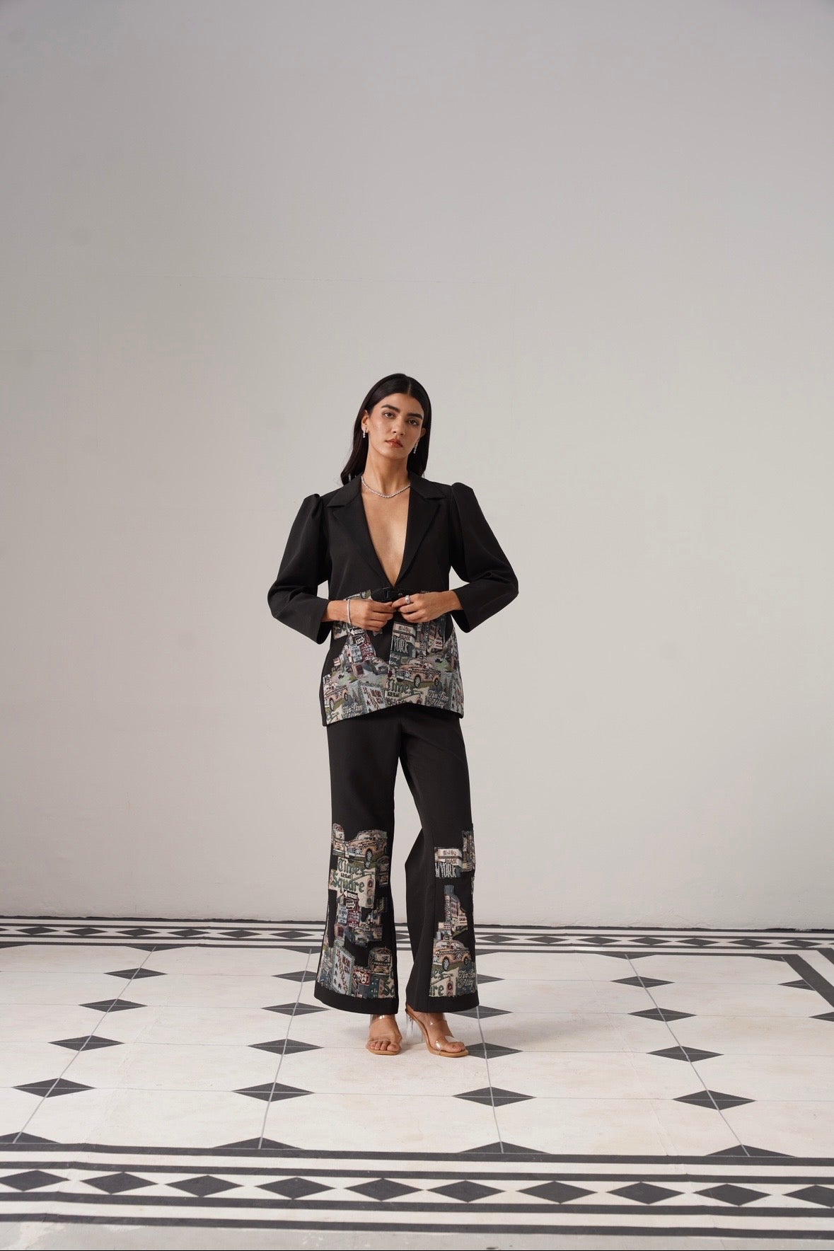 Structured black blazer with New York Inspiration detailing paired with black flared pants with the Same New York graphic accents.
