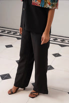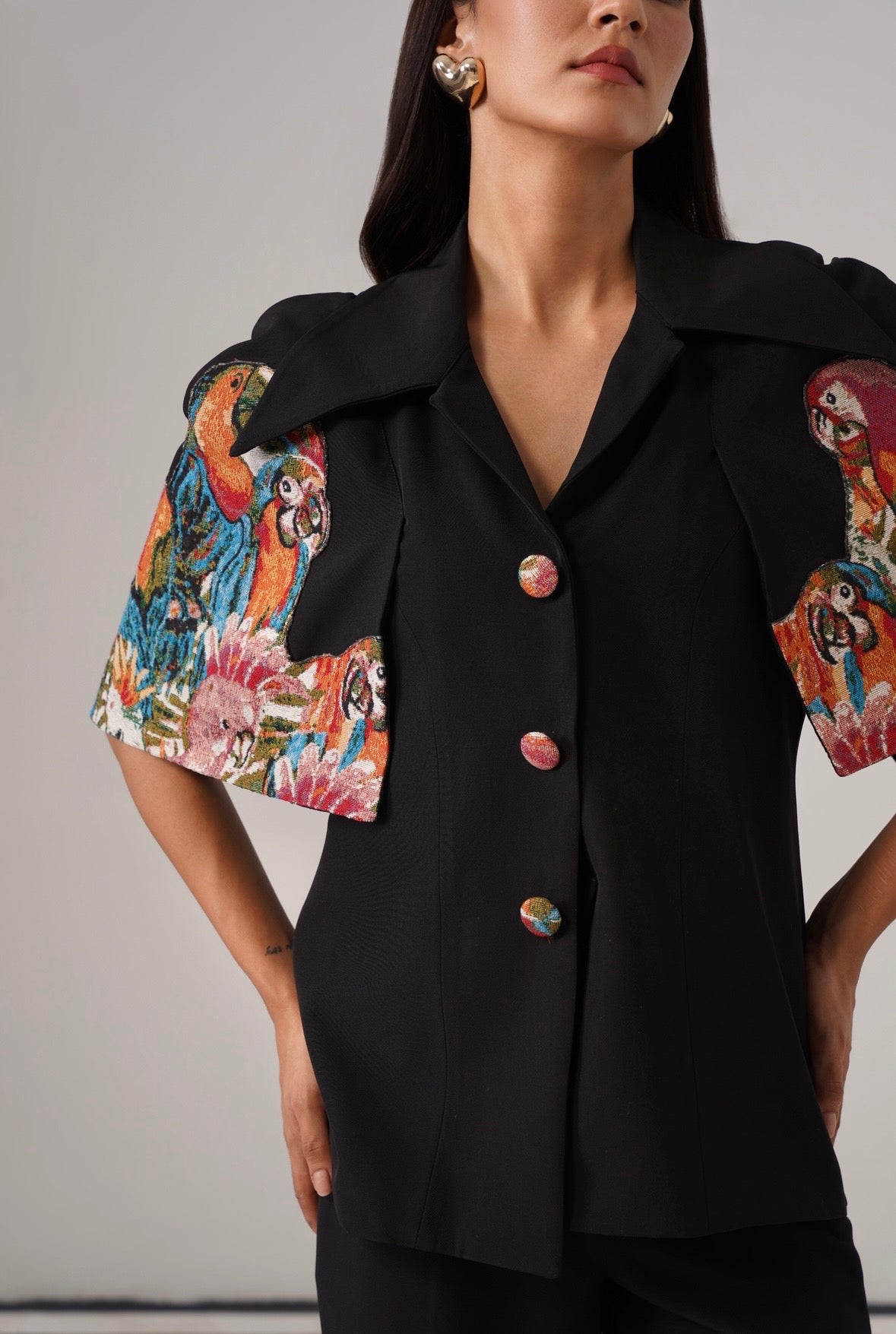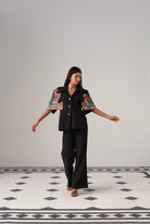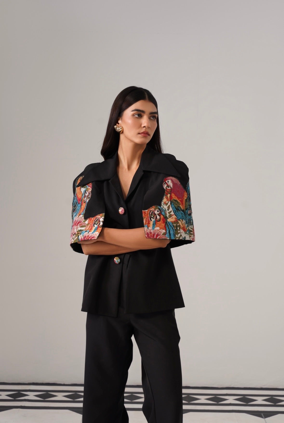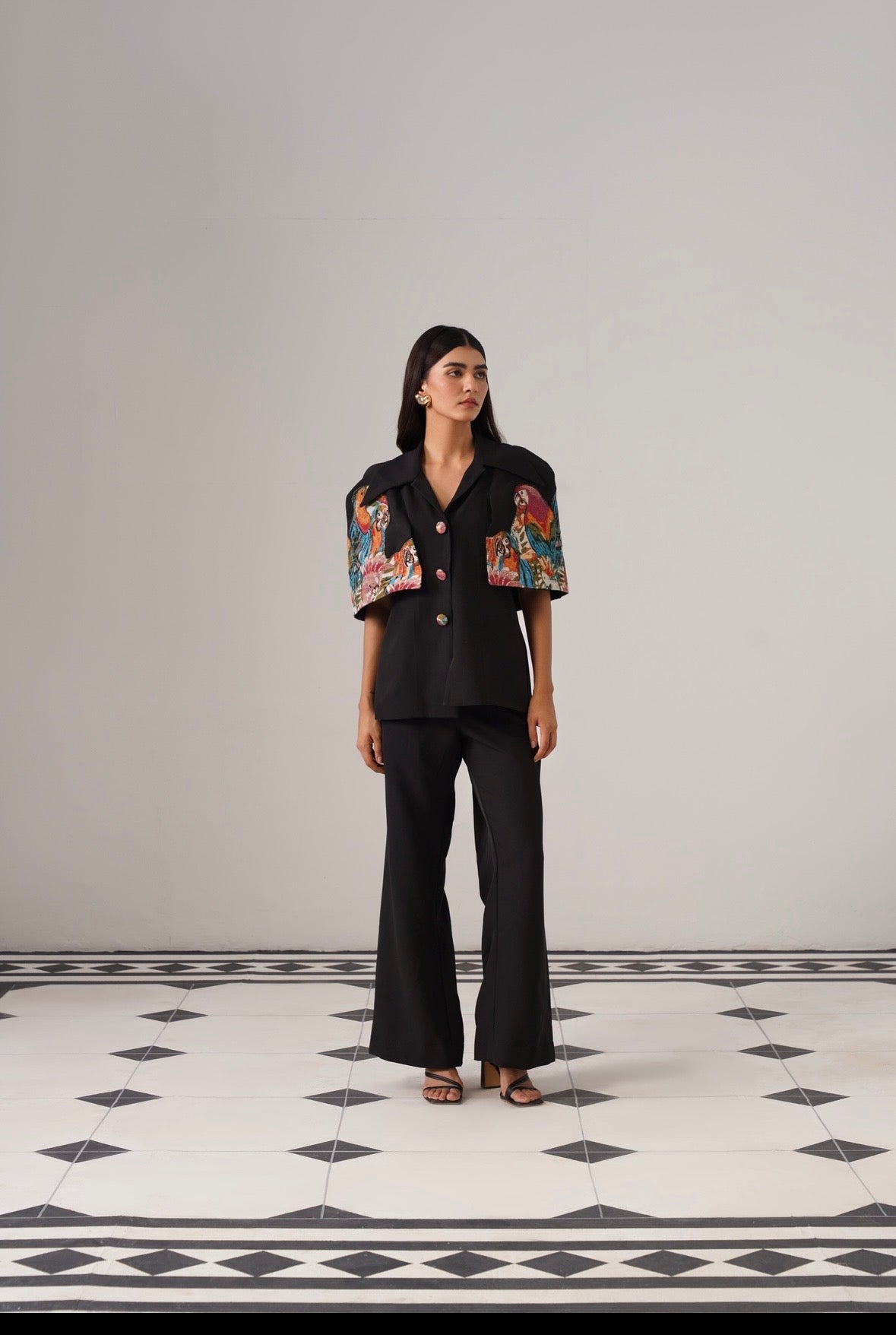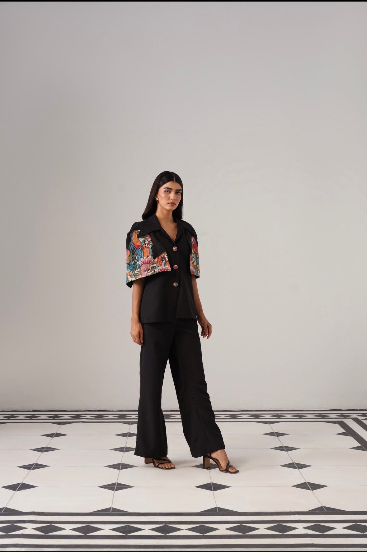 Black tailored coord set with statement cape overlay on the shoulders and statement buttons. Paired with black bellbottom pants.