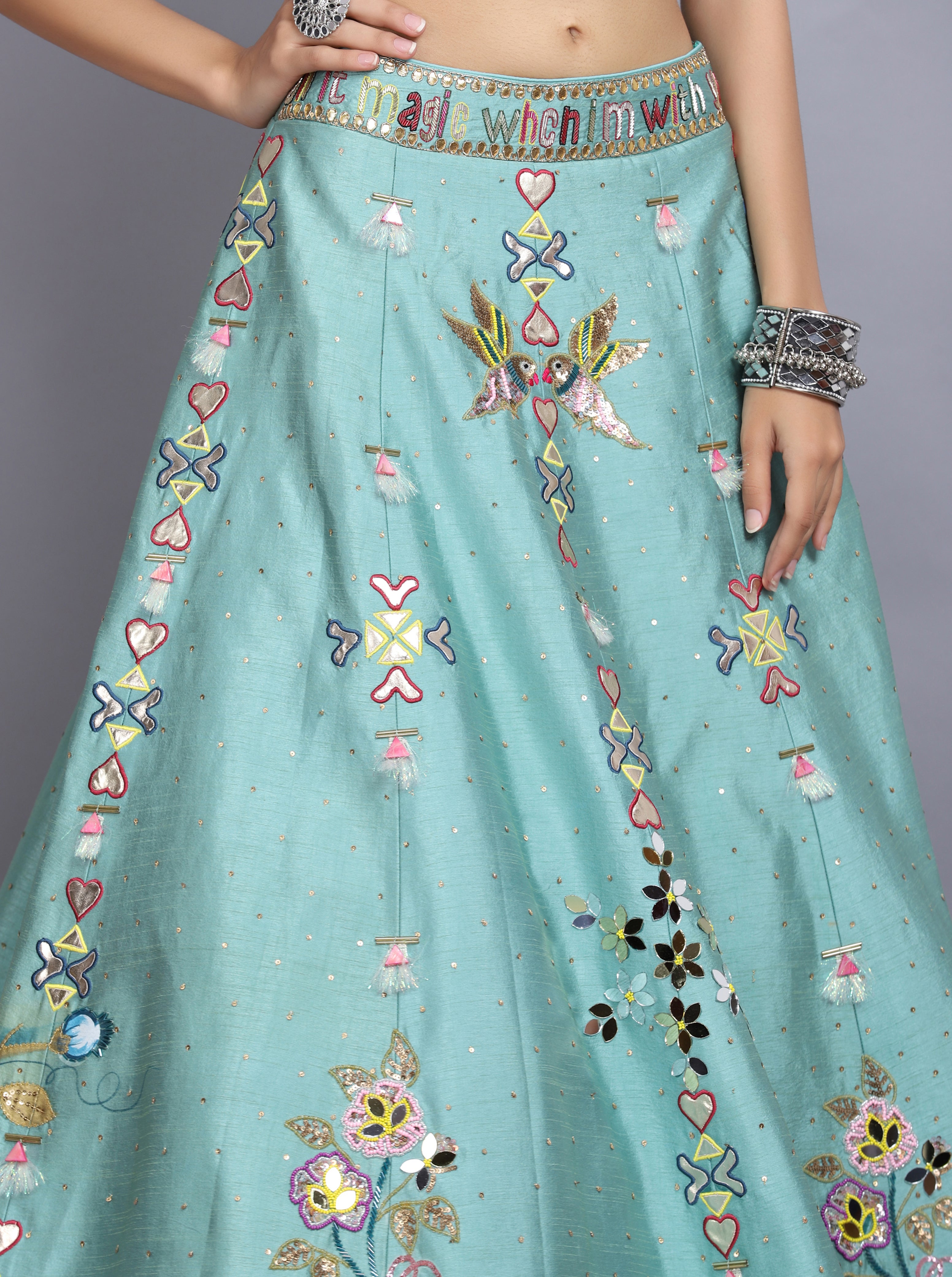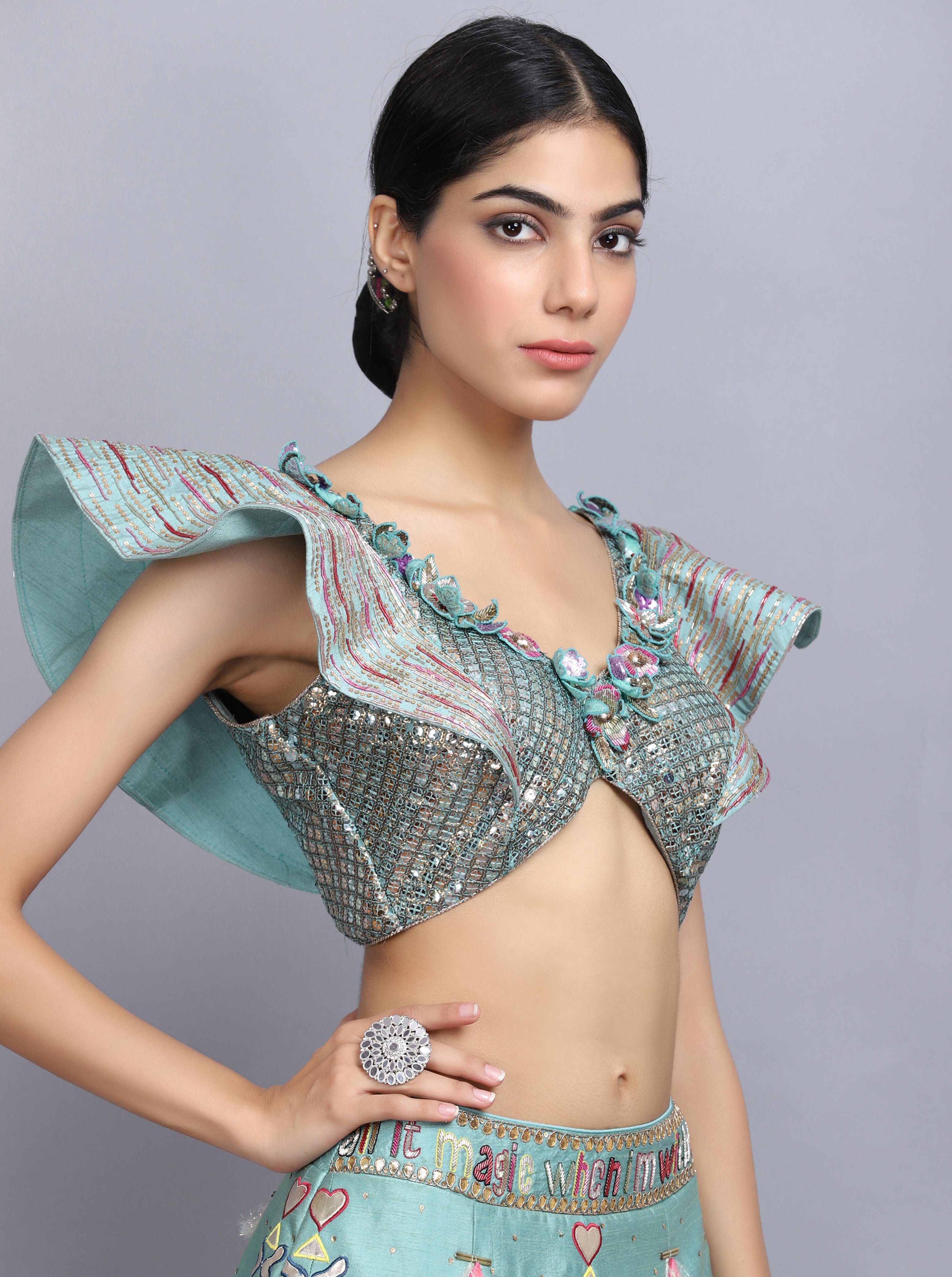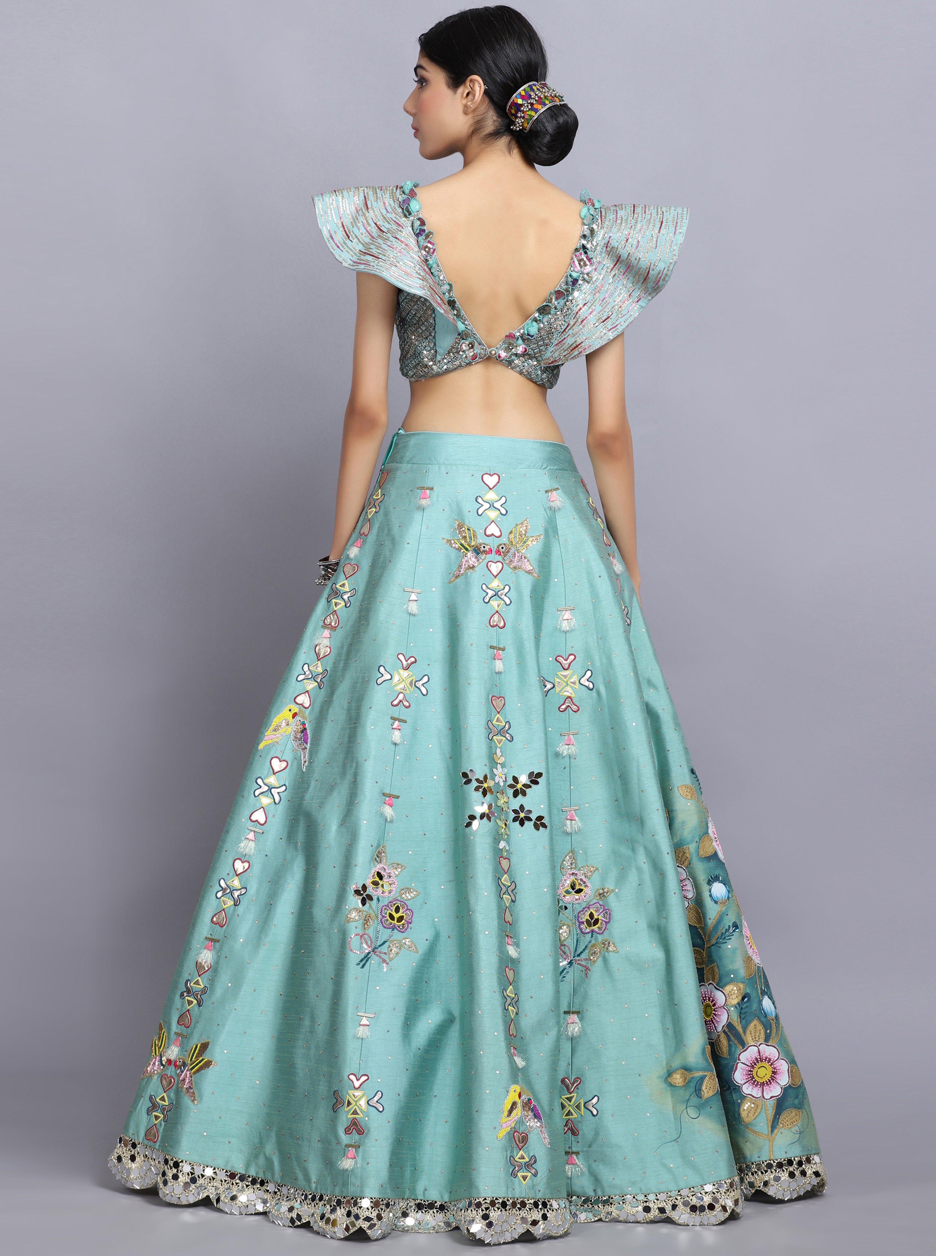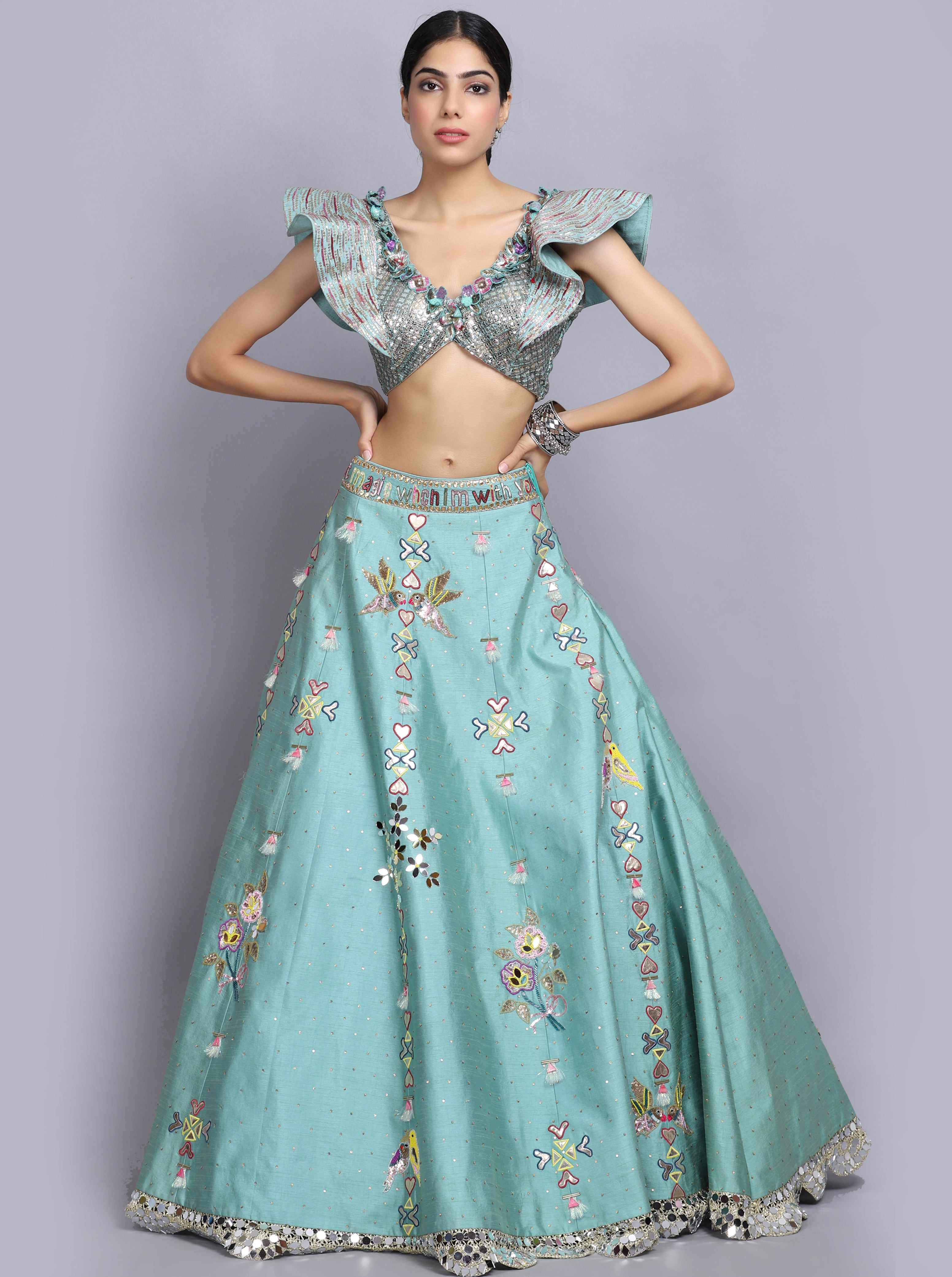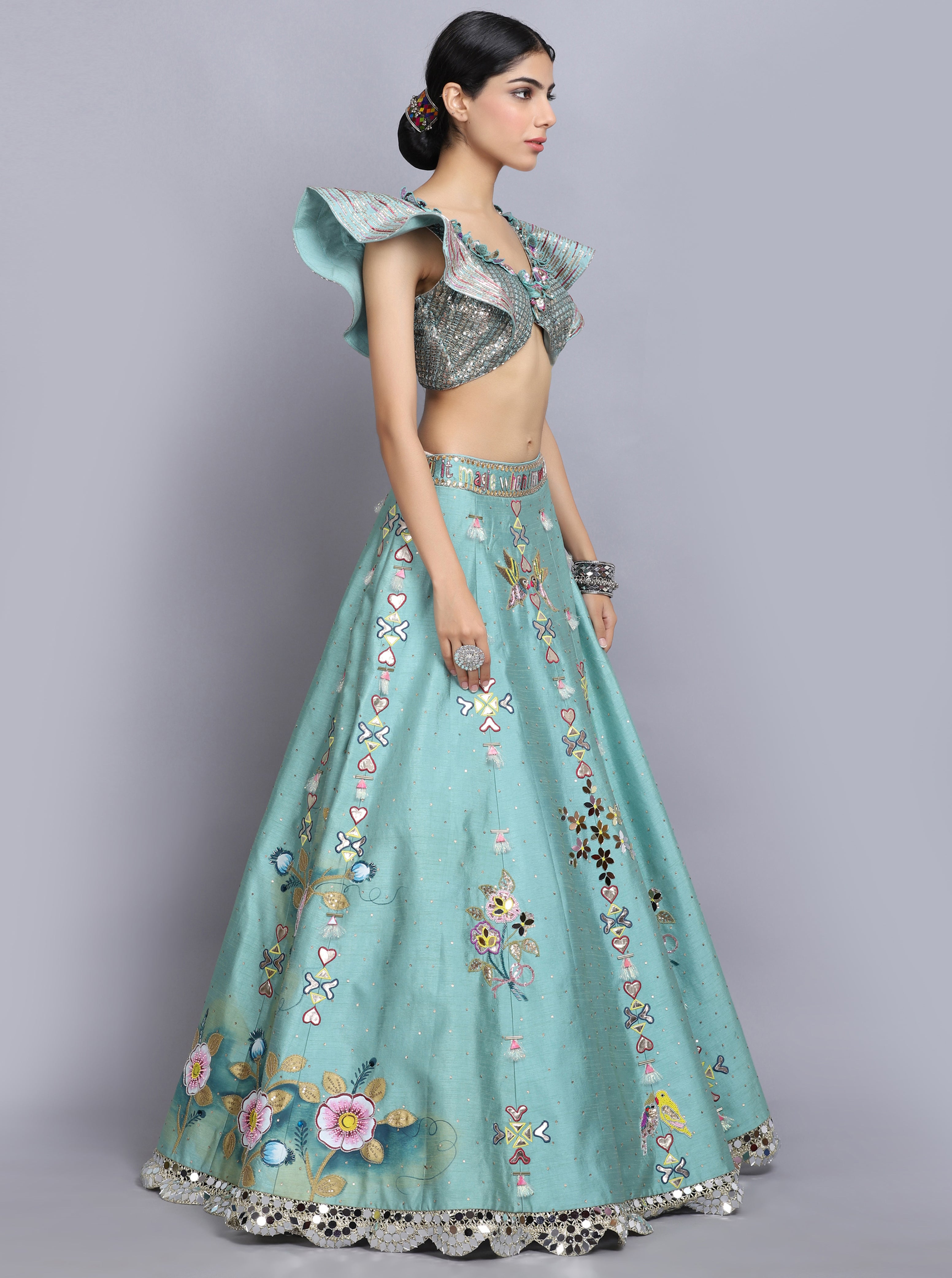 Description: Sapphire blue lehenga in raw silk base with hand painting and mirror embroidery. Paired with a matching blouse. The lehenga is a stunning light blue outfit with intricate embroidery and embellishments. The lehenga is in a beautiful light blue shade. The blouse is cropped, has a cut-out midriff, and features ruffled sleeves.The outfit is heavily embellished with sequins, beads, or embroidery, giving it a festive and glamorous look.