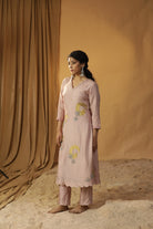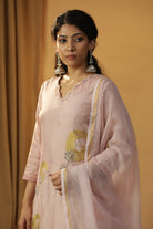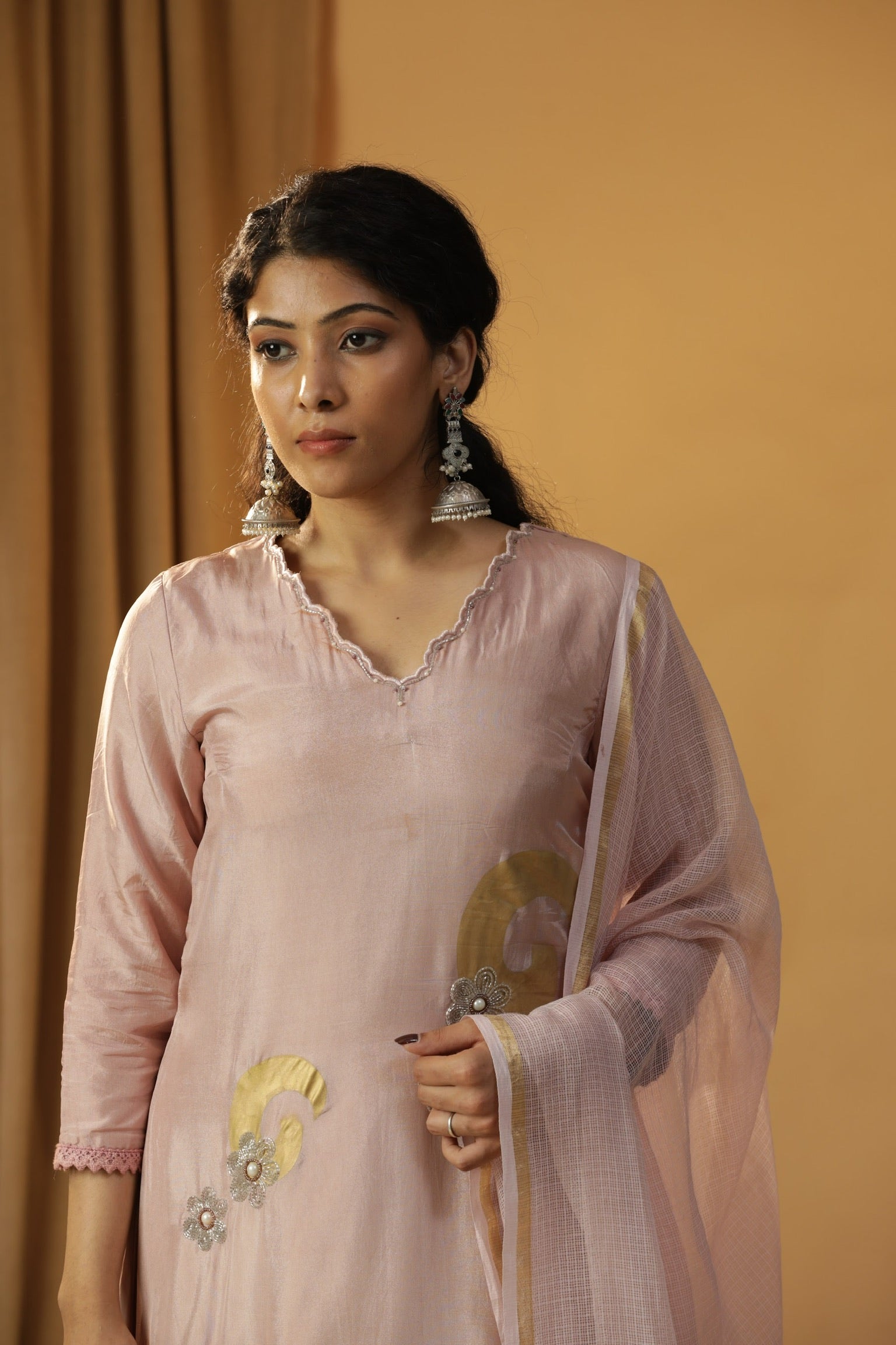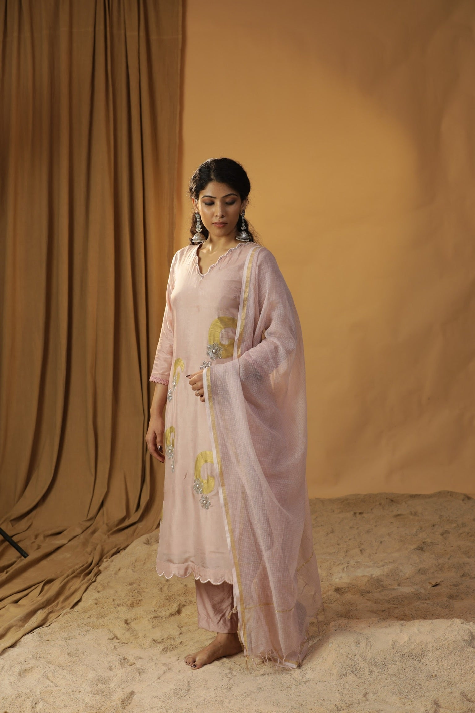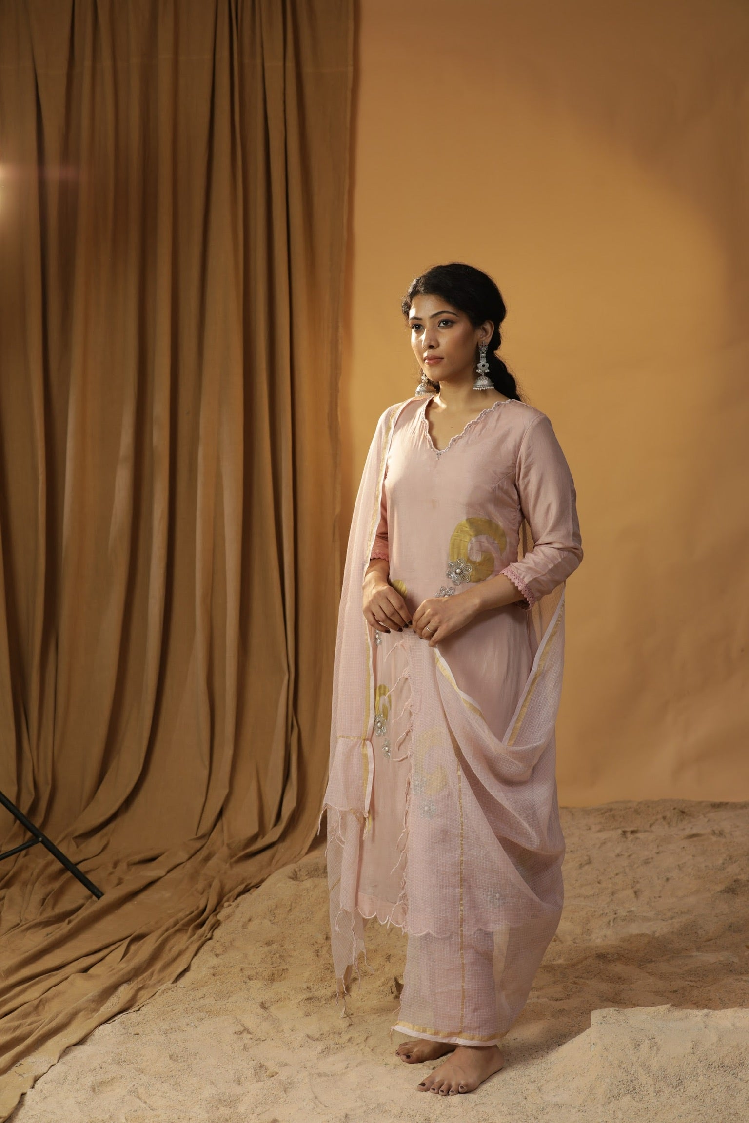Description: Featuring our baby pink foil painted suit set with cut Dana flowers on the kurta. Comes with pants and dupatta. The suit in the image is a beautiful hand-painted pink kurta set. The kurta is light pink with a V-neck and 3/4 sleeves. It is hand-painted yellow motifs with blue floral accents. The pants are matching baby pink. The overall look is elegant and ethnic, perfect for a casual or semi-formal occasion.