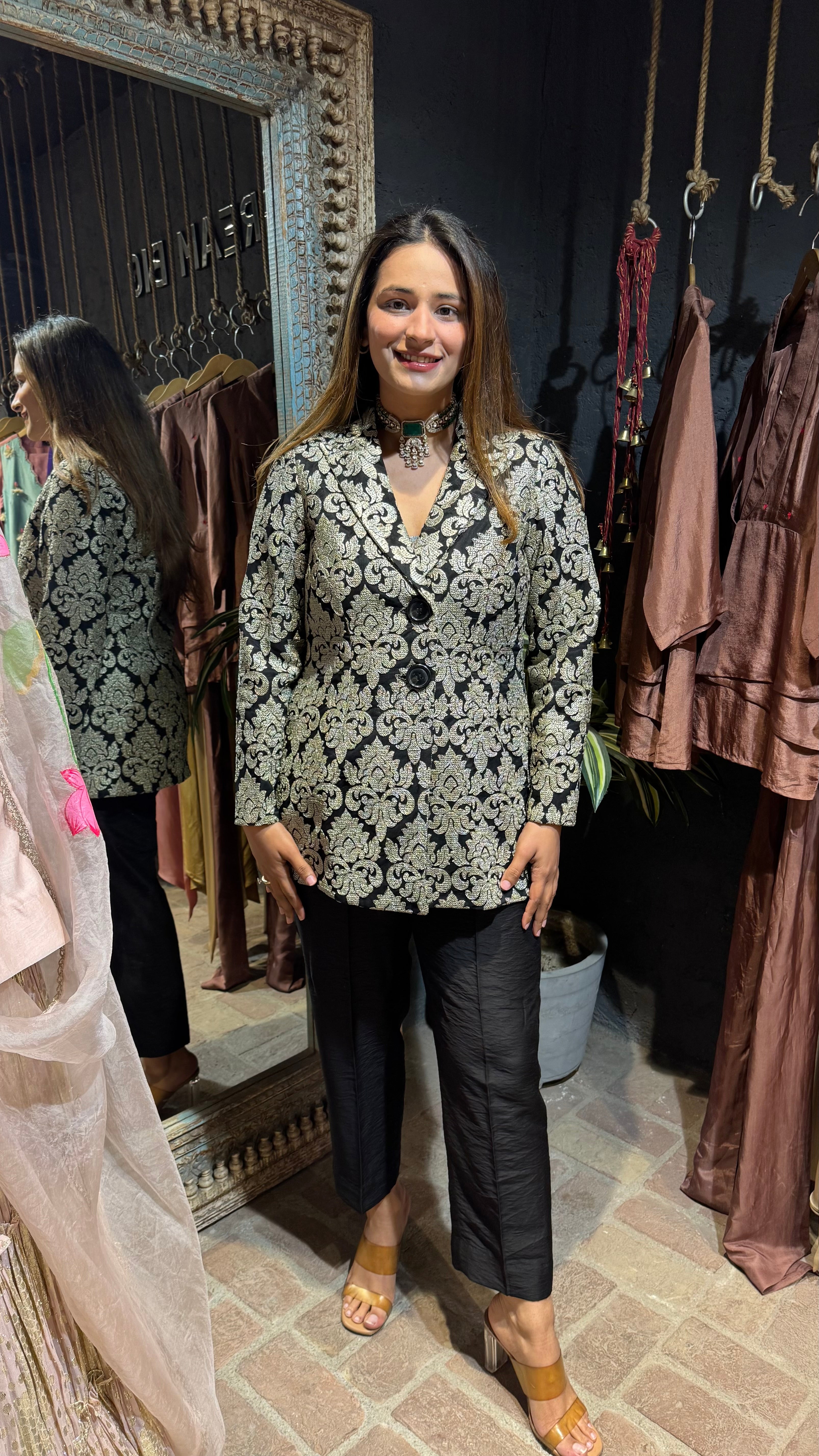 The Black-Chicco Blazer set features a sophisticated black blazer, crafted from net fabric with intricate machine embroidery, paired with elegant silk pants. This ensemble is ideal for small gatherings, offering a refined aesthetic that combines comfort with style. Its materials ensure a polished appearance while allowing ease of movement.
