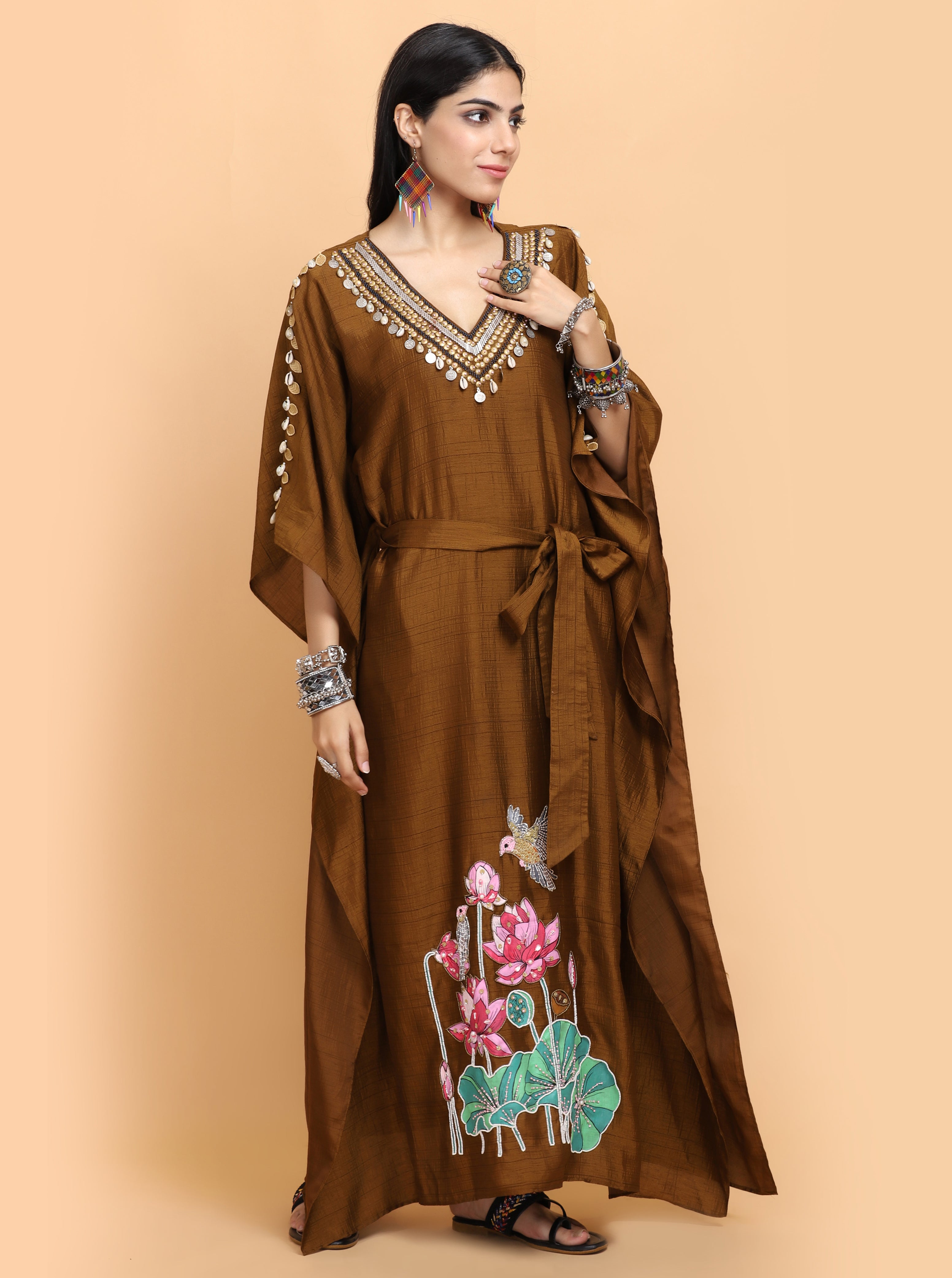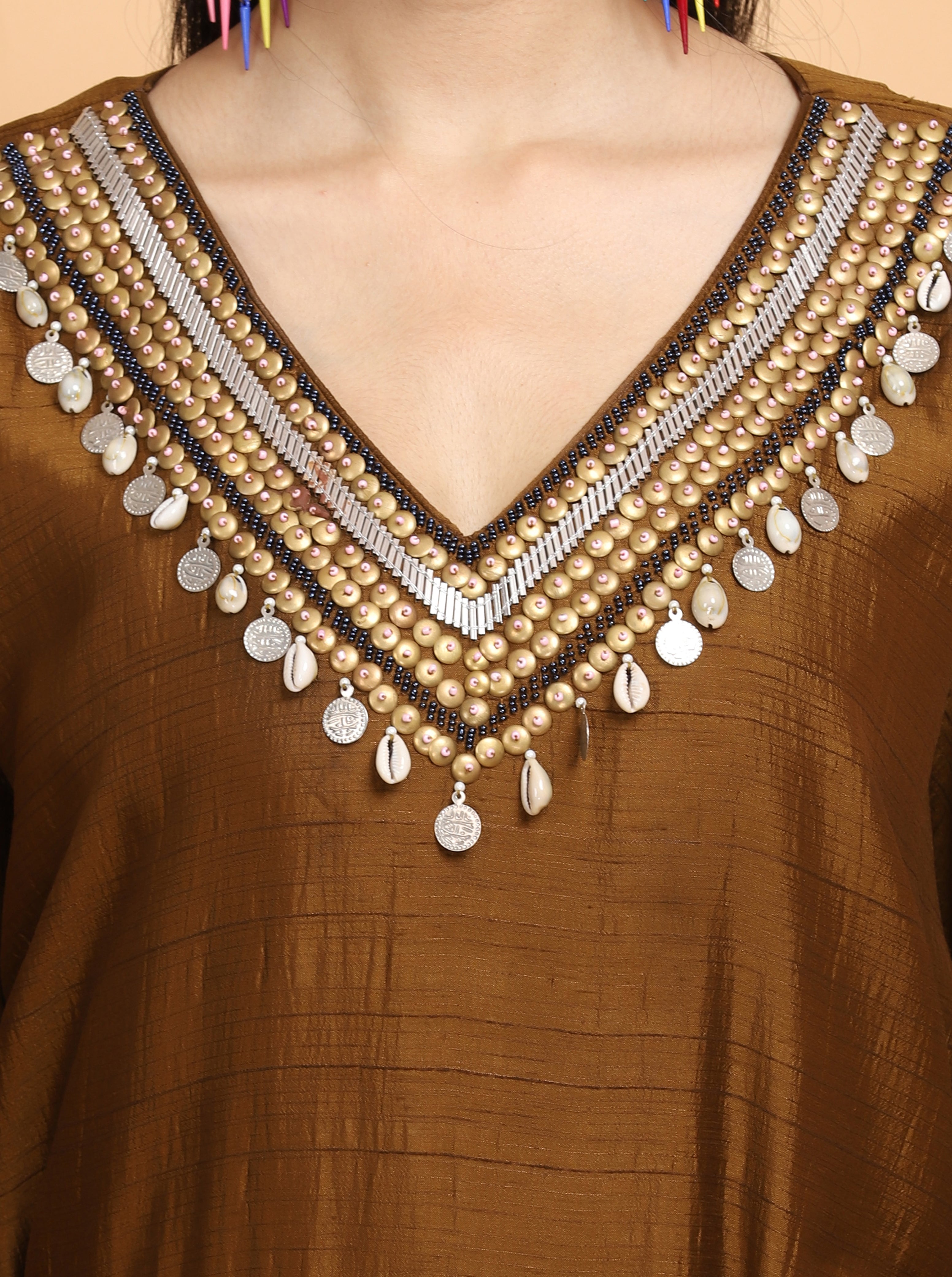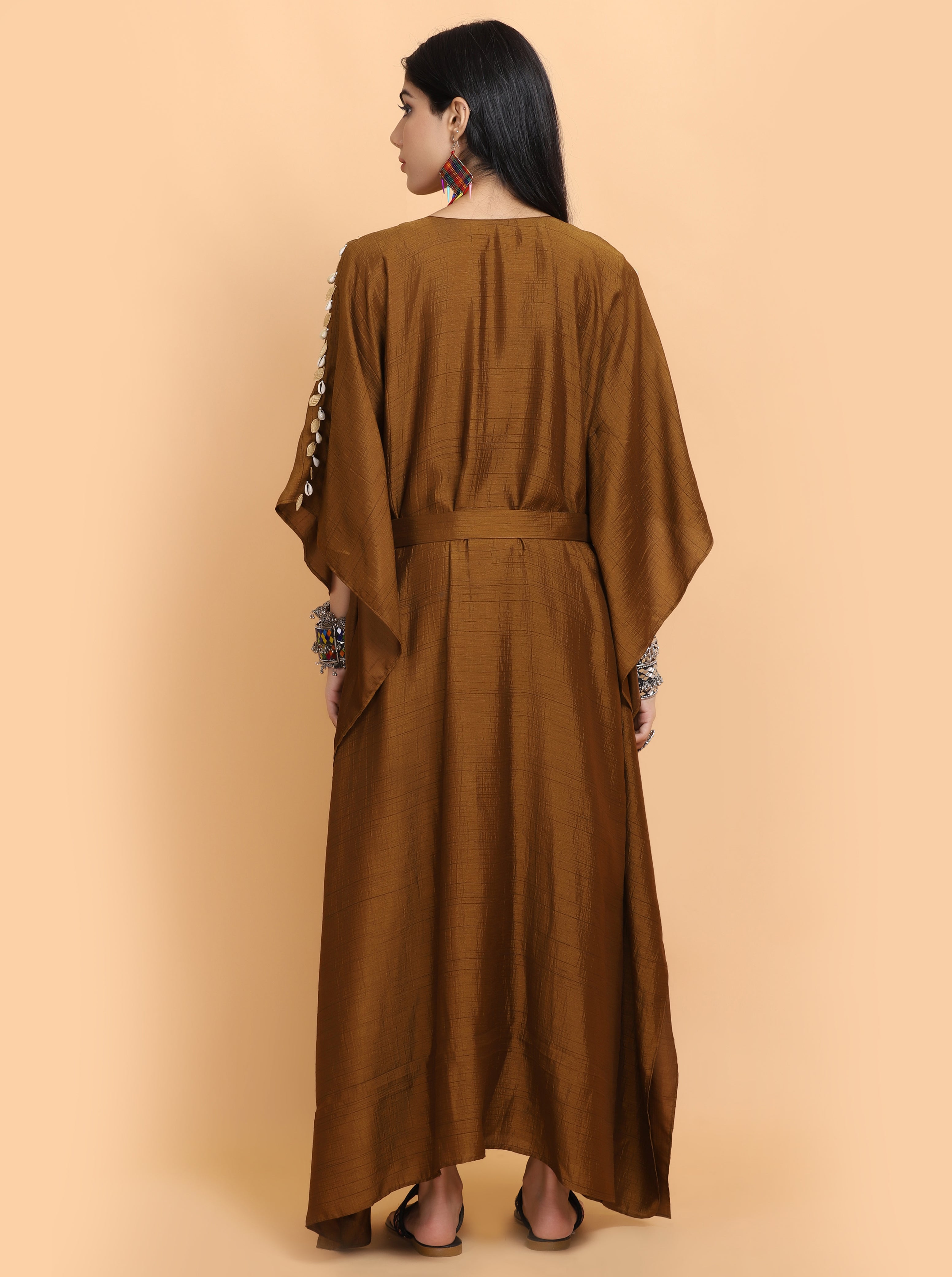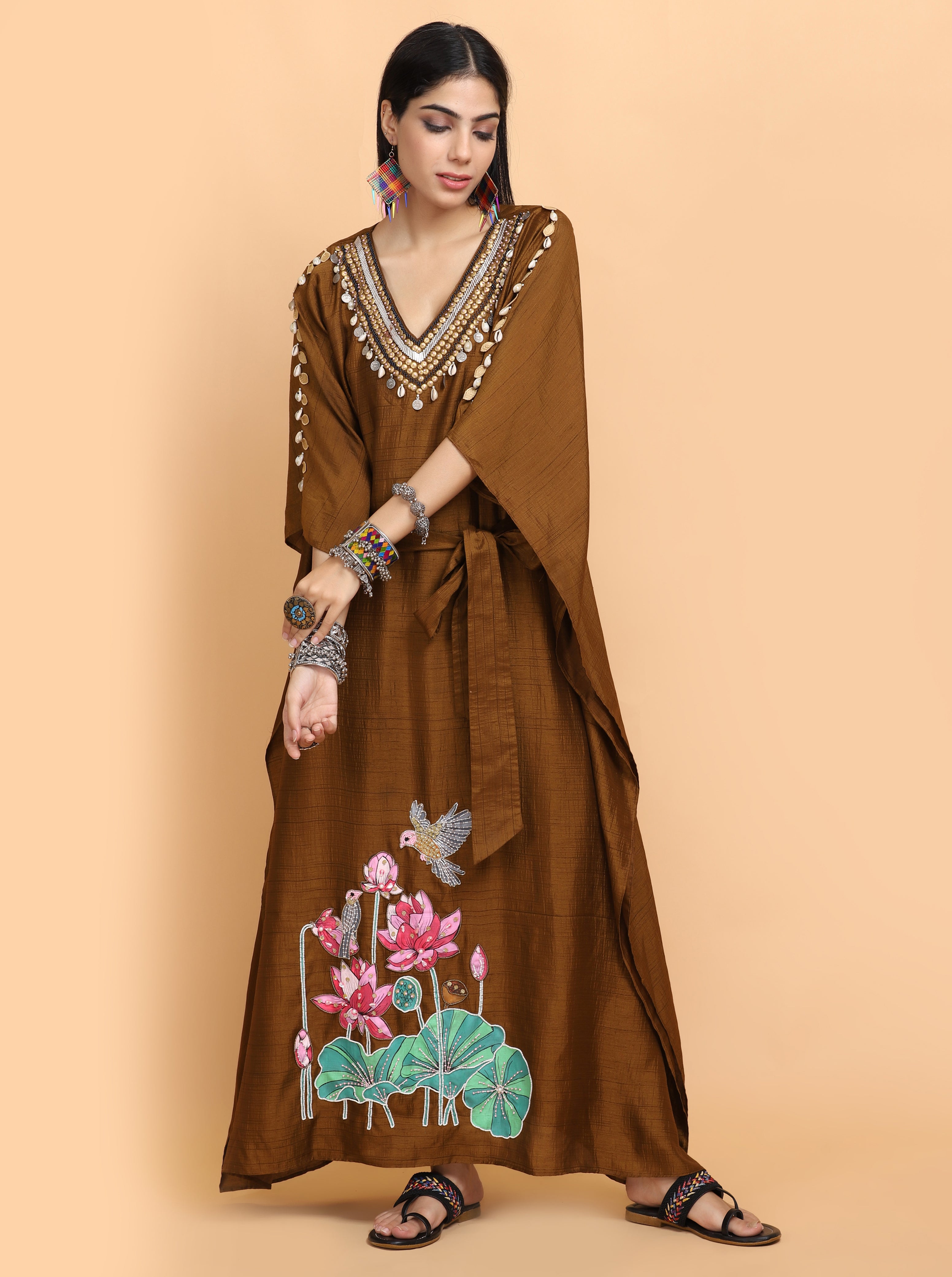 Brown handpainted kaftan set in silk. Comes with a moti embroidered neckline and tassel detail on the shoulders.
