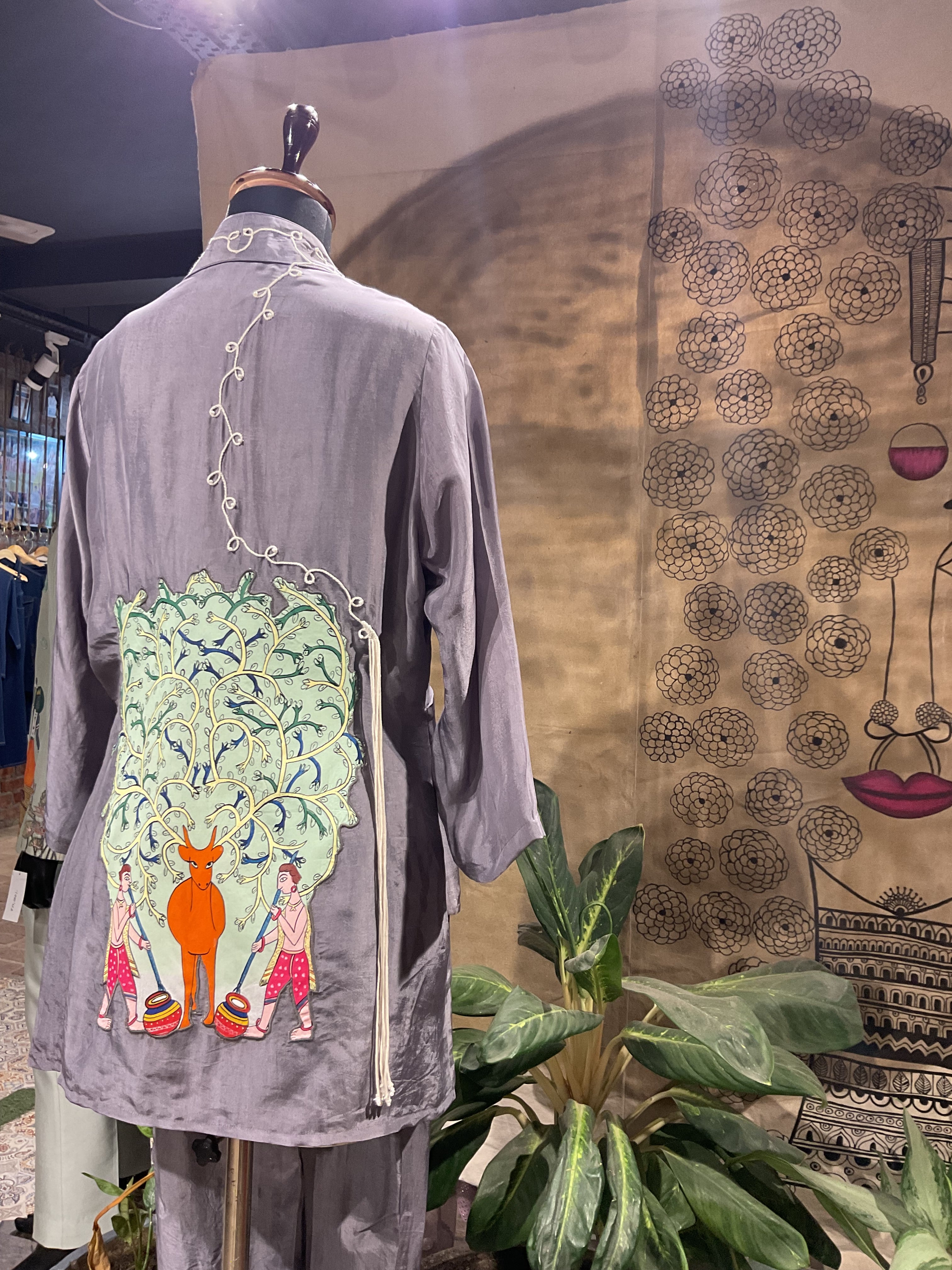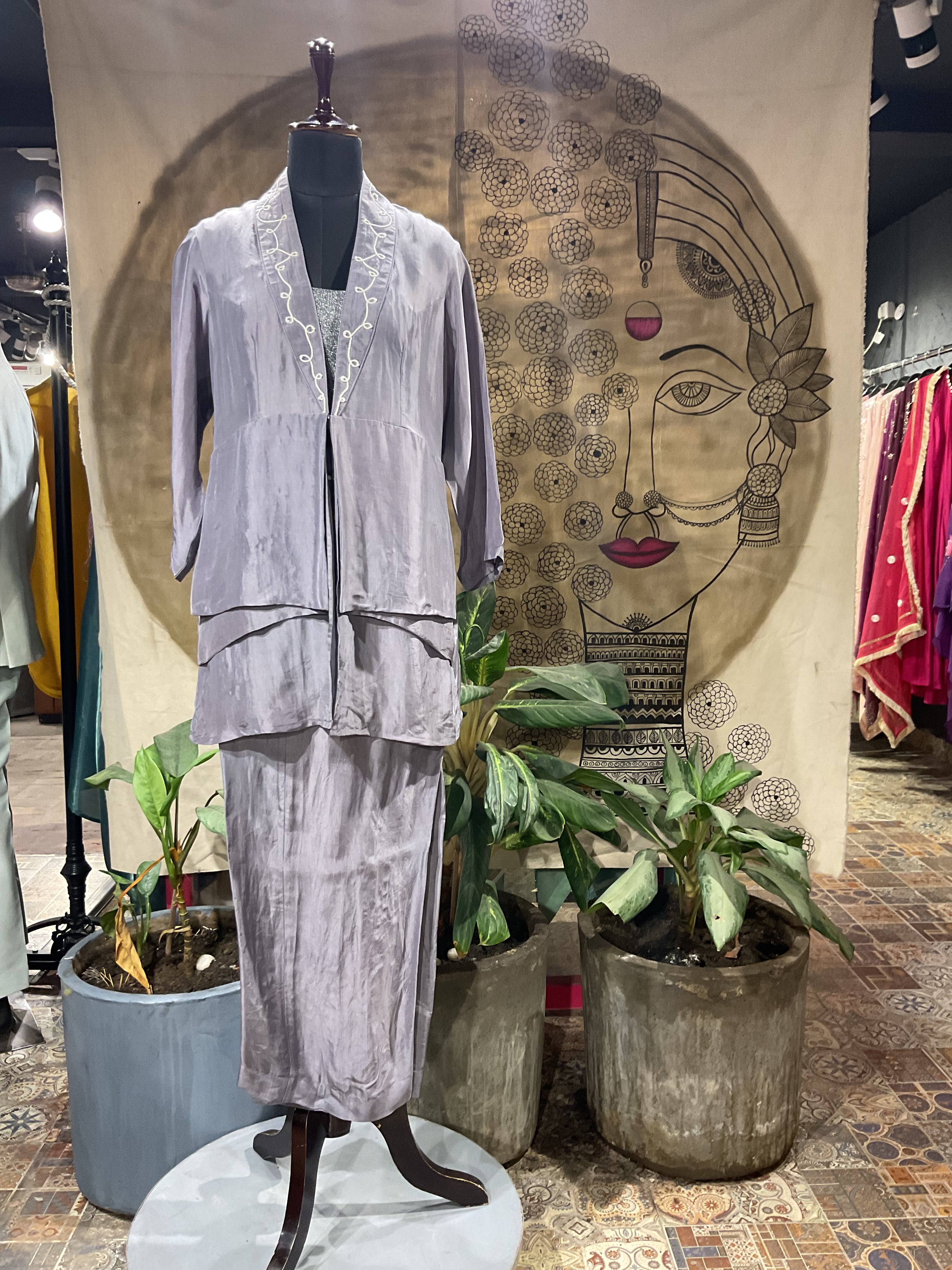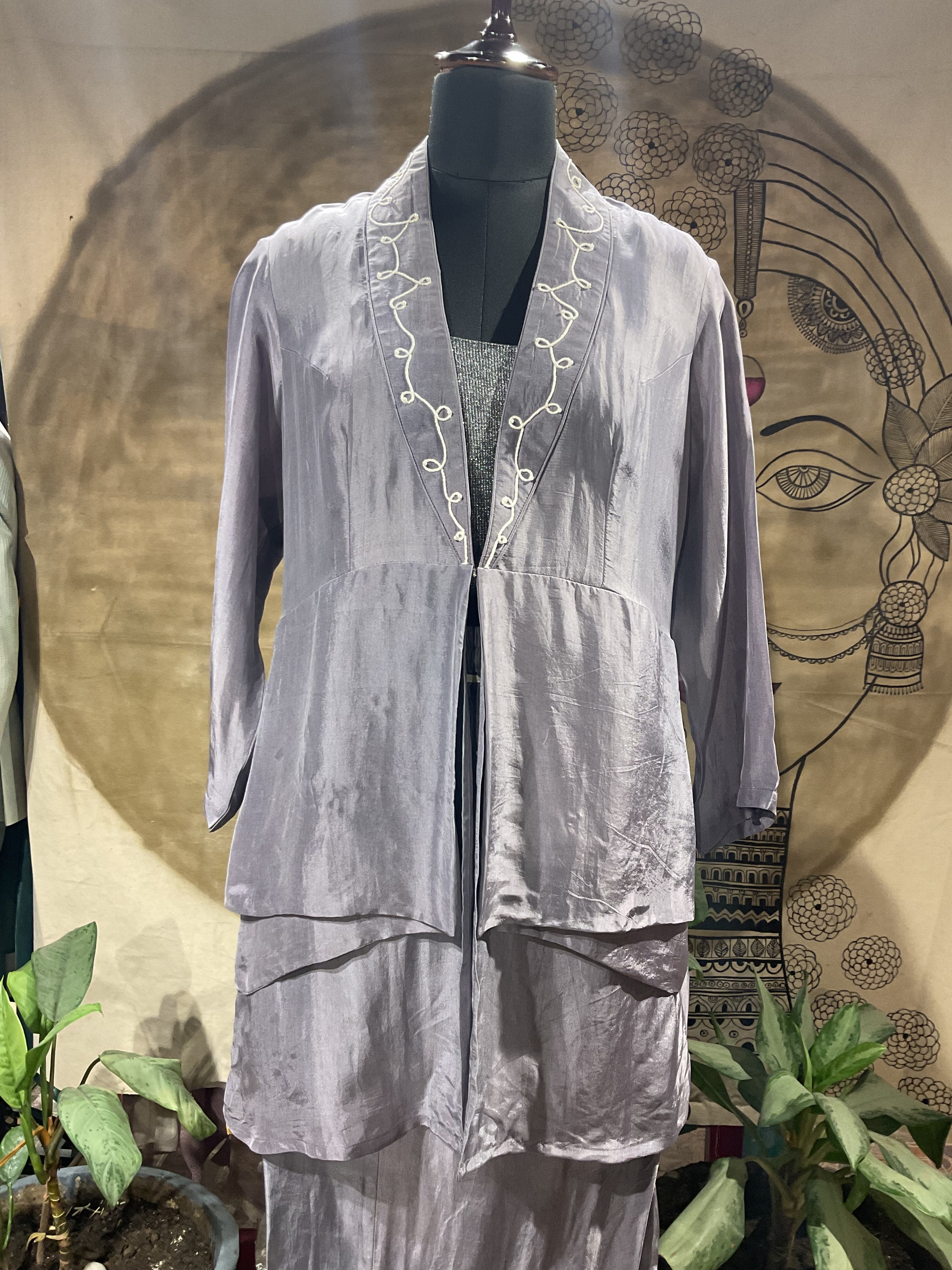 Description: The embroidery coord set is a lce blue, two-piece outfit consisting of a jacket,bustear and pant. The jacket has a V-neckline and is adorned with intricate white embroidery along the neckline and possibly other parts of the garment. The overall look is elegant and sophisticated, with the embroidery adding a touch of traditional or ethnic charm.