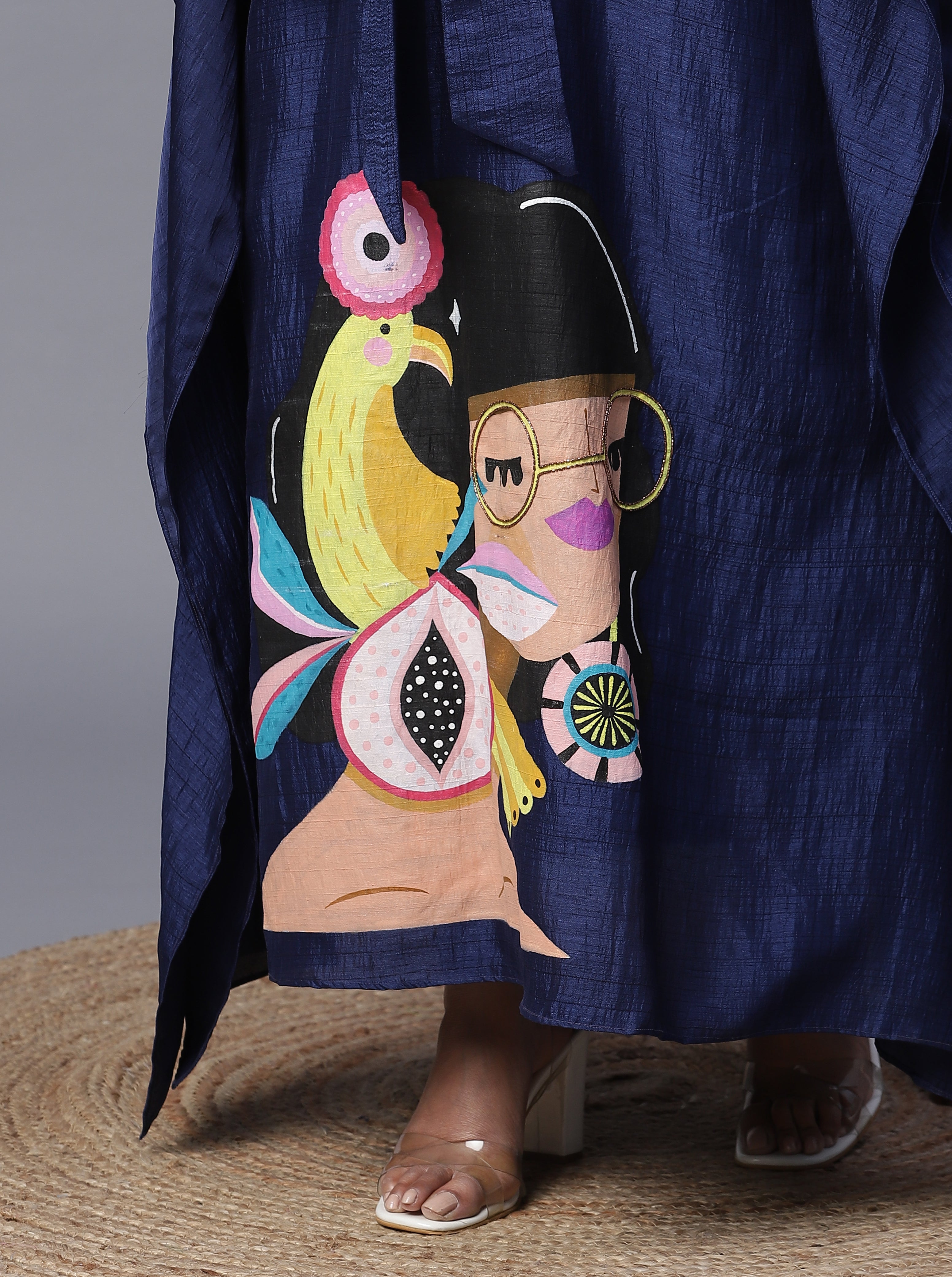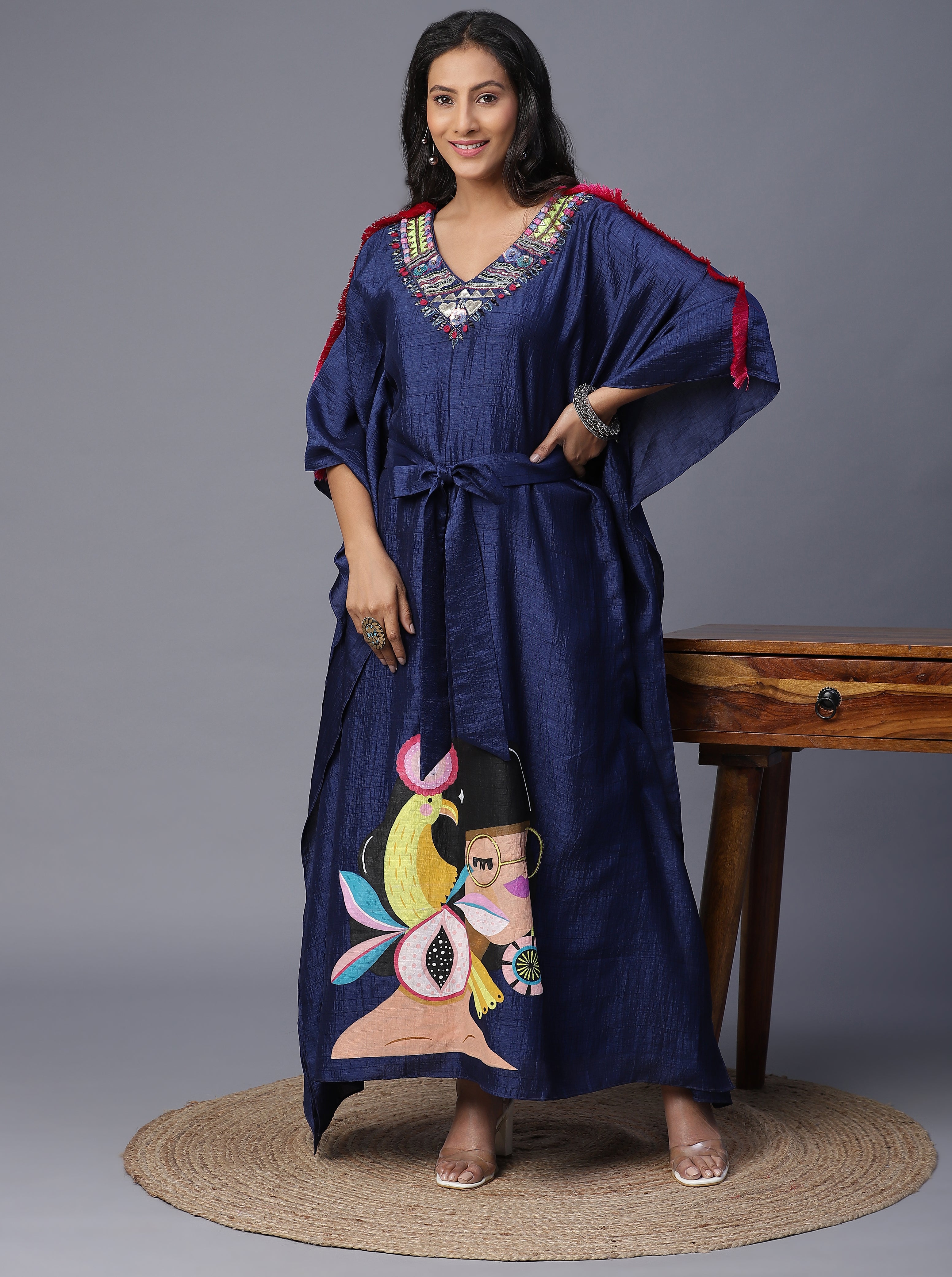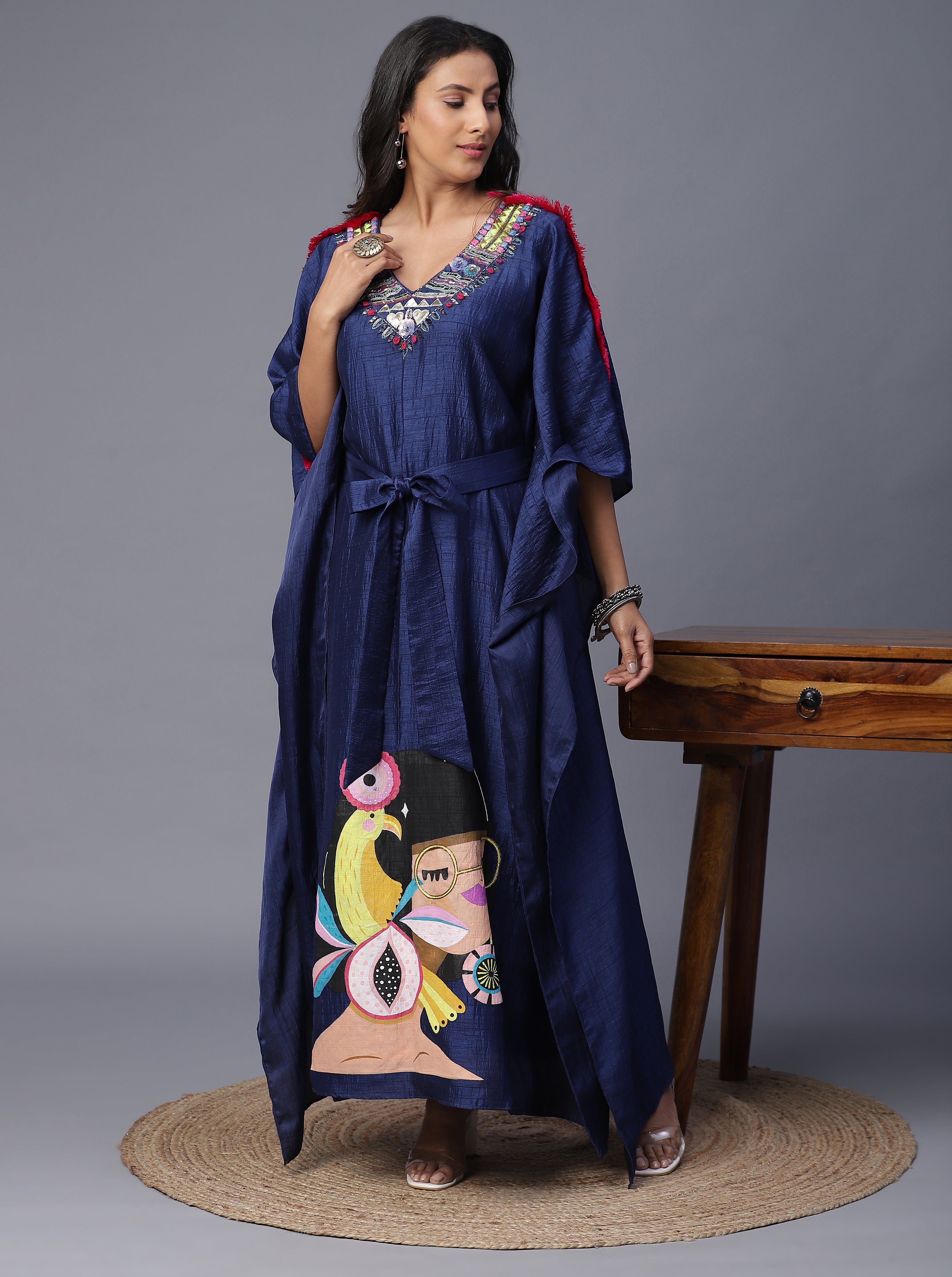 Signature Handprinted kaftan with a stunning neckline. Perfect for mehndi and sangeet night.