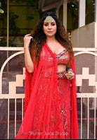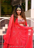 Description: That outfit is 🔥! It's a pink lehenga with intricate silver embroidery all over. The lehenga has a cut-out midriff top (strapless with a sweetheart neckline) and a matching dupatta draped on one side. The silver embroidery gives it a super glam look.Fuchsia Pink skirt with pleated blouse. Comes with a net ruffled dupatta .
