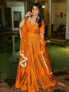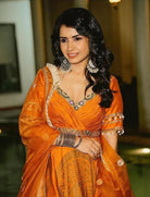 Description: Mittal Patel is wearing an orange gown dress with gold patterns printed on it. Featuring our burnt orange foil printed chanderi gown with dupatta set. comes with foil prints on all over the flares and sequence, shell, cut-dana work on neck deep sweetheart neck and sleeves(short) and a burnt orange organza dupatta. The dress has a fitted bodice with a V-neckline and short sleeves. The bodice and sleeves are embellished with gold embroidery or trim. The dress has a flared gown.