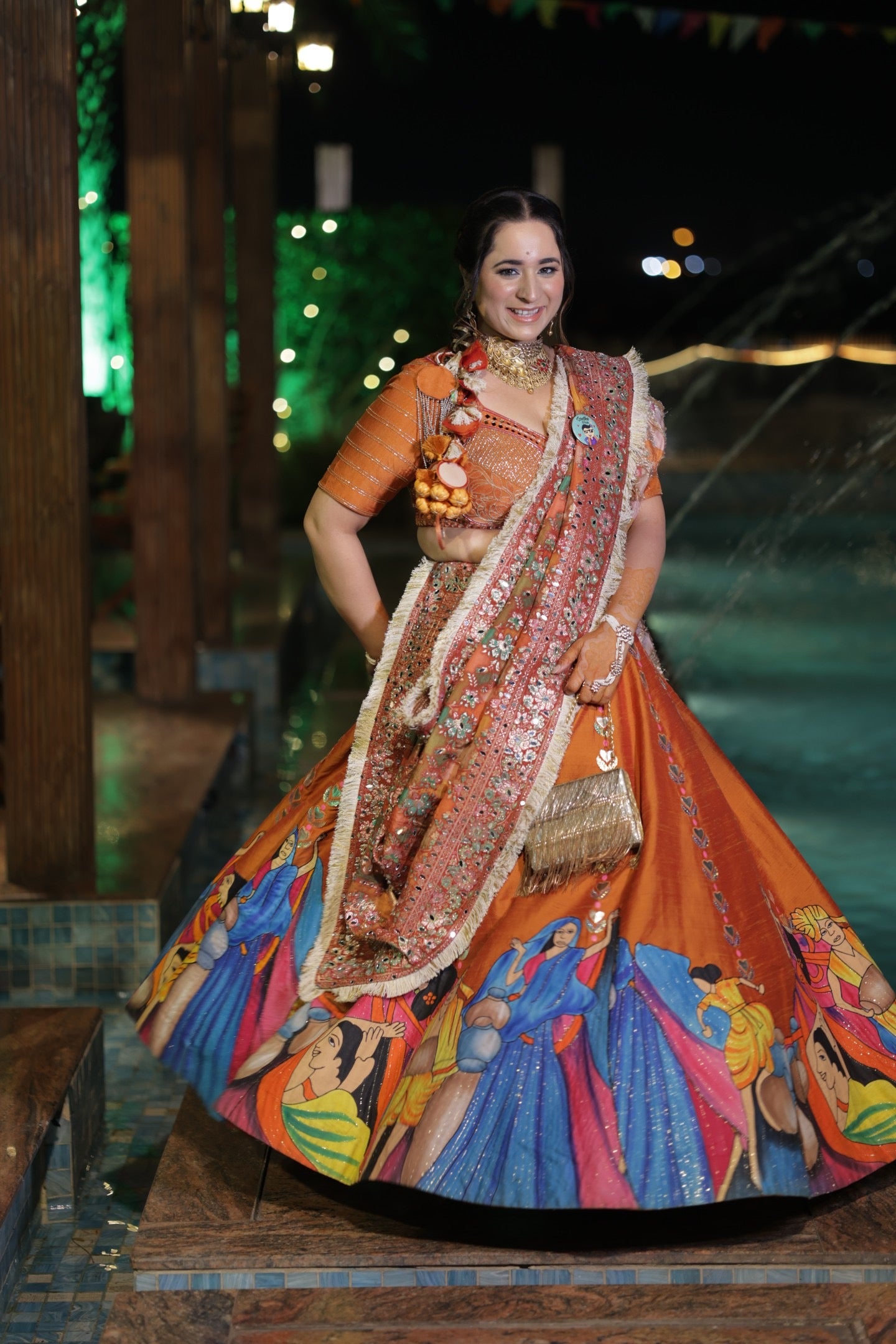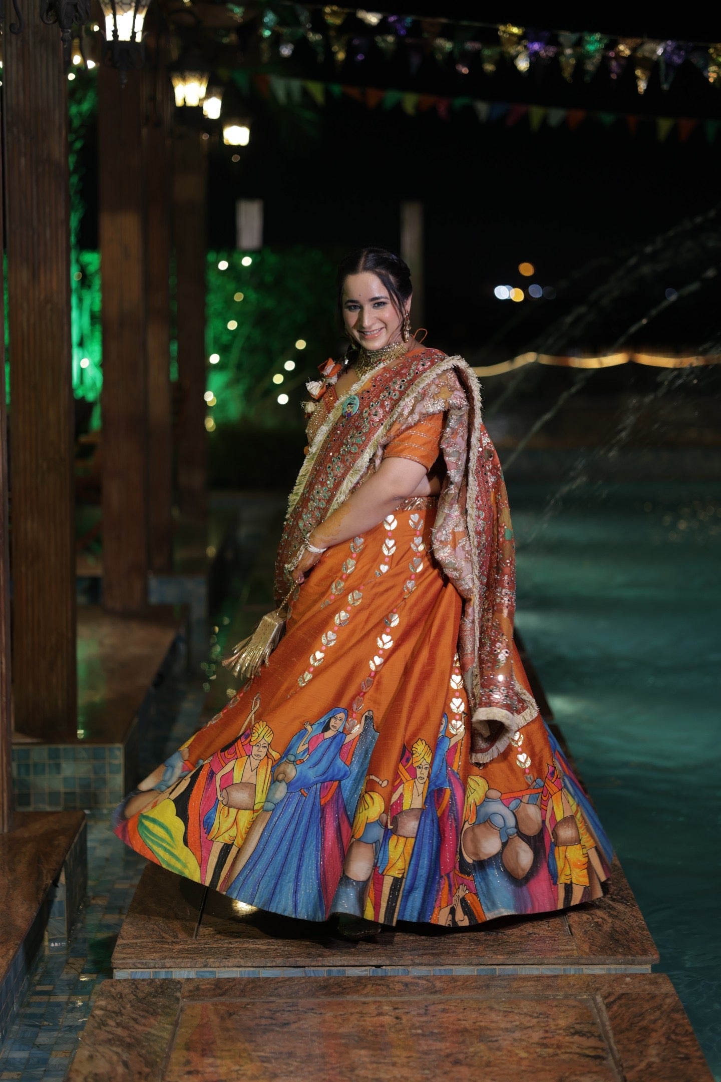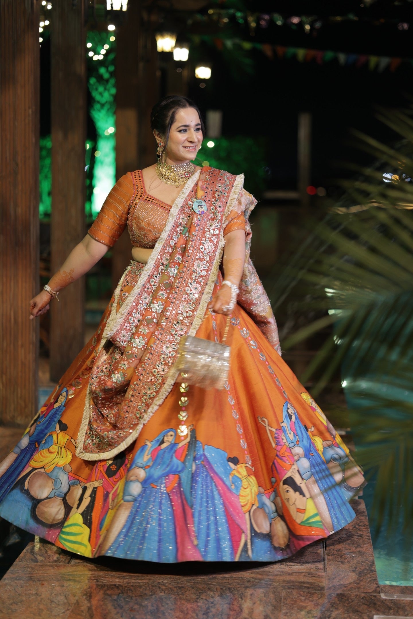 Description: Modern Barat Lehenga. That lehenga is 🔥! It's a hand-painted orange lehenga with a matching crop top (choli). The lehenga has a vibrant design with colorful paintings at the bottom in shades of blue, pink, and yellow. The top part of the lehenga has white floral patterns. The choli is intricately designed with what looks like silver or white embroidery/details.