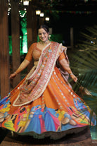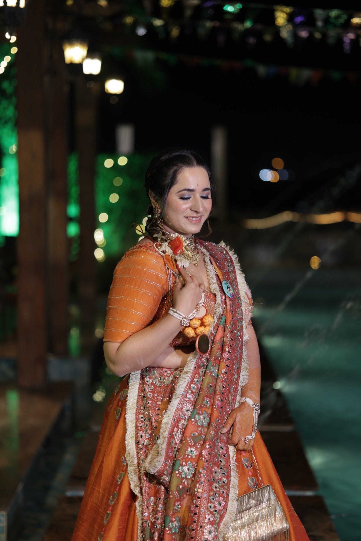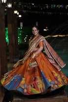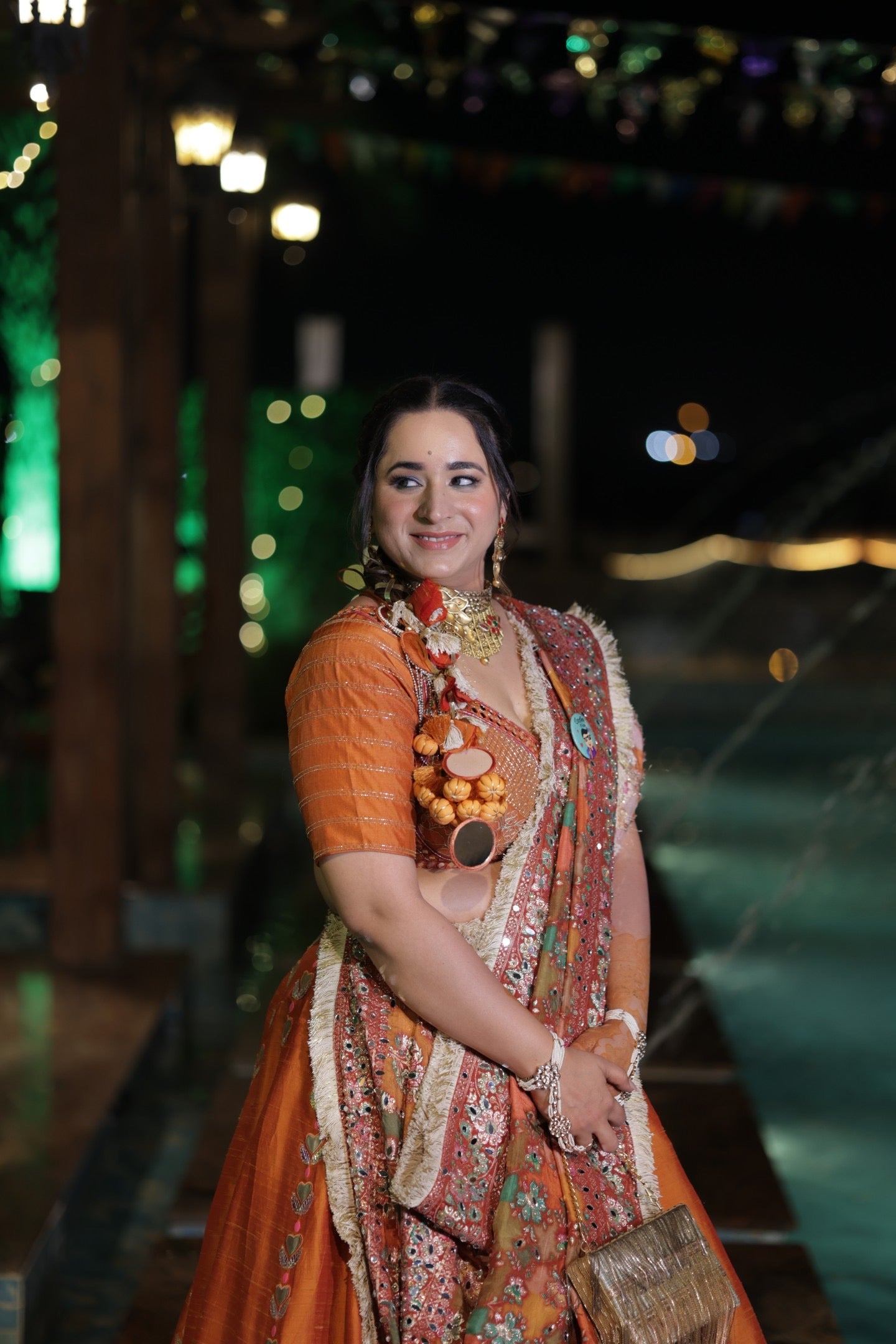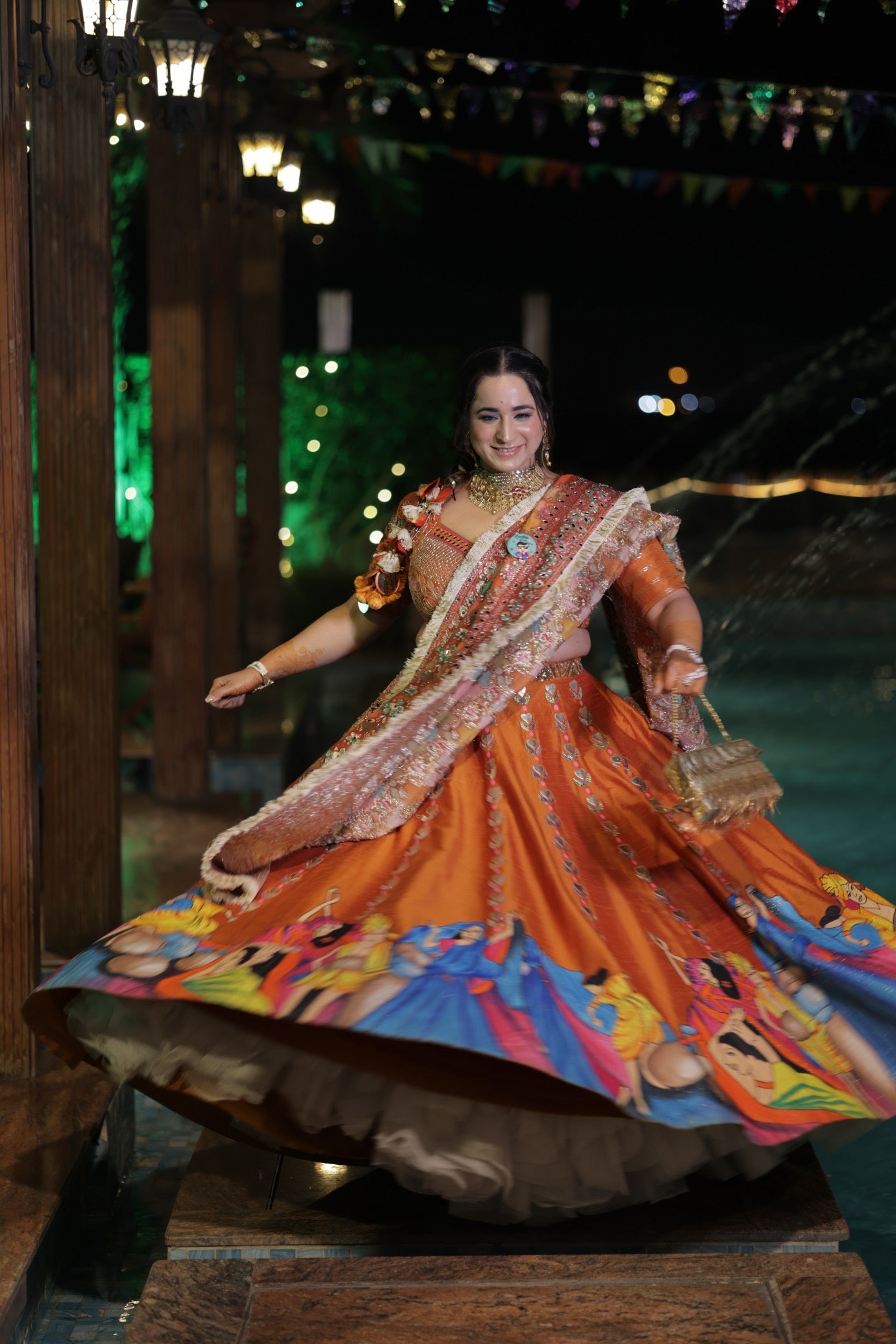 Description: Modern Barat Lehenga. That lehenga is 🔥! It's a hand-painted orange lehenga with a matching crop top (choli). The lehenga has a vibrant design with colorful paintings at the bottom in shades of blue, pink, and yellow. The top part of the lehenga has white floral patterns. The choli is intricately designed with what looks like silver or white embroidery/details.