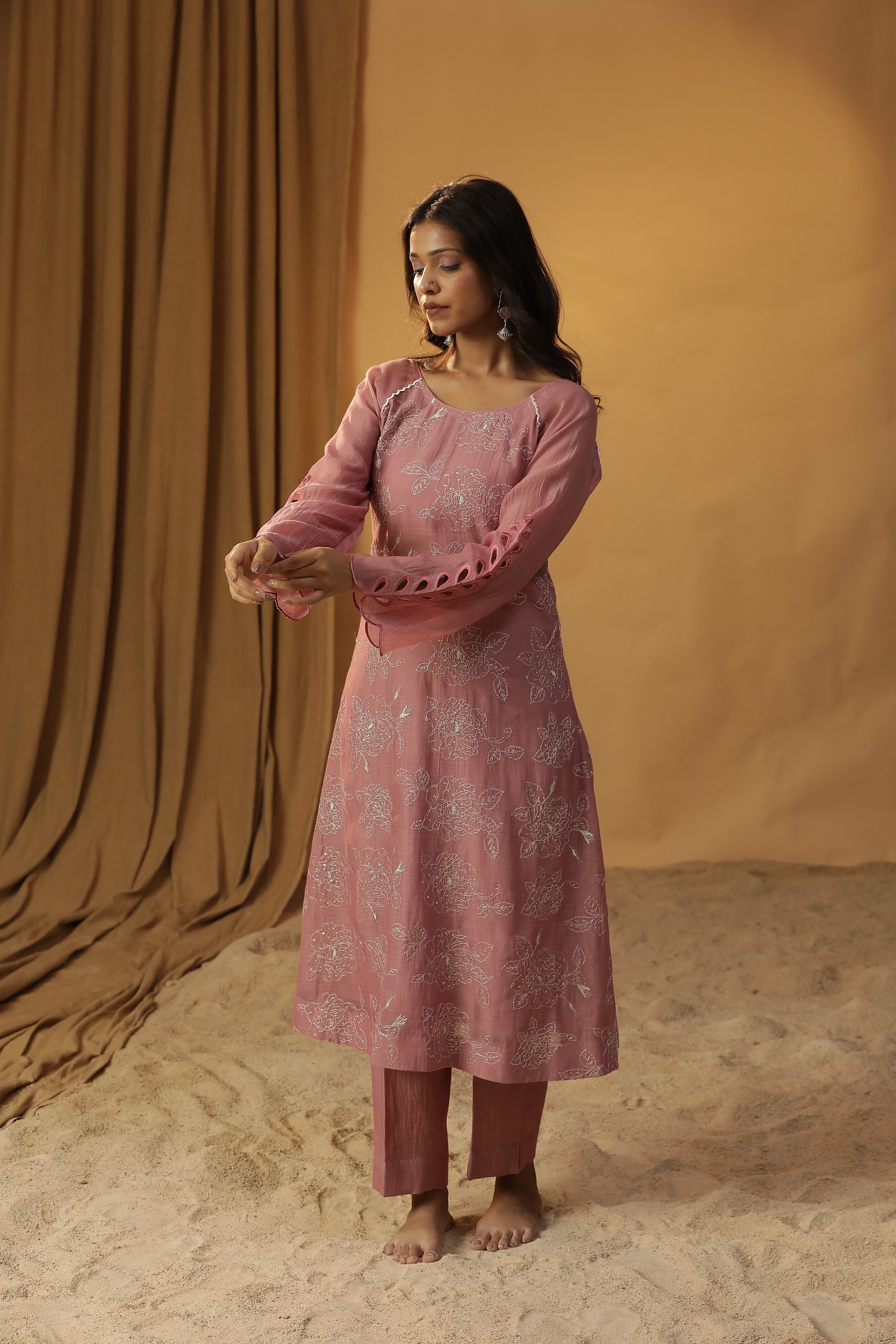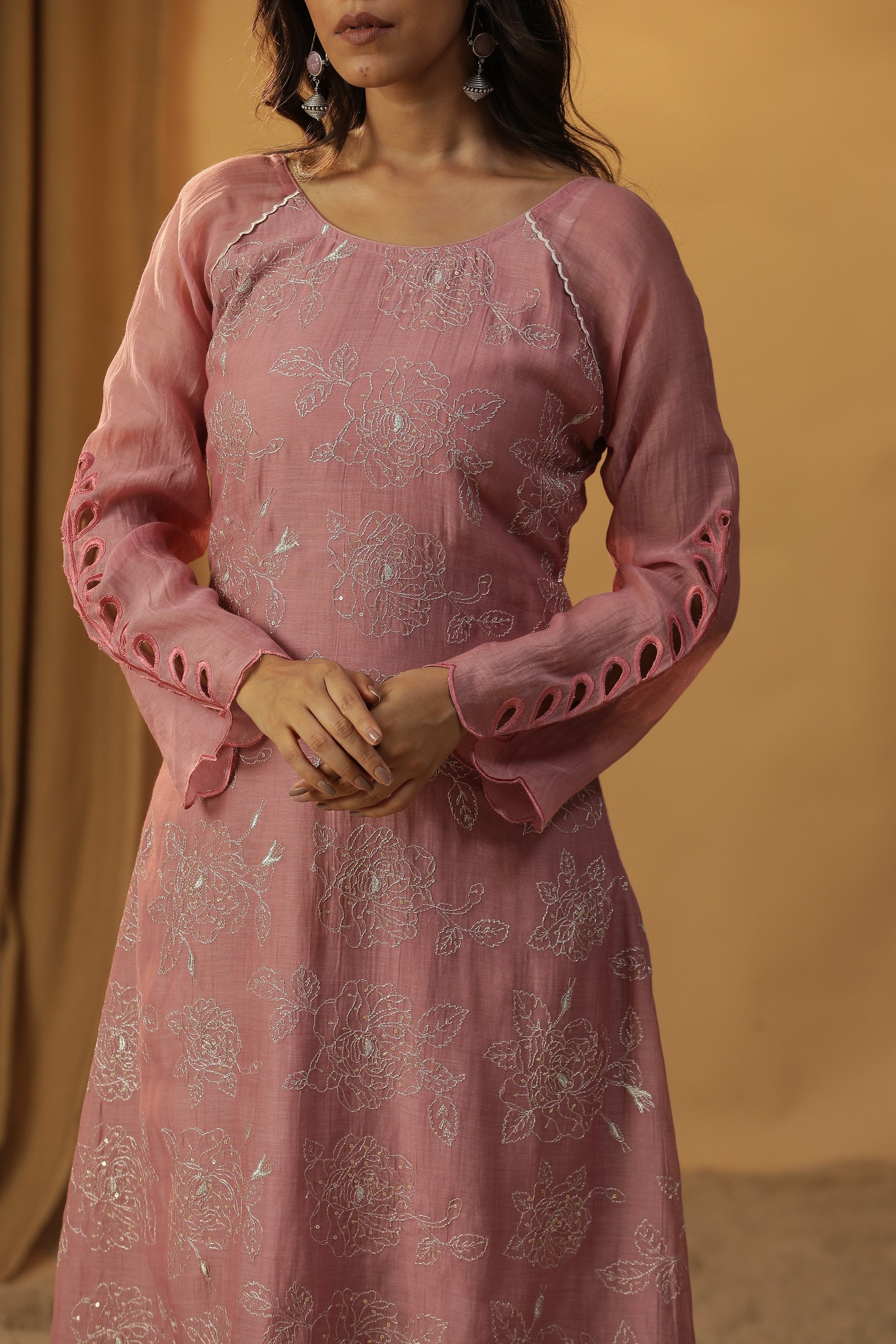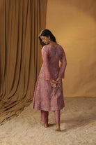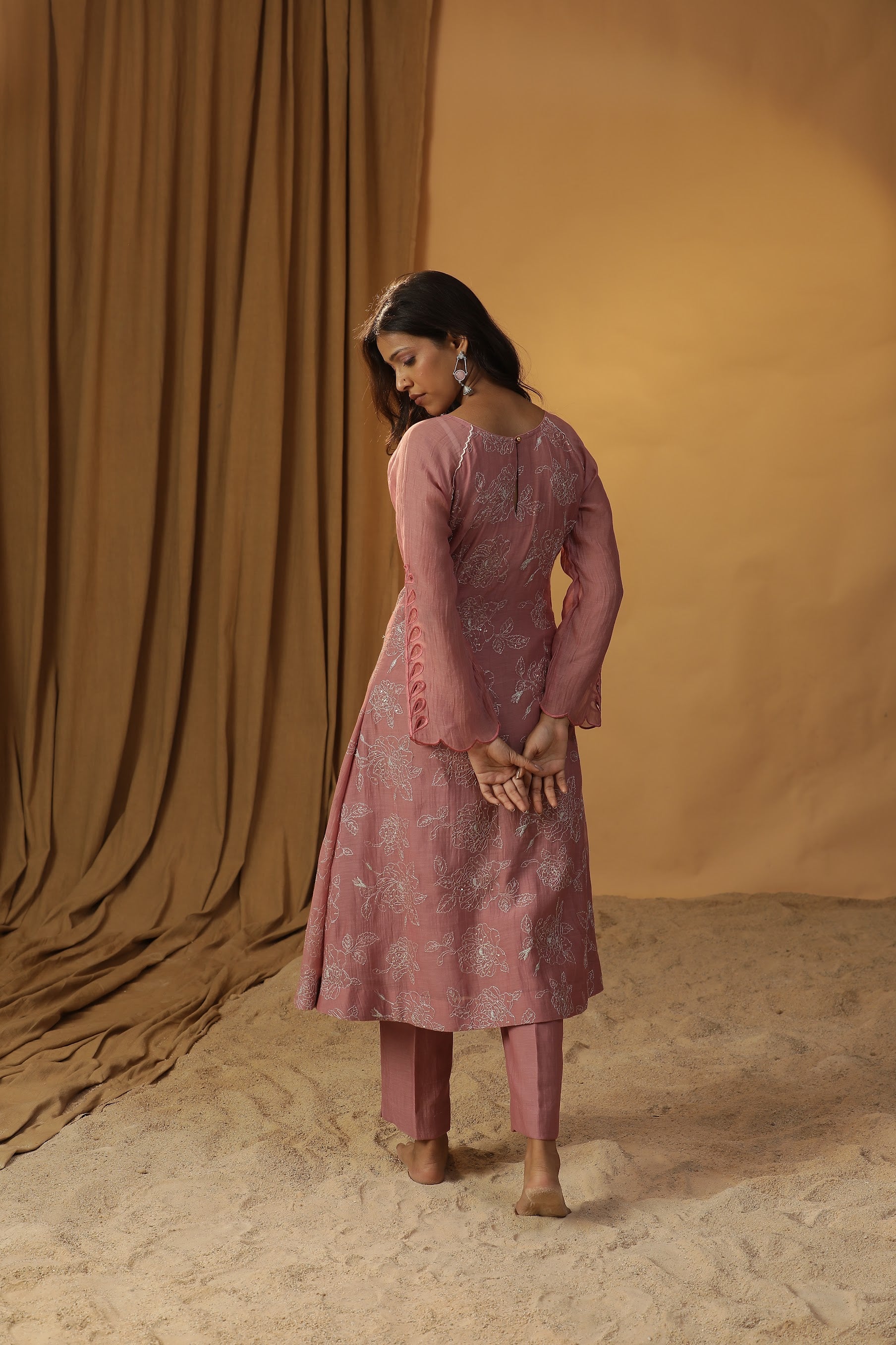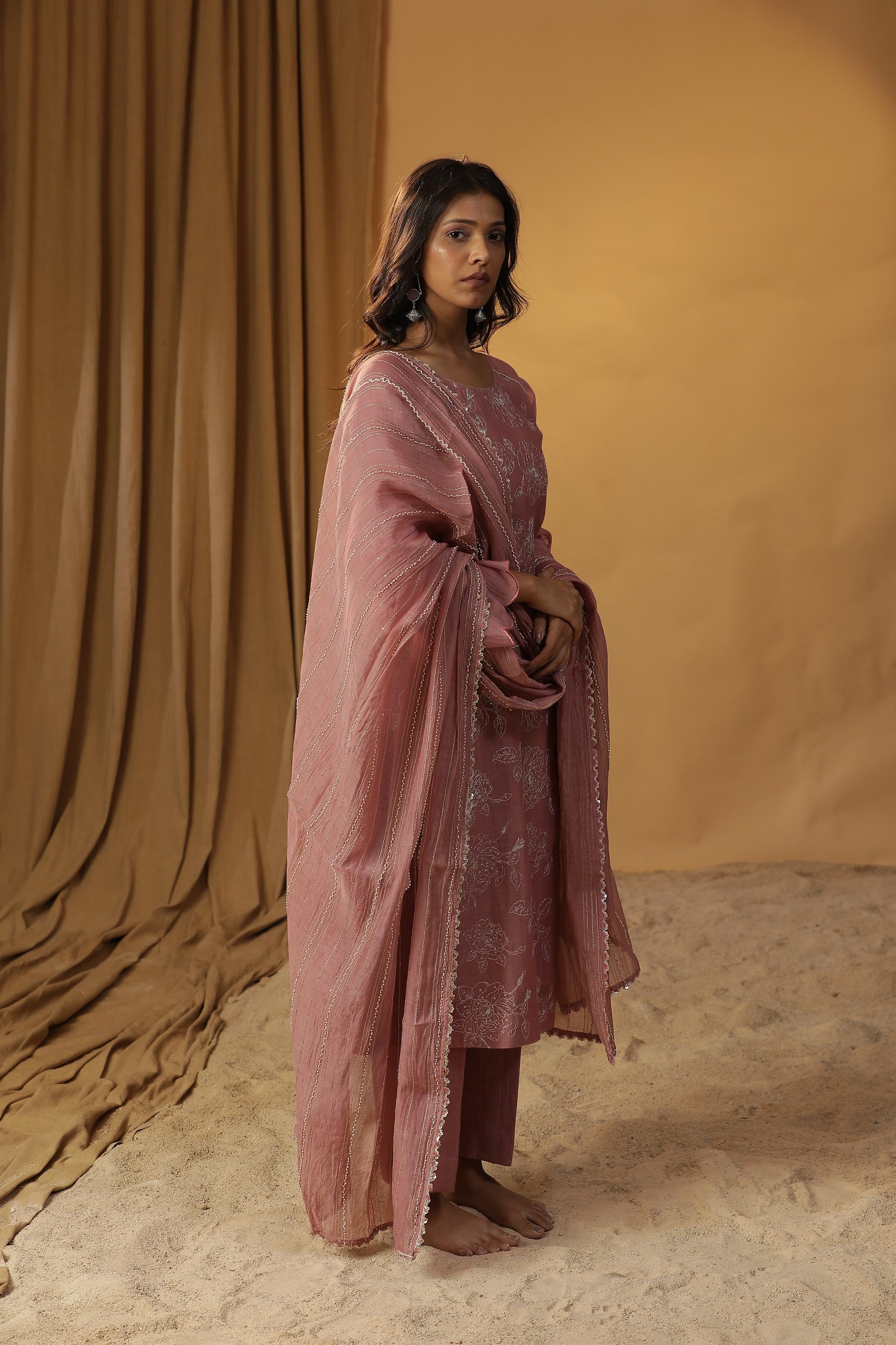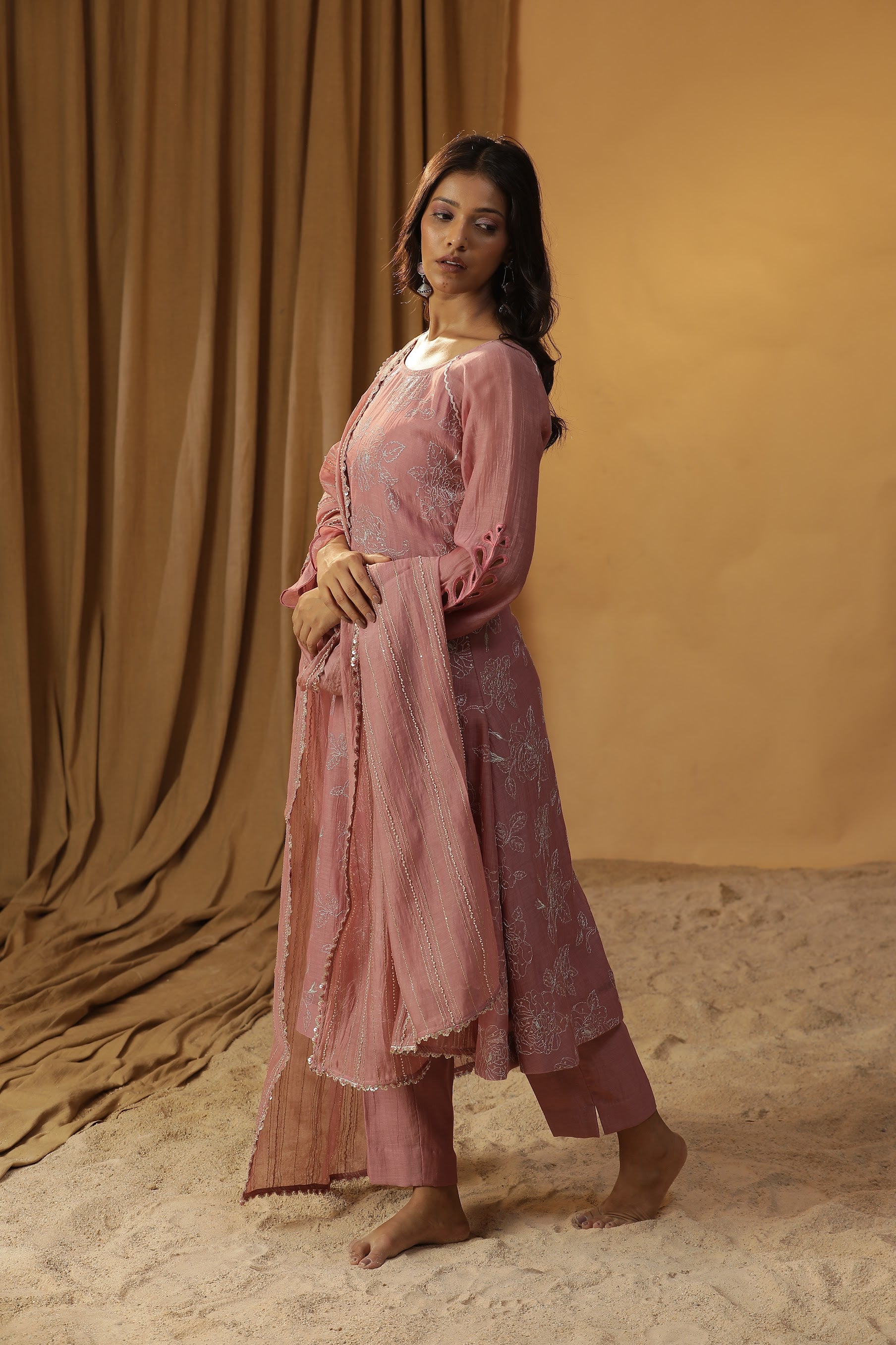 Description: Featuring our Pyaazi suit set with sequence and Resham work on kurta. Comes with pants and duptta .The suit in the image a pink suit embroidery. The suit has sparkly detailing, likely sequins or thread embroidery, adding a touch of elegance. The exact pattern or type of embroidery isn't super clear due to the image quality, but it looks like there's some floral or decorative detailing on the suit, especially visible on the bodice and possibly flowing down the suits.