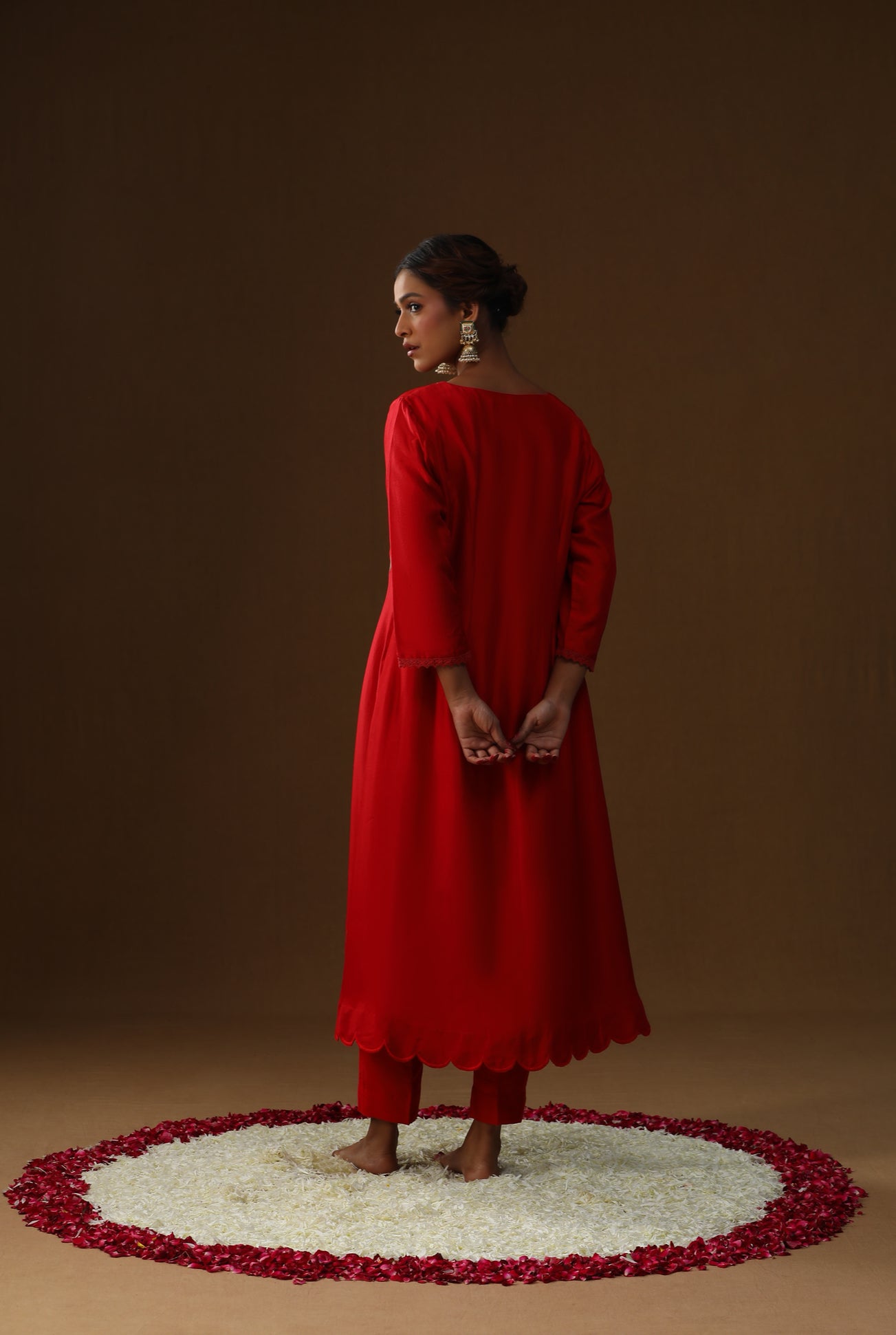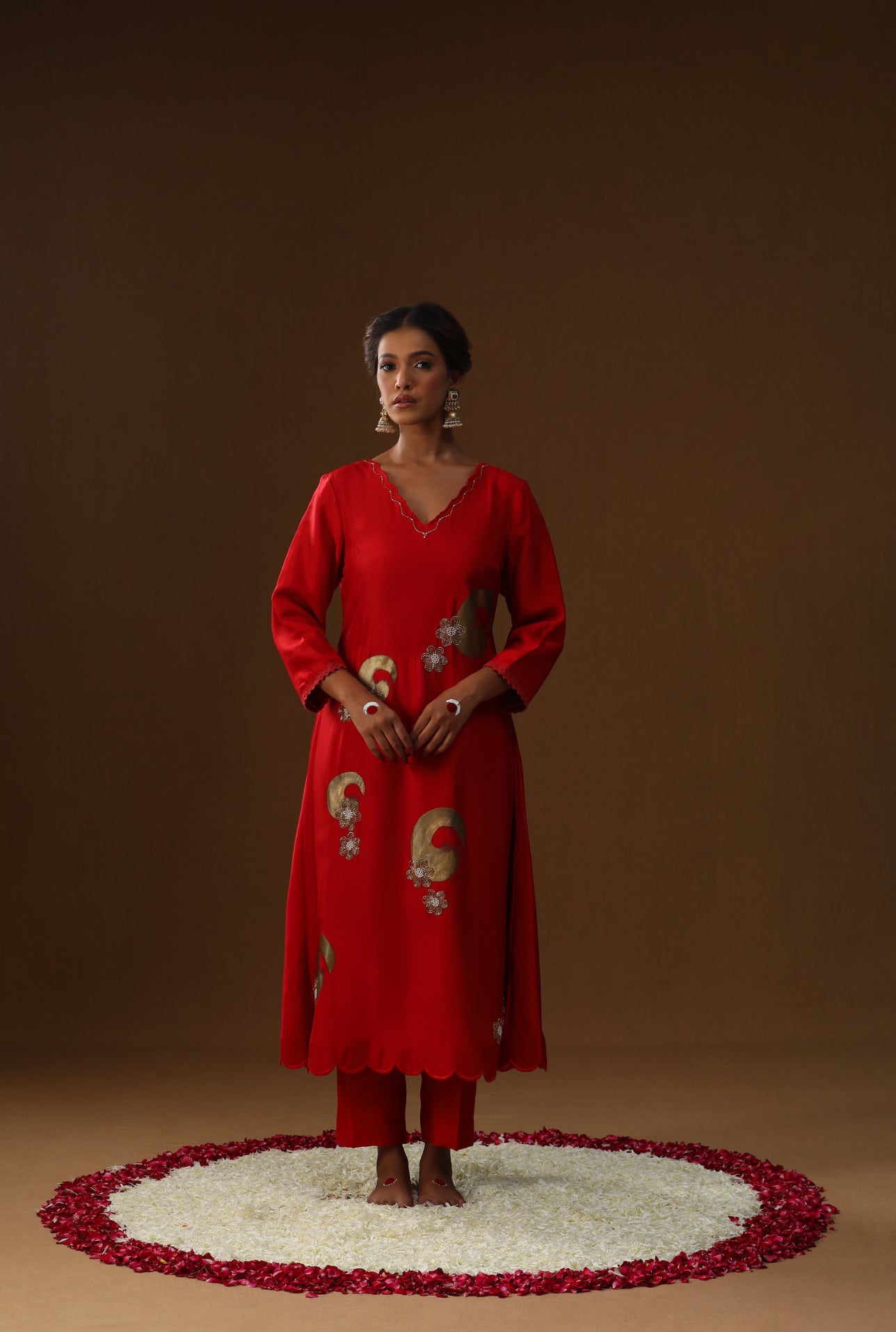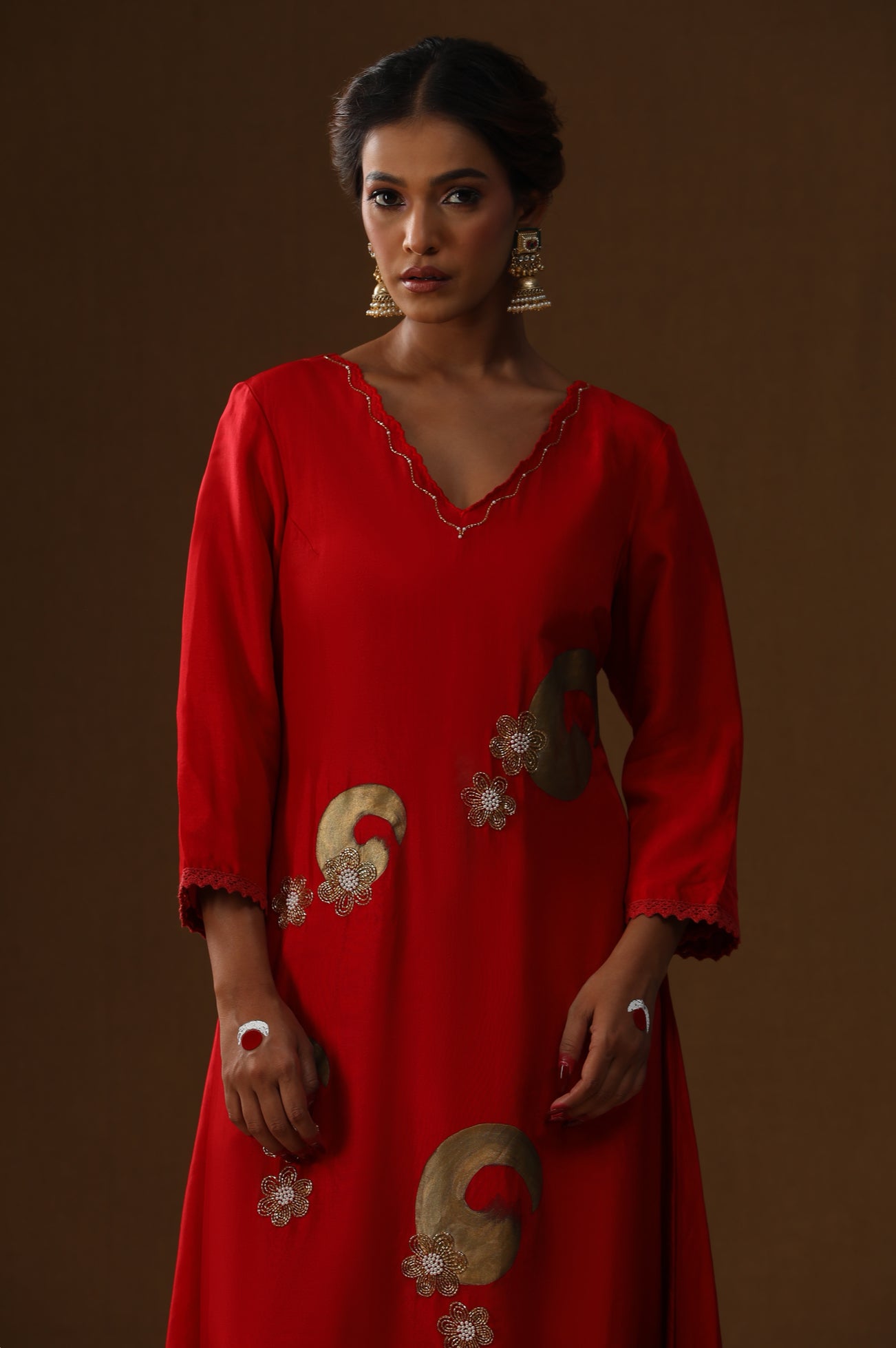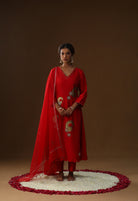 Description : A perfect blend of art and elegance, the Rooh Gulab Hand-Painted Suit Set from the Laal Ishq collection celebrates traditional craftsmanship. The uppada fabric is adorned with delicate hand-painted florals and intricate cutdana embroidery, creating a regal red ensemble that radiates feminine grace. Finished with a lightweight kota dupatta, it’s ideal for festive and celebratory occasions.