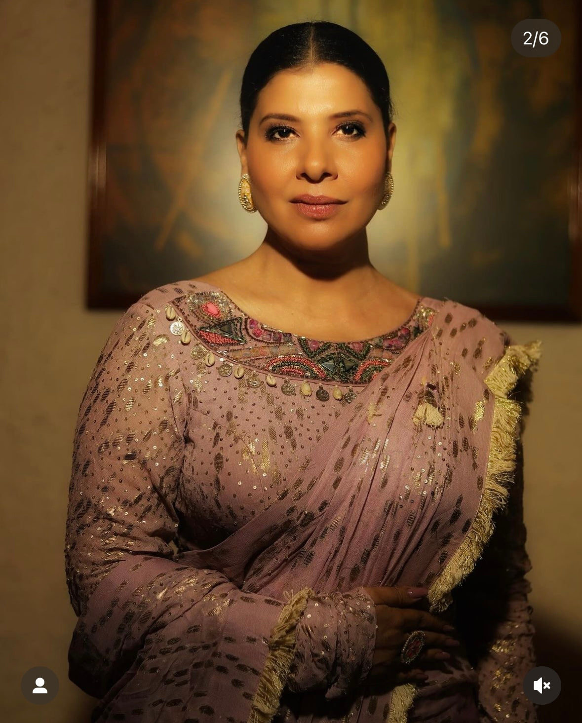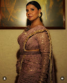 Description: Featuring our lilac pre-draped georgette saree. Comes with sleeve blouse with cut-dana work at neck(boat neck).The ready-to-wear saree in the image is a light lavender or lilac-colored outfit. It is a saree draped in a traditional style with a matching long-sleeved blouse. The saree seems to have some embroidery or detailing on the border and possibly on the blouse neckline. The saree contemporary take on traditional wear, suitable for formal or semi-formal occasions.