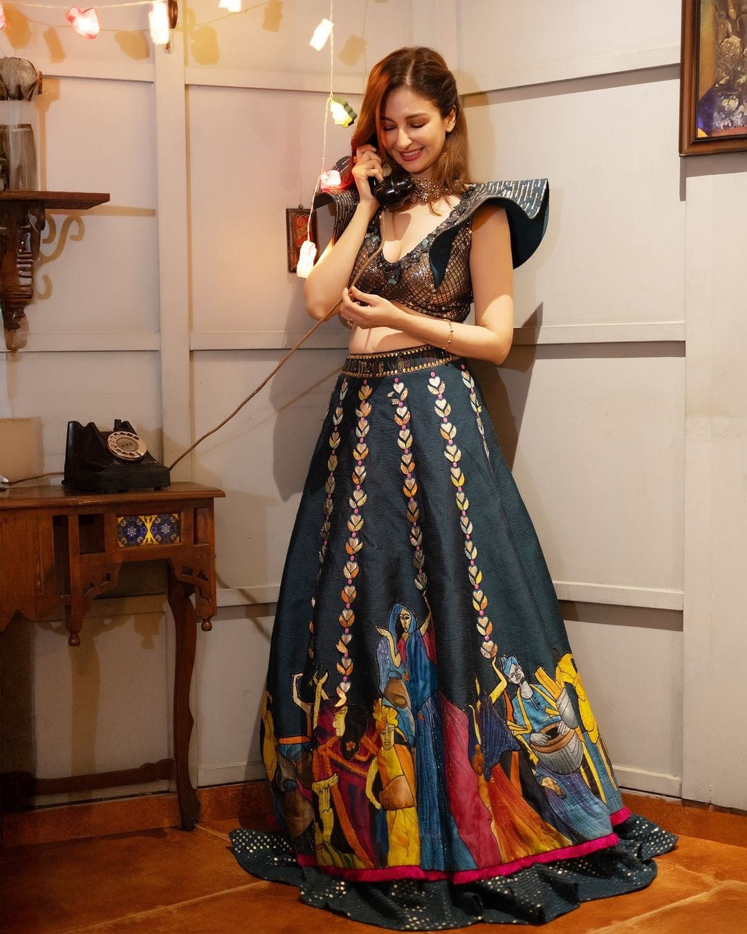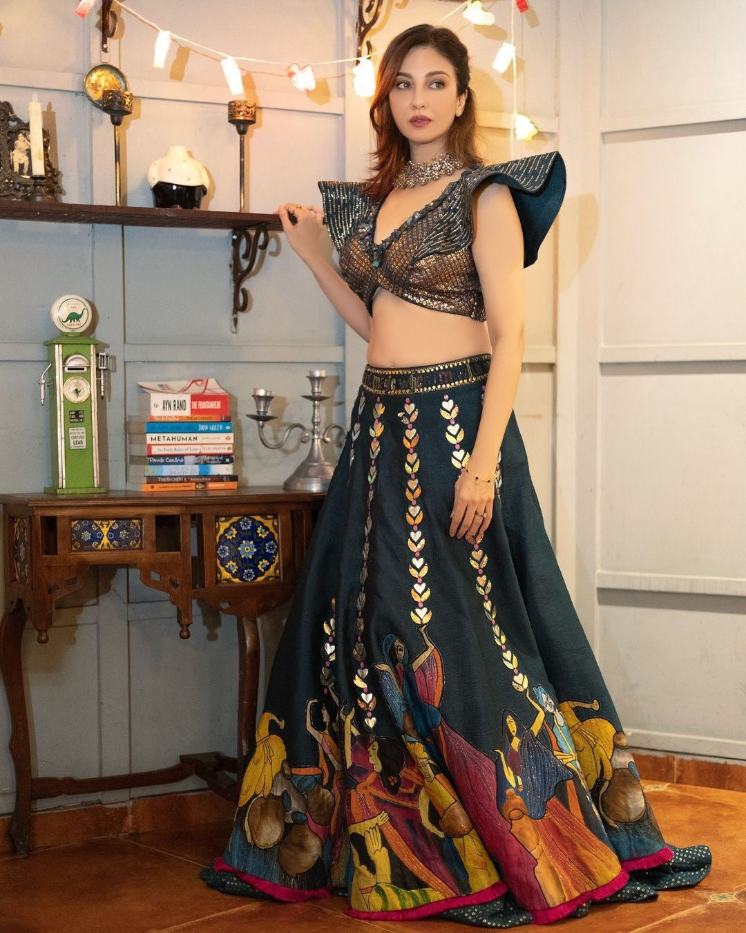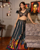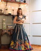 Description: Featuring our Teal Blue Modern Barat Lehenga.Comes with our signature handpainted skirt and sequined blouse.That lehenga is 🔥! It's a stunning piece with a hand-painted design. The lehenga itself is in shades of blue with a vibrant, colorful painting of people in traditional attire at the bottom. The blouse is a dark teal blue with some sparkly details and has those cool ruffled sleeves. There's a matching teal blue dupatta. The whole outfit looks super intricate and traditional with a modern twist.Â