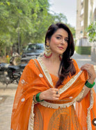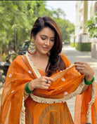 Description: Simple Kaul is wearing an orange gown dress with gold patterns printed on it. Featuring our burnt orange foil printed chanderi gown with dupatta set. comes with foil prints on all over the flares and sequence, shell, cut-dana work on neck deep sweetheart neck and sleeves(short) and a burnt orange organza dupatta. The dress has a fitted bodice with a V-neckline and short sleeves. The bodice and sleeves are embellished with gold embroidery or trim. The dress has a flared gown.