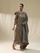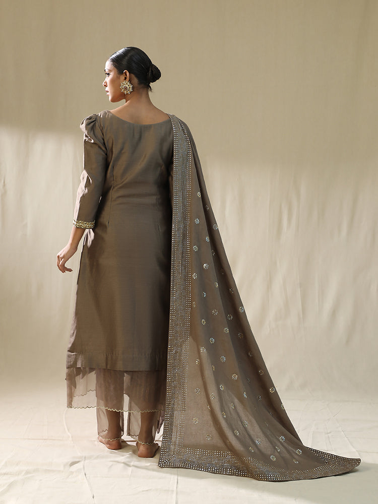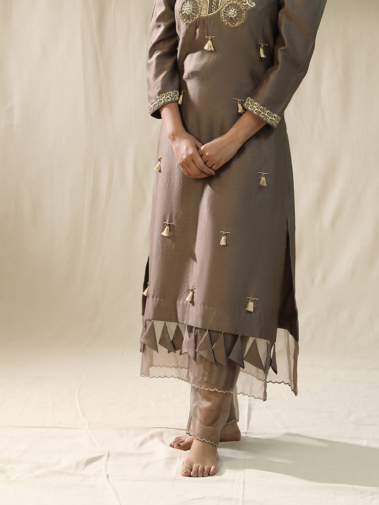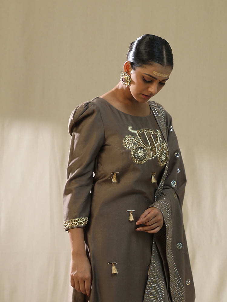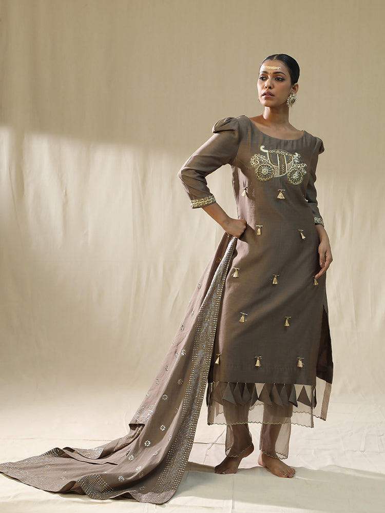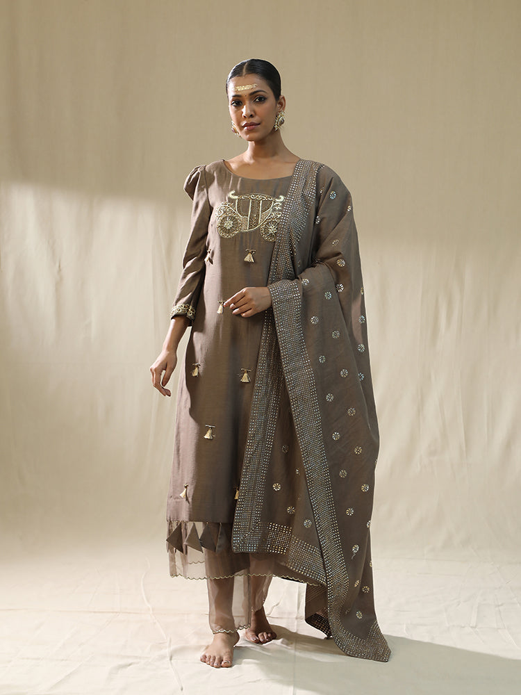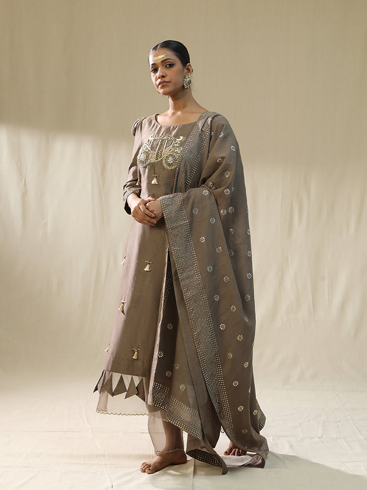 Description: The "Baggi Mocha Arpita Sulakshana Signature suit set" features a taupe-colored kurta with intricate embroidery, adorned with tassels, cutdana, sequence, and stones, showcasing a blend of traditional craftsmanship. The kurta is paired with a matching dupatta, embellished with thread work, patch work, and duppata patra, adding a touch of elegance to the overall ensemble.