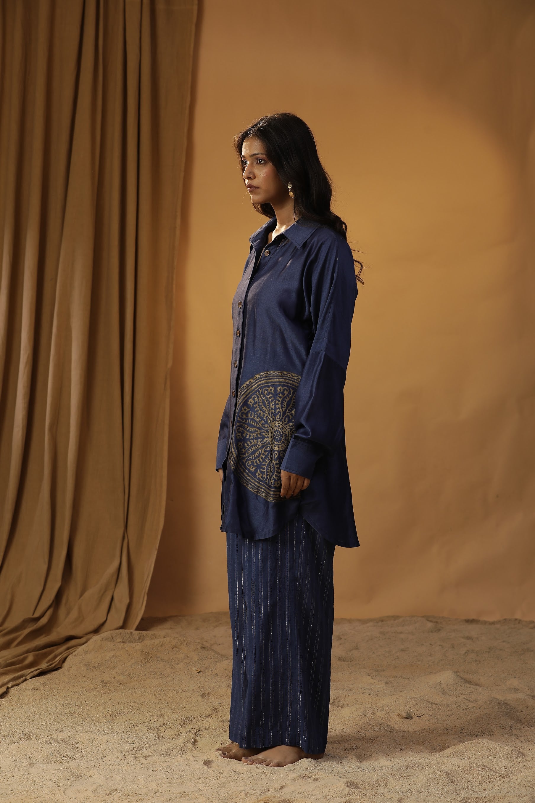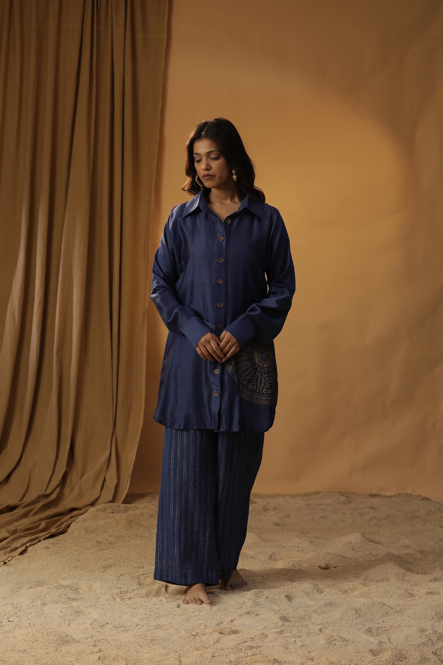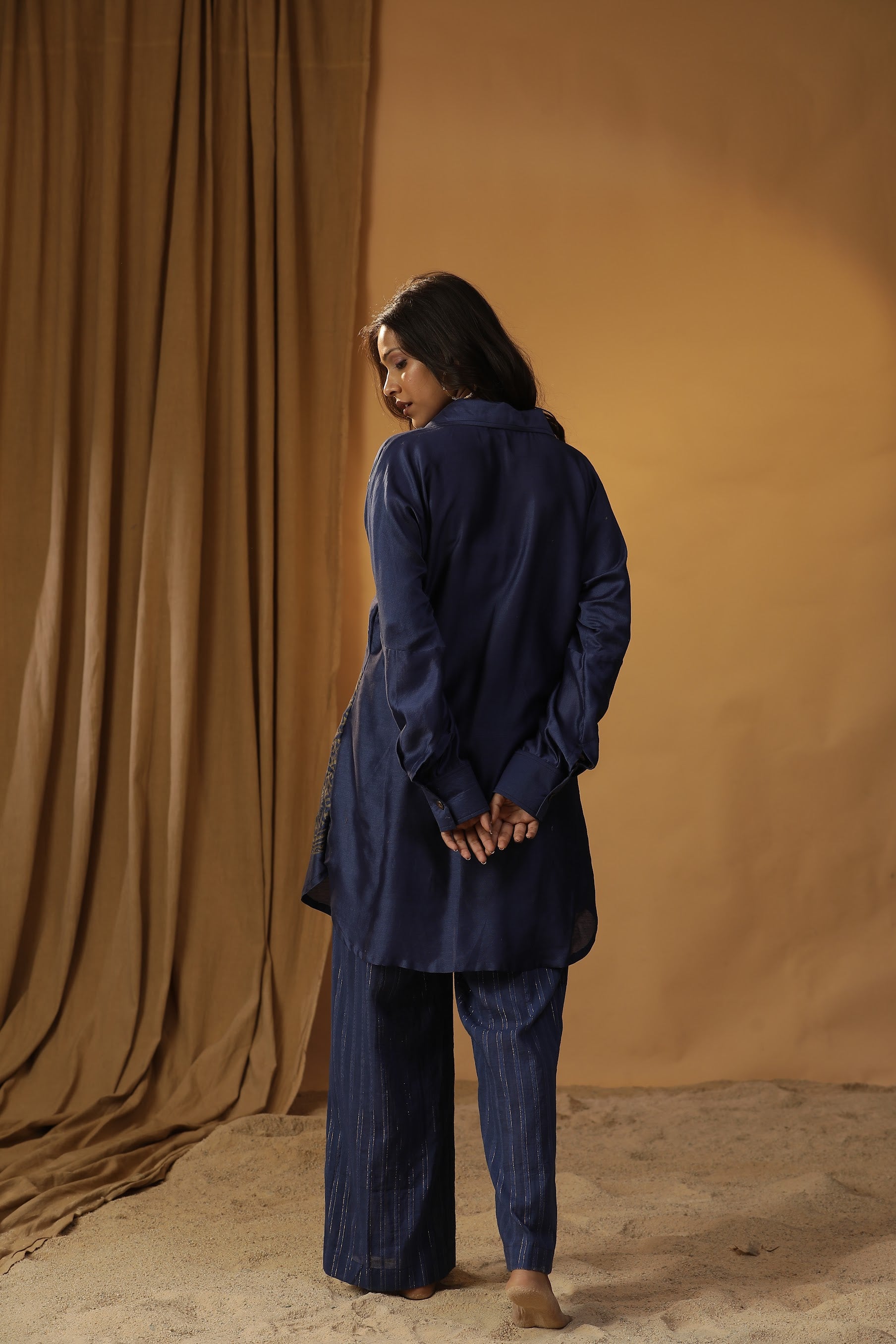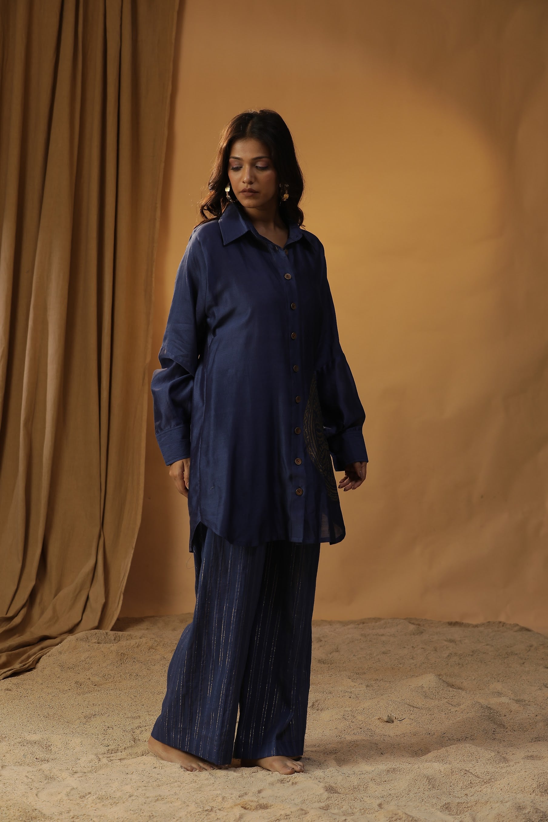 Description: The cord set is a stunning navy blue outfit. The top is a blue shirt with buttons down the front and a collar. It has long sleeves and a unique design element - a circular pattern on the bottom right side of the shirt. The pants are blue with a textured, pleated look and seem to match the top nicely. The overall color is navy blue, giving the outfit a cohesive and stylish look. The outfit is made from a blue fabric with a subtle texture, possibly denim or a denim-like material.